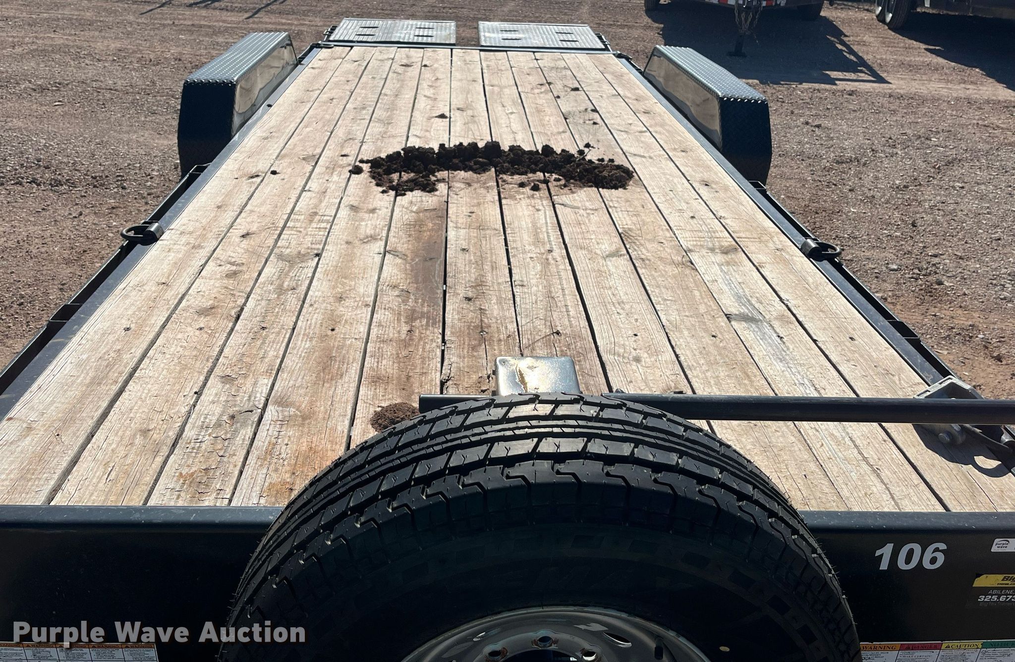 2020 Big Tex 14ET-20BK-MR equipment trailer. VIN: 16VEX2021L2018017, Unit #: 106. Dimensions Overall: 24' L x 104" W, Deck: 17' L x 83" W, Ramps: Manual Length: 3' 2". Features Deck type: Wood. Chassis Ball hitch: 2 5/16", Landing gear: Single, Suspension: Spring, Brakes: Electric, Axles: Tandem, GVWR: 12,500 lbs, GAWR: 7,000 lbs. Tires Steel wheels, Size: 235/80R16. Texas title. Title has a lien that will be released following the close of the auction. Title distribution may be delayed up to 30 days from verification of funds. J&N Utilities. 6849 East Highway 80. Abilene, TX 79601
