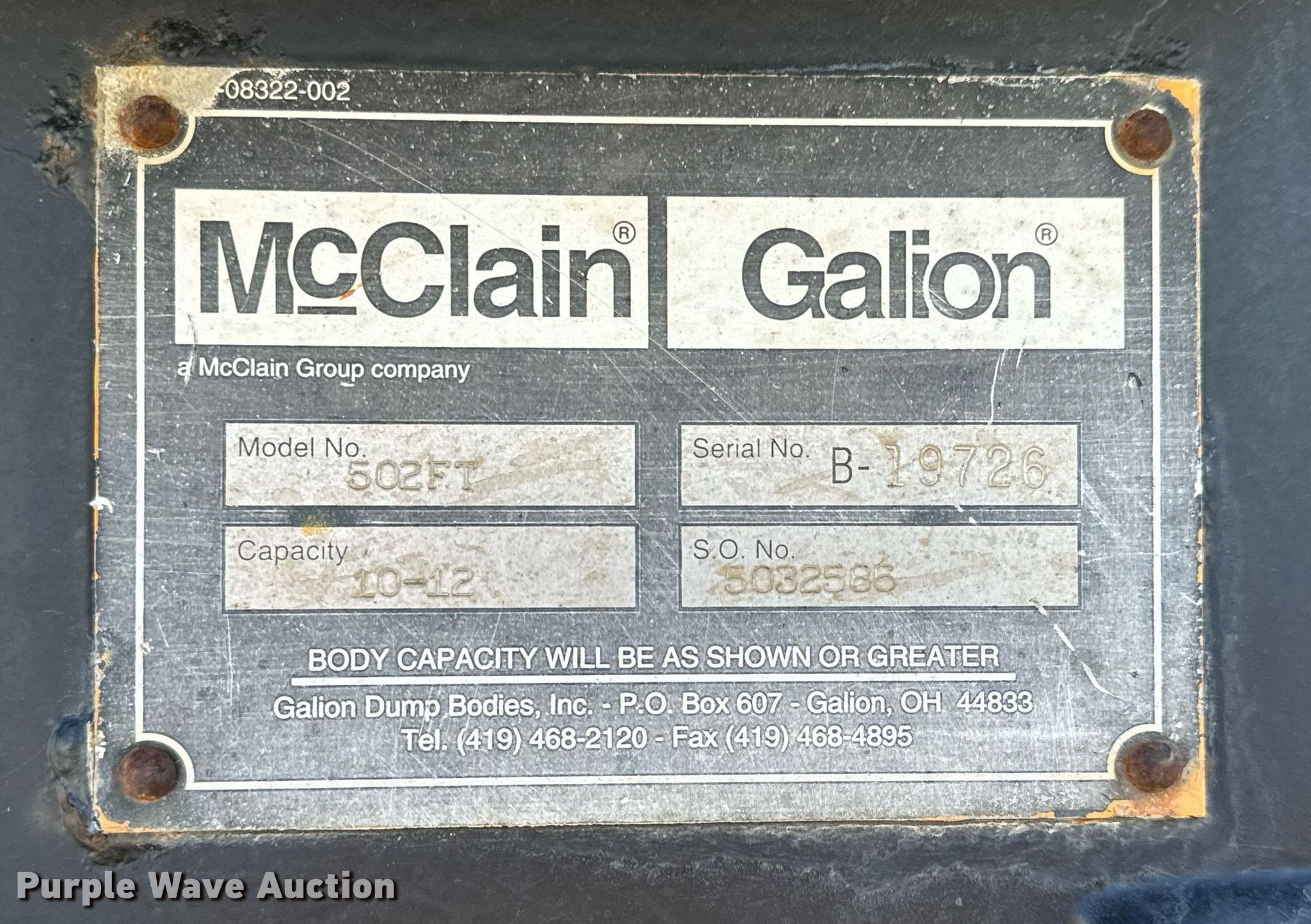 2002 International 2554 dump truck. Miles: 216,845 on odometer, VIN: 1HTGCADT62H523286. Engine International 530, Displacement: 8.7L, Cylinders: 6, Fuel type: Diesel, Engine brake. Transmission Allison, Automatic. Chassis Double frame, Axles: Tandem, Differential lock: Inter-axle, Suspension: Walking beam, Brakes: Air, PTO, GVWR: 56,000 lbs FAWR: 16,000 lbs, IAWR: 20,000 lbs, RAWR: 20,000 lbs. Interior AC, Heat, Heated mirrors, Power windows, Cruise control. Features Dump bed McClain Galion 502FT, 13' L x 96" W, Side height: 40", Bed type: Steel, Ram: Single , End gate: Air operated. Tires Front: 315/80R22.5, Rear: 11R22.5. Notes Non-operational roll tarp. Kansas title. Title distribution may be delayed up to 14 days from verification of funds. CD&H, Inc.. El Dorado, KS 67042