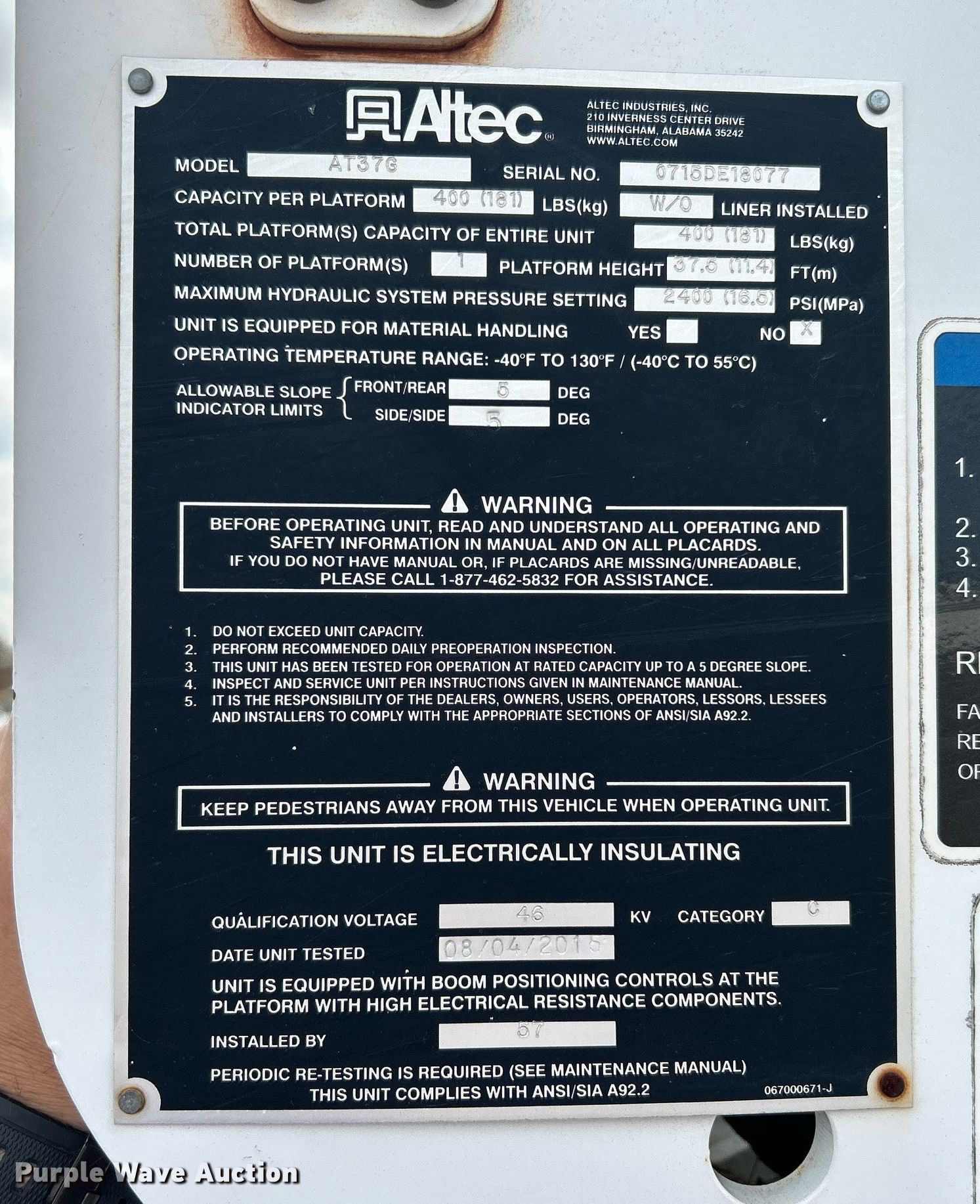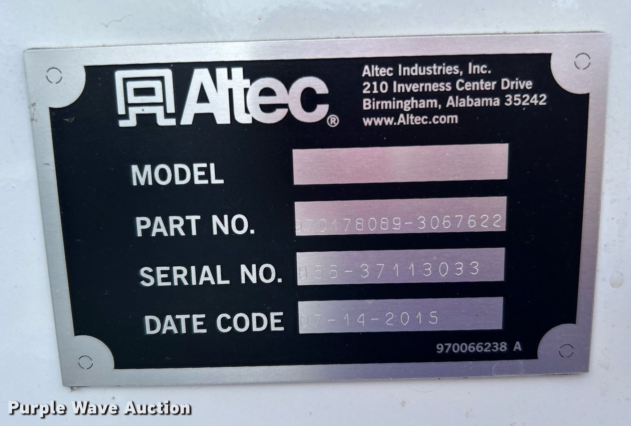 2015 Dodge Ram 5500HD bucket truck. Miles: 135,585 on odometer, VIN: 3C7WRNALXFG705949. Engine Cummins, Displacement: 6.7L, Cylinders: 6, Fuel type: Diesel. Transmission Automatic. Chassis Four wheel drive, Axles: Single, Suspension: Spring, Brakes: Hydraulic, PTO. Interior AC, Heat, Heated mirrors, Power windows, Power locks, Cruise control, Auxiliary controls. Features Bed Altec, Serial: 856-37113033, 9' L x 94" W, Boom 2015 Altec AT37G, Serial: 0715DE18077, Maximum lift capacity: 400 lbs, Maximum lift height: 37.6', Boom type: Telescopic, Boom controls Platform/ basket.. Tires Size: 225/70R19.5. Notes Dash warning indicator: Check engine. Oklahoma title. Title distribution may be delayed up to 14 days from verification of funds. 15107 North 137th East Avenue. Collinsville, OK 74021