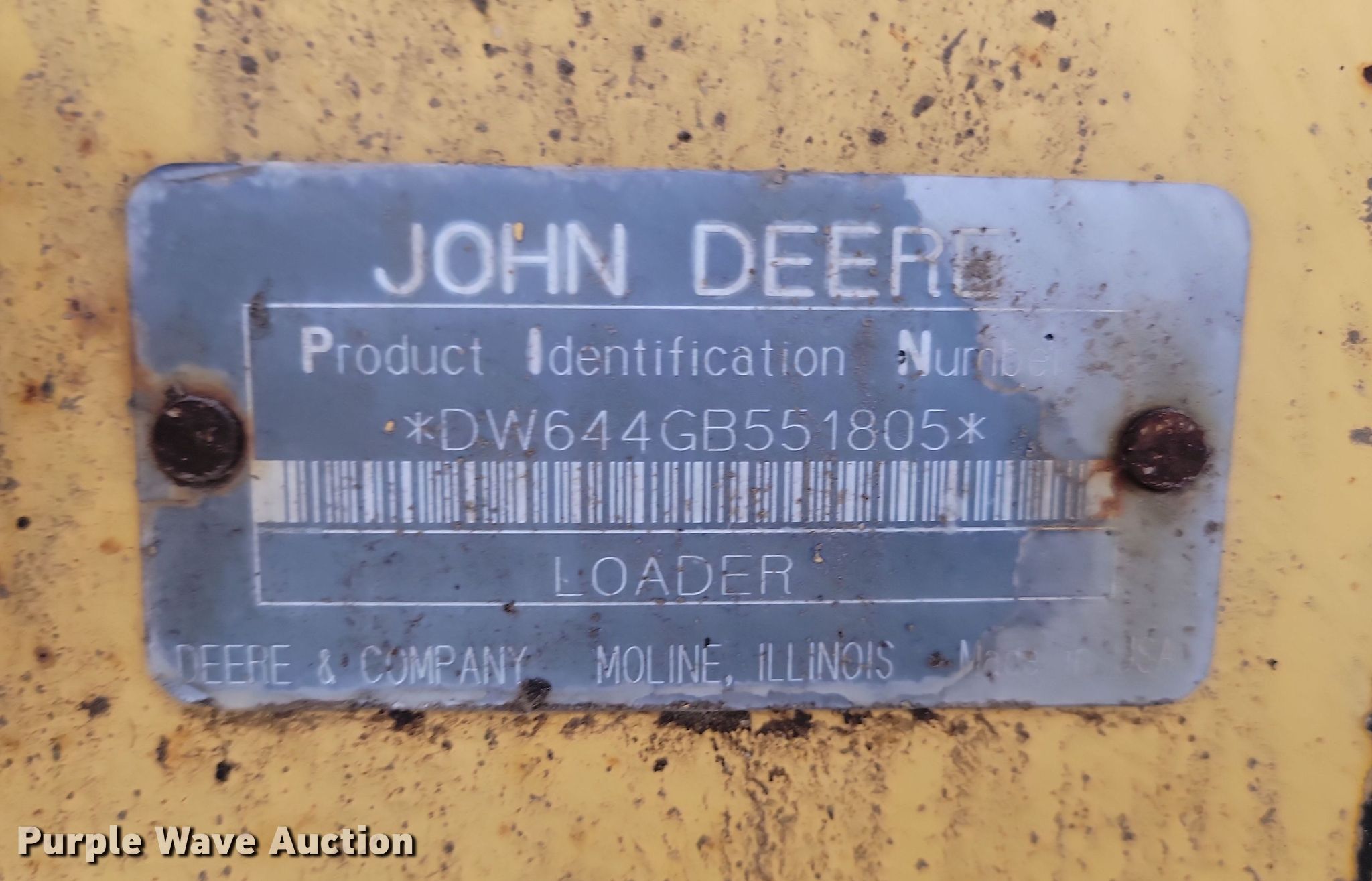 Purple Wave is selling a used Wheel Loader in Nebraska. This item is a 1995 John Deere 644G wheel loader with the following: Hours: 9,850 on meter, Serial: DW644GB551805