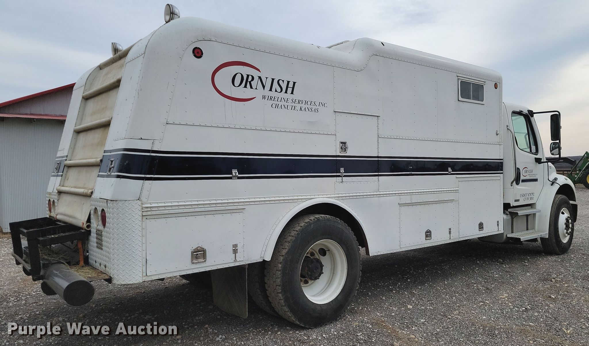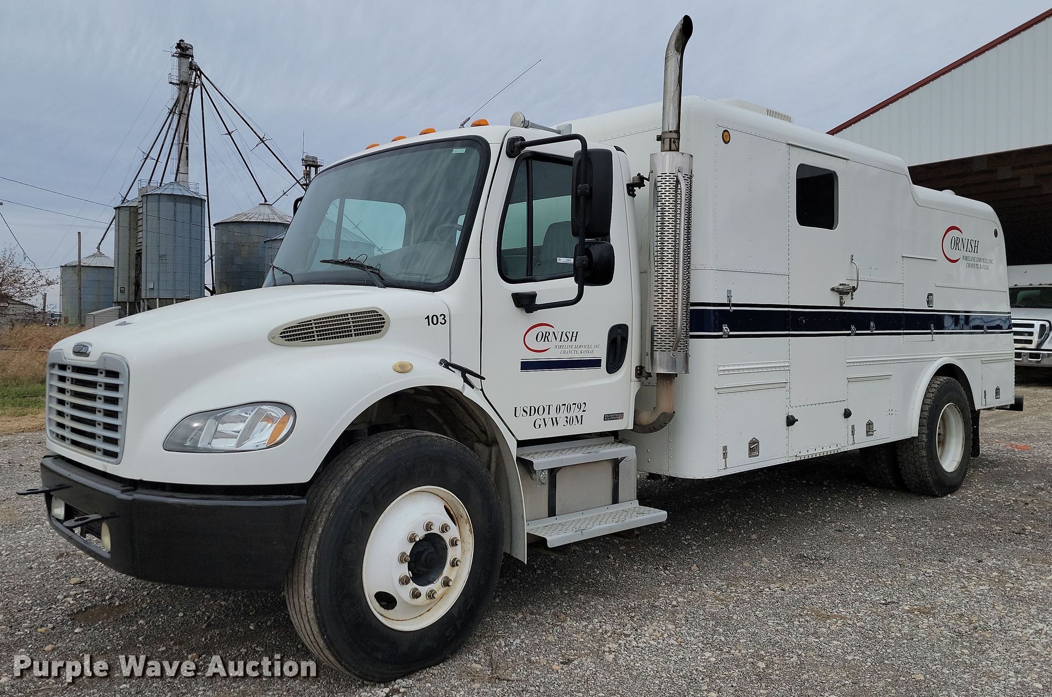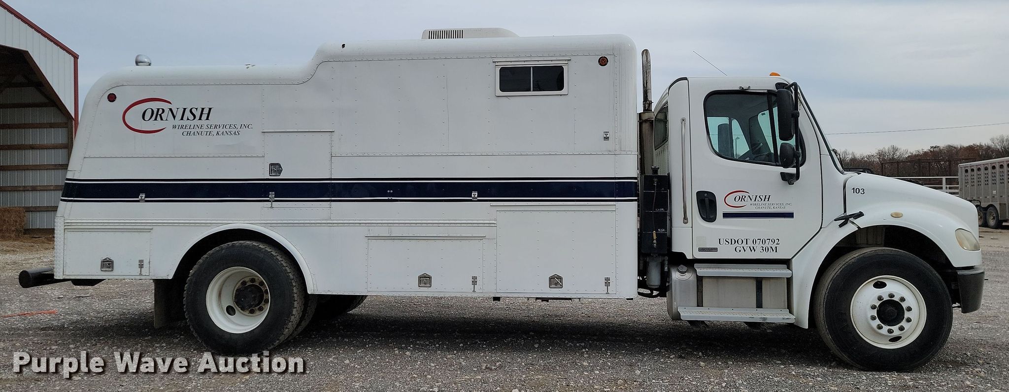 2004 Freightliner M106 pulling truck. Miles: 226,976 on odometer, Hours: 13,550 on meter, VIN: 1FVACXAK24HM20858, Unit #: 103. Engine Catepillar 3126, Serial: 3CPXH0442HBX, Displacement: 7.2L, Cylinders: 6, Fuel type: Diesel, HP: 330, kW: 246. Transmission Manual, Speed: 6. Chassis Axles: Single, Suspension: Spring, Brakes: Air, PTO, GVWR: 33,000 lbs.. Interior AC, heat. Features Bed dimensions: 19' L x 90" W, Monitors included, Coleman Mack AC unit, IMS engineered equipment products, HP laptop and software included, Approx. 10,000' of cable, Onboard generator Hours: 94. Tires Size: 11/R22.5. Kansas title. Title distribution may be delayed up to 14 days from verification of funds. Laymon Wireline. Yates Center, KS 66783