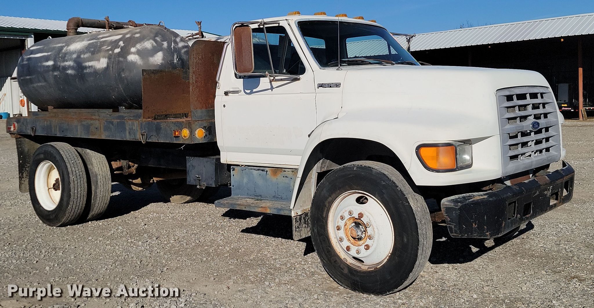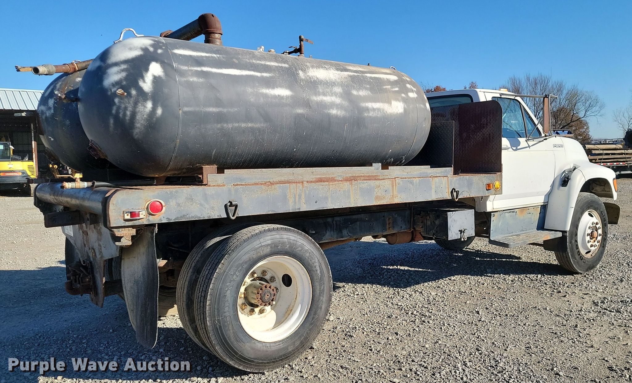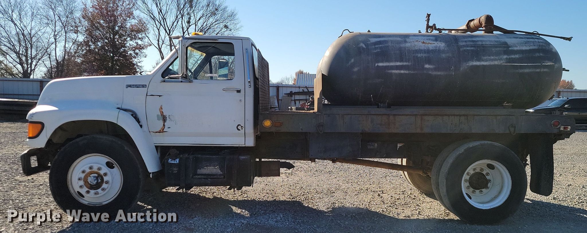 1998 Ford F700 flatbed truck. Miles: 164,045 on odometer, VIN: 1FDNF70J7WVA00381. Engine Ford, Displacement: 7.0L, Cylinders: 8, Fuel type: Gas. Transmission Automatic. Chassis Suspension: Spring over walking beam, Brakes: Air, GVWR: 26,000 lbs., Wheelbase: 255". Features Flatbed 12' L x 93" W, (2) pressurized water tanks Capacity: approx.1000 gallons. Tires Size: 10R22.5. Oklahoma title. Title distribution may be delayed up to 14 days from verification of funds. H&H Road Boring Company, LLC. 14191 East 580 Road. Inola, OK 74036