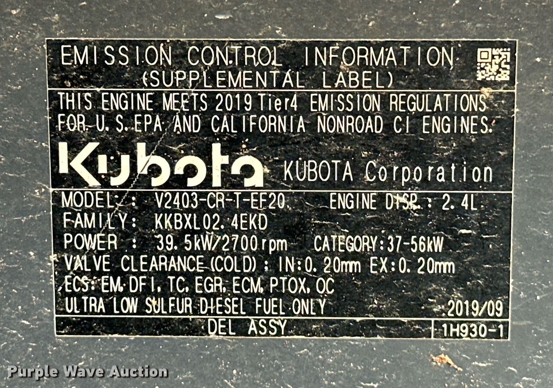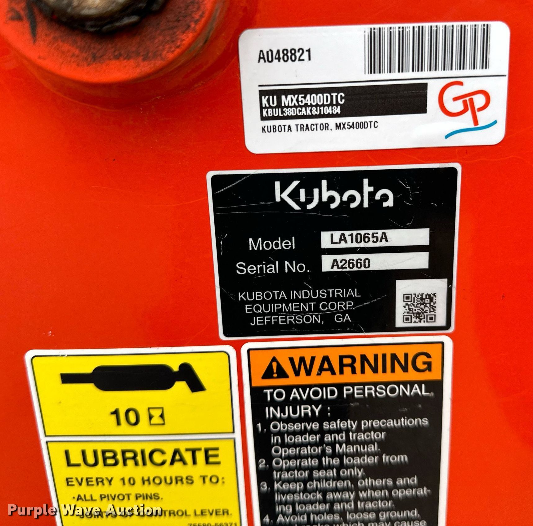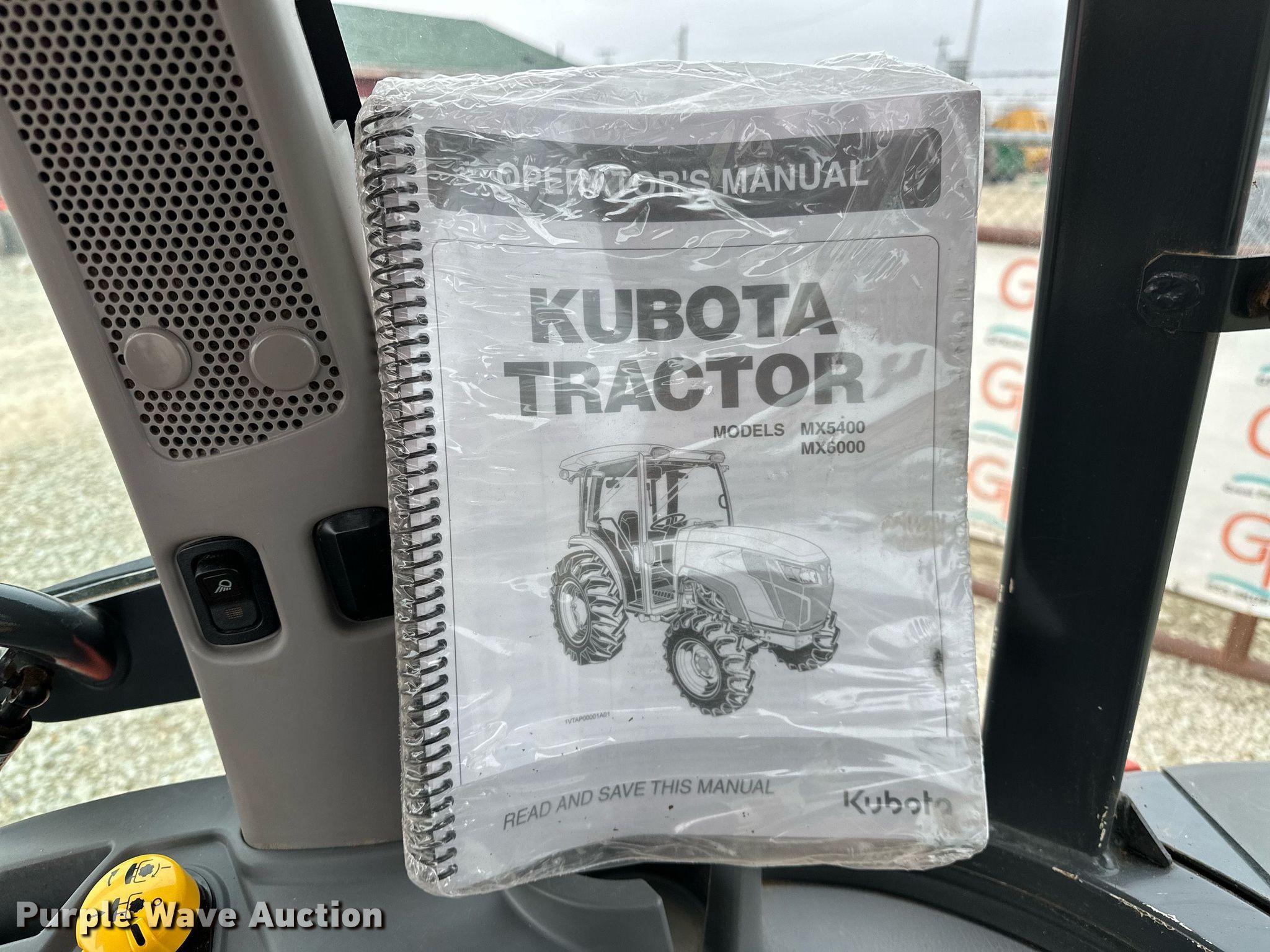 2019 Kubota MX5400DST MFWD tractor. Hours: 712 on meter, Serial: KBUL3BDCAK8J10484. Engine Kubota V2403-CR-T-EF20, Displacement: 2.4L, Cylinders: 4, Fuel type: Diesel. Transmission Synchro, 8F - 8R, Differential lock. Operators station AC, Heat. Features PTO: 540, Three point Top link, Loader Kubota LA1065, Controls: Joystick, Bucket Width: 72".. Tires Front: 9.5-16, Rear: 13.6-28. Notes Hail Damage. Great Plains Kubota - Open Inspection Dec. 27. 14280 U.S. 177. Shawnee, OK 74804