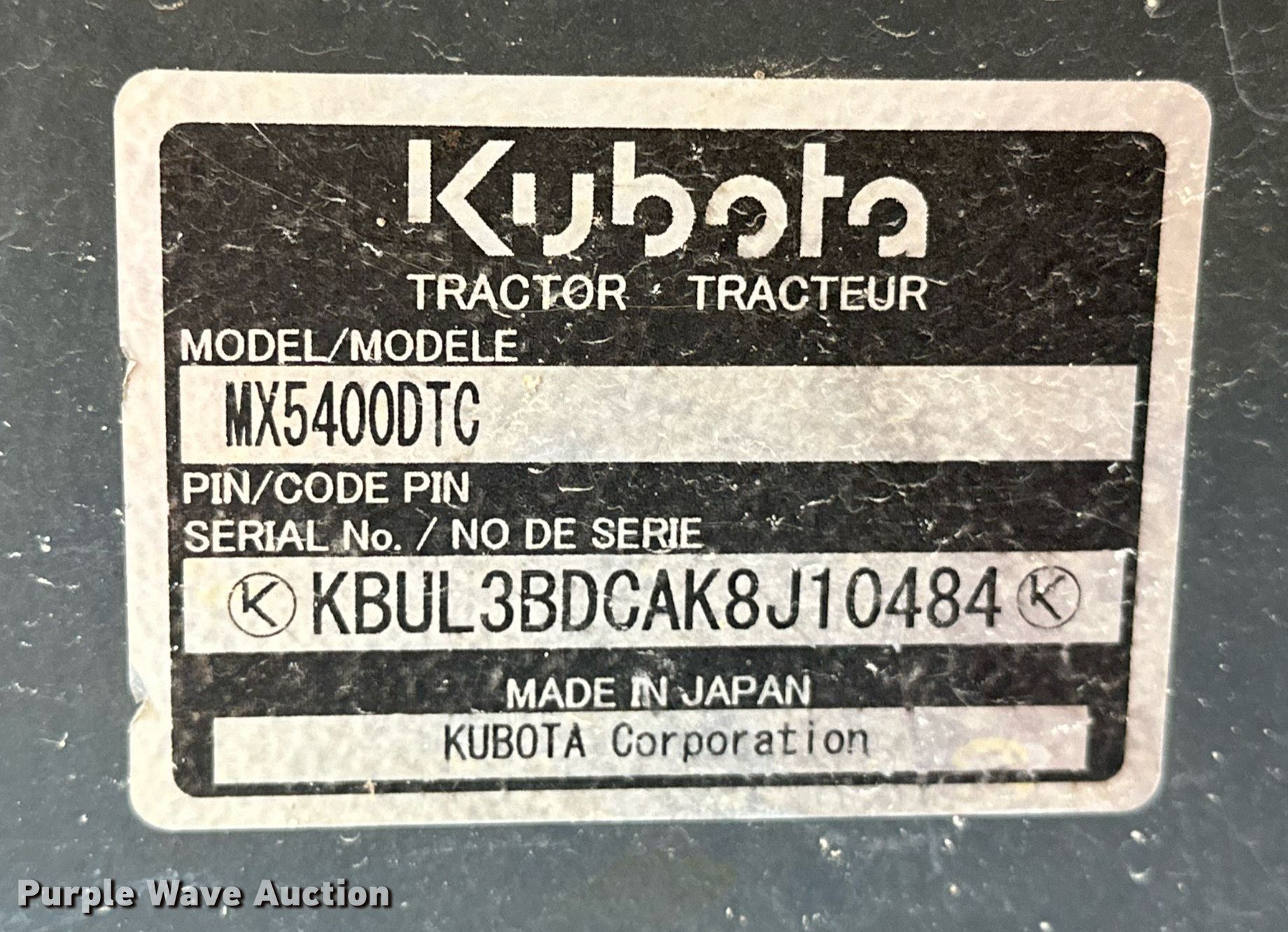 Purple Wave is selling a used Tractor in Oklahoma. This item is a 2019 Kubota MX5400DST MFWD tractor with the following: Hours: 712 on meter, Serial: KBUL3BDCAK8J10484