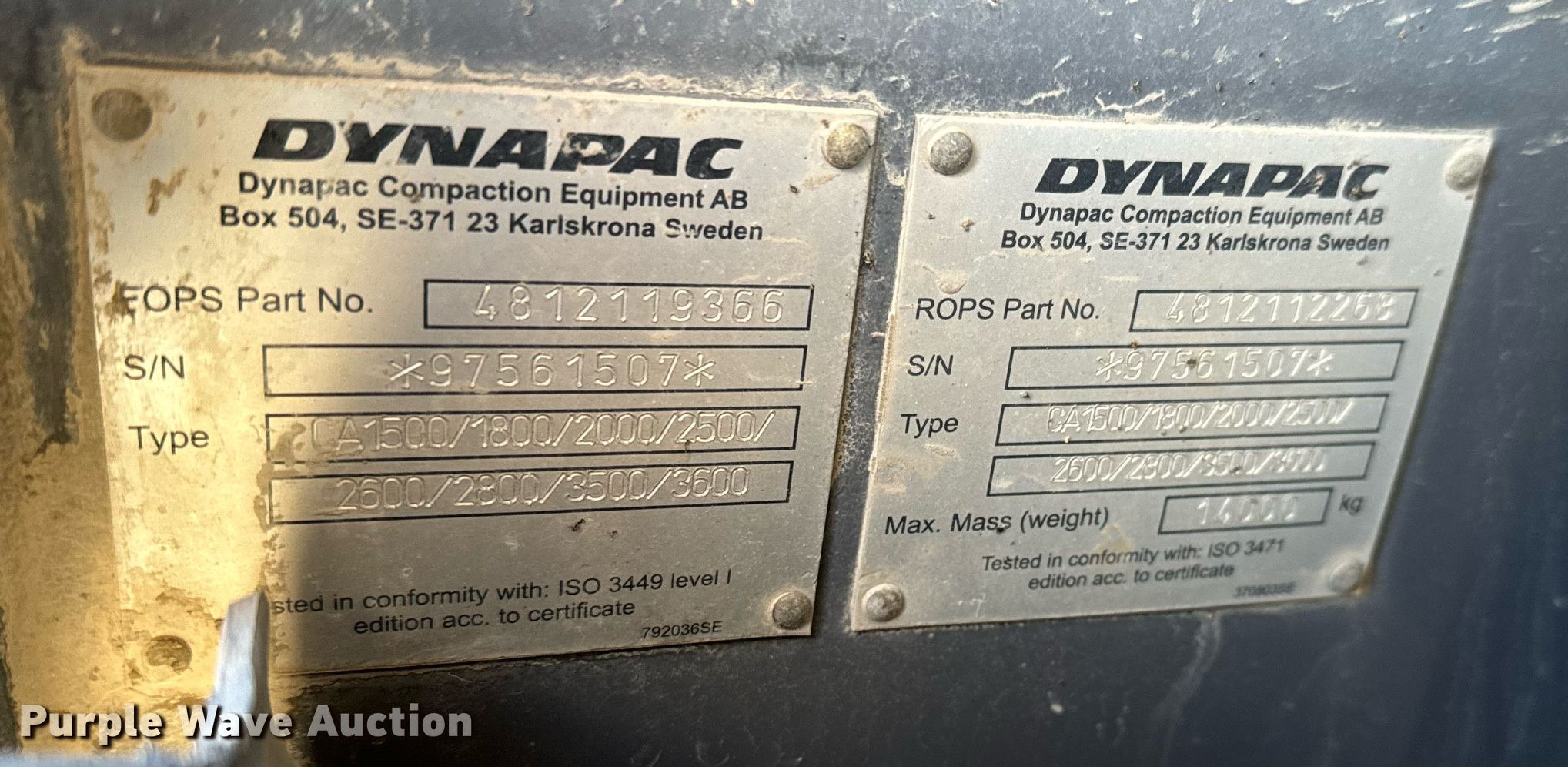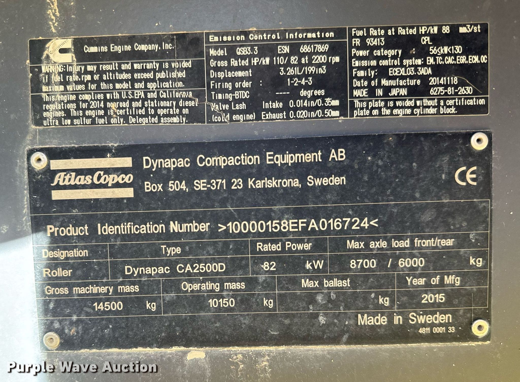 Purple Wave is selling a used Single Drum Roller Compactor in Kansas. This item is a 2015 Dynapac CA2500D single drum vibratory roller with the following: Hours: 1,506 on meter, Serial: 10000158EFA016724