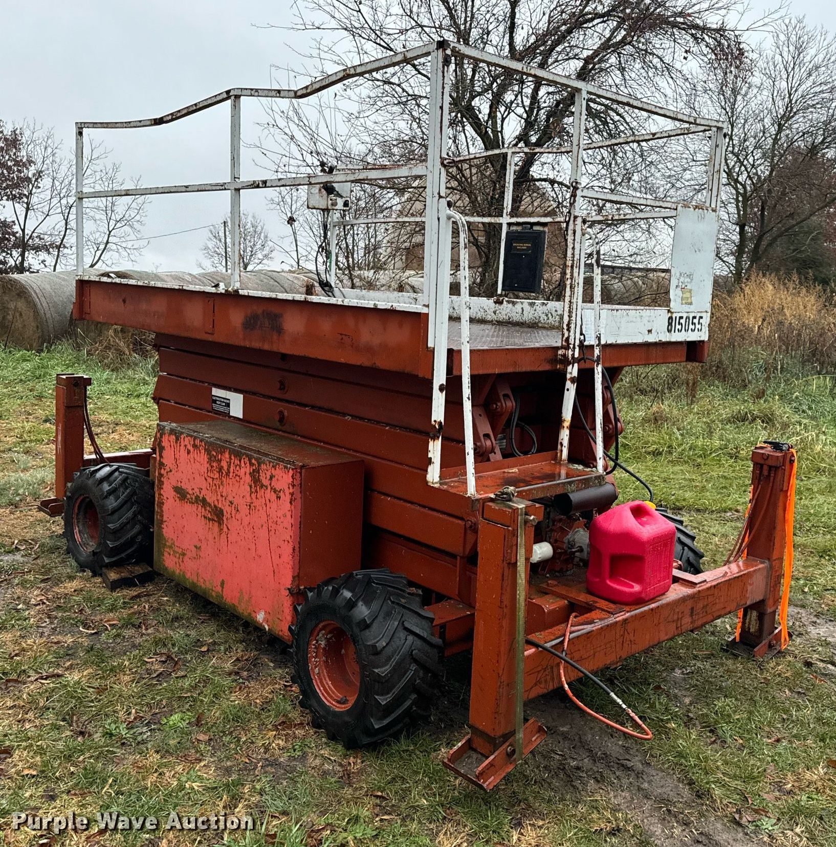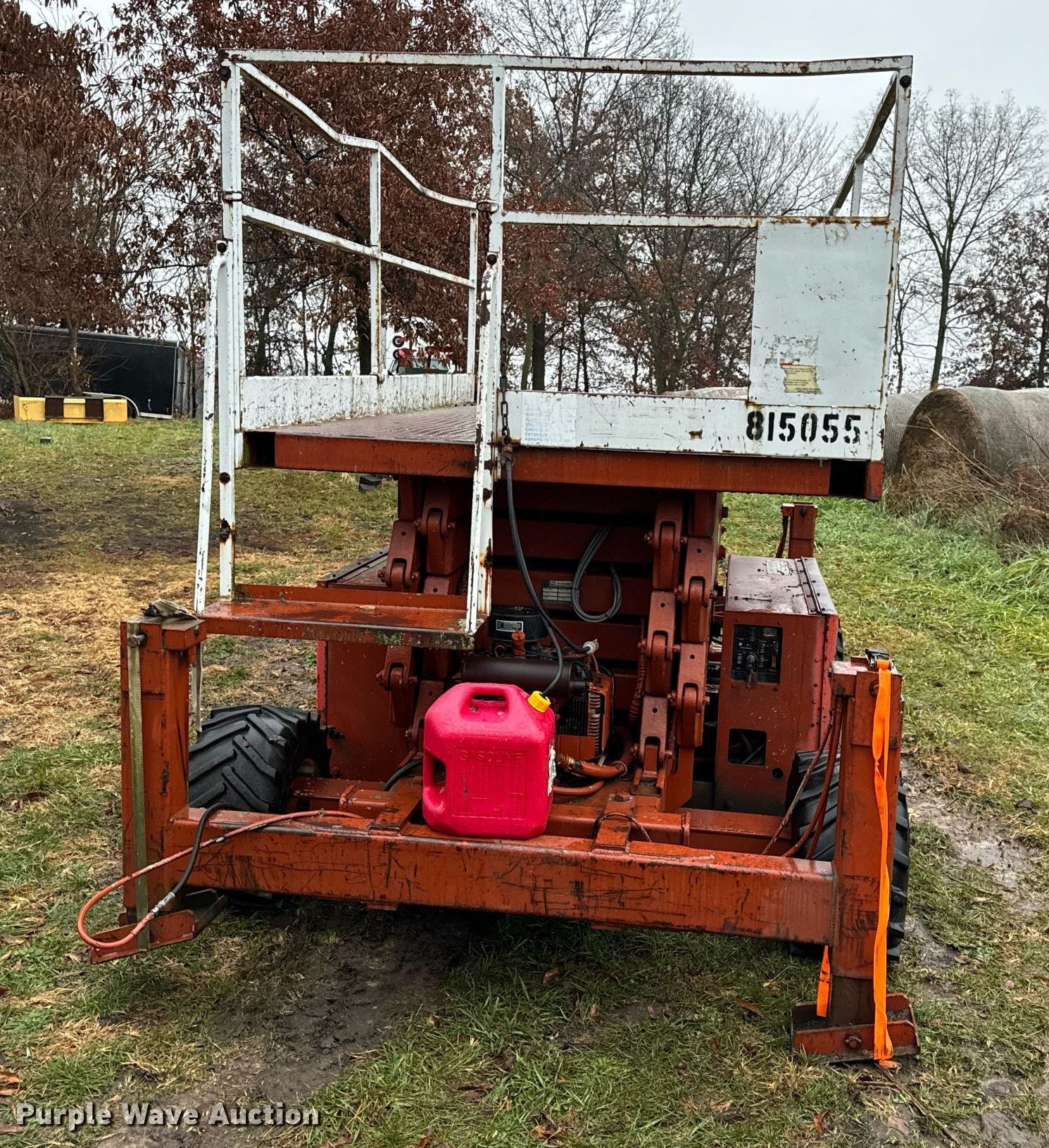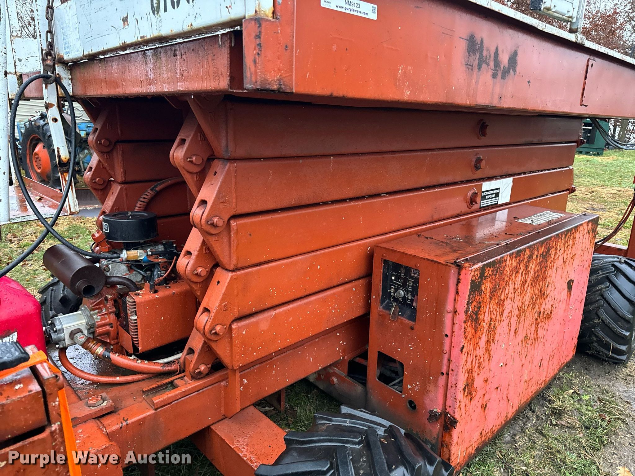Economy SPL4084-4A-G scissor lift. Hours: 3,755 on meter, Serial: KK78082. Engine Cylinders: 2, Fuel type: Gas. Features Rough terrain, Maximum lift capacity: 1,000 lbs, Maximum lift height: 40', Hydraulic outriggers, Platform: 120" L x 72" W, Controls: Platform. Tires Tire size: 26X12.00-12, Foam filled. Notes Electrical issues, Non-operational fuel pump, Main fuel tank disconnected , Non-operational rear outriggers, Hydraulic issues, platform leaks down, Damaged tires, Non-operational unit. Buyer is responsible for all aspects of load-out and removal. DBA Setco. 57539 Corticelli Road. Russellville, MO 65074