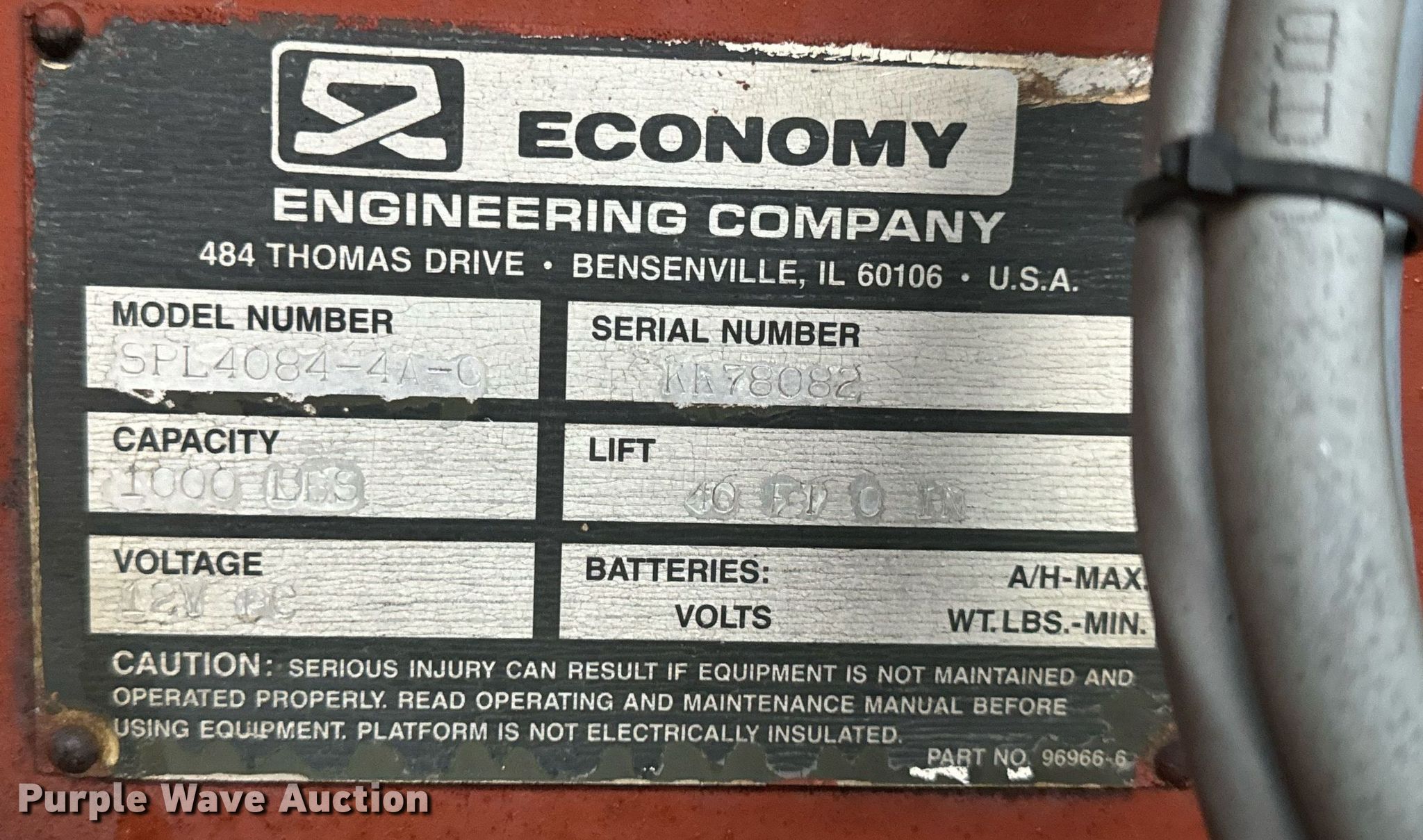 Purple Wave is selling a used Scissor or Vertical Lift in Missouri. This item is a Economy SPL4084-4A-G scissor lift with the following: Hours: 3,755 on meter, Serial: KK78082