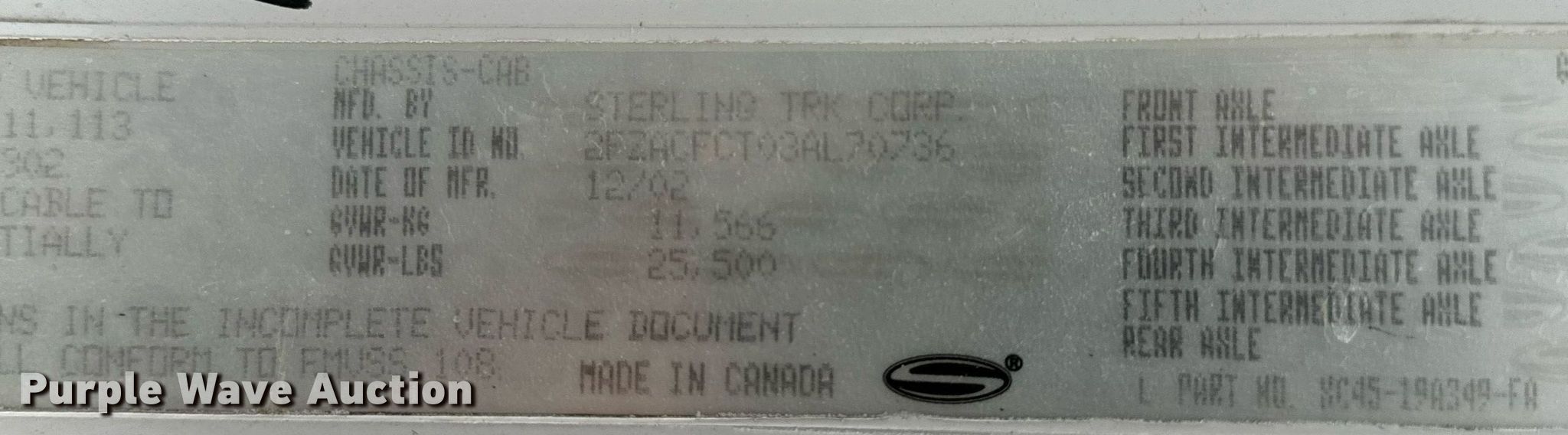 2003 Sterling Acterra dump truck. Miles: 396,190 on odometer, VIN: 2FZACFCT03AL70736. Engine Mercedes-Benz MBE 900, Serial: 0906291888, Displacement: 6.4L, Cylinders: 6, Fuel type: Diesel. Transmission Automatic. Chassis Axles: Single, Suspension: Spring, Brakes: Hydraulic, PTO, GVWR: 25,500 lbs FAWR: 8,000 lbs, RAWR: 17,500 lbs. Interior AC, Heat, Cruise control, Brake controller. Features Dump bed 11' L x 96" W, Side height: 40", Bed type: Steel, Roll tarp, Ram: Single , End gate: Manual. Tires Size: 295/75R22.5. Missouri title. RC Contracting. 8500 East Trade Center Drive. Columbia, MO 65201