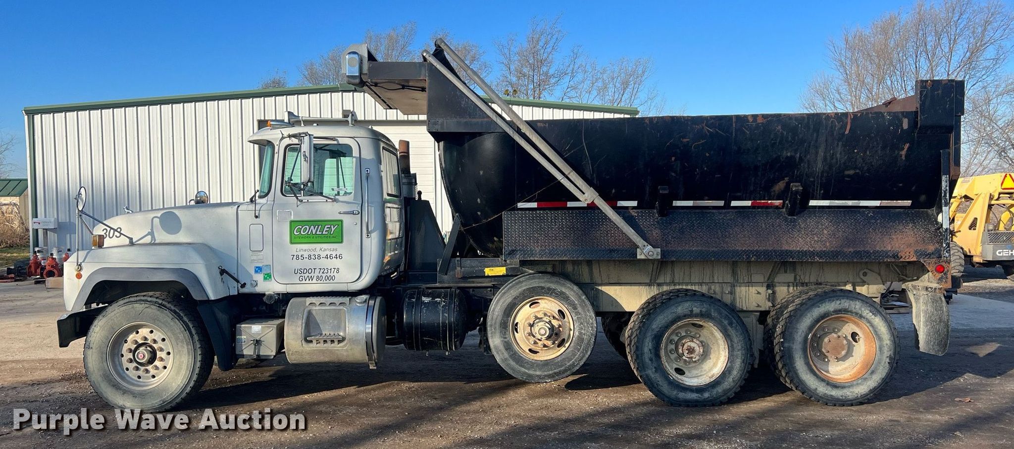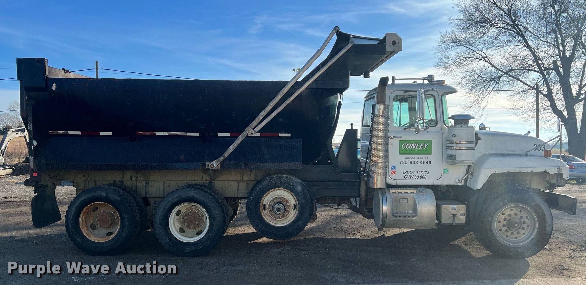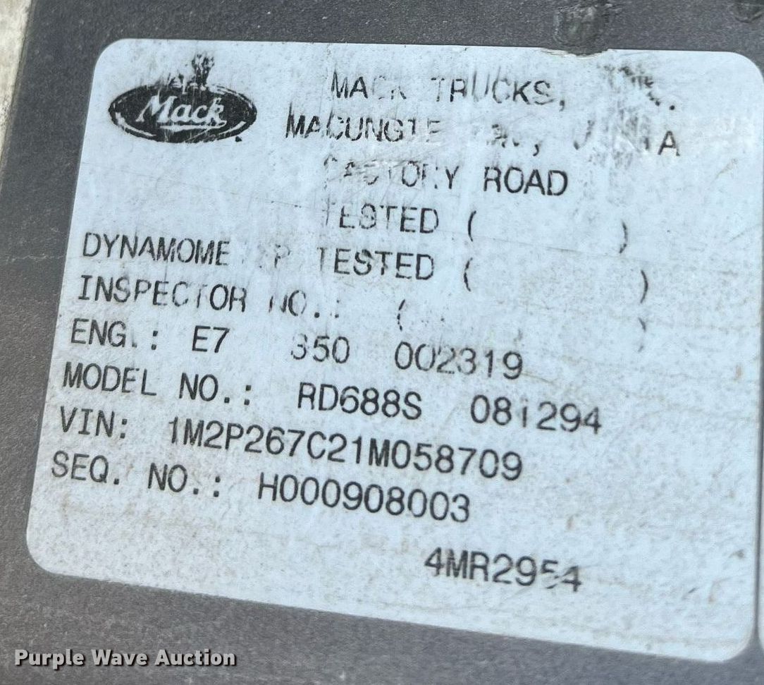 2001 Mack RD688S dump truck. Miles: 65,867 on odometer, Hours: 23,067 on meter, VIN: 1M2P267C21M058709, Unit #: 303. Engine Mack, Displacement: 12.0L, Cylinders: 6, Fuel type: Diesel, Engine brake. Transmission Eaton Fuller, Speed: 10. Chassis Double frame, Axles: Triple, Pusher axle, Suspension: Camelback, Brakes: Air, PTO. Interior AC, Heat, Heated mirrors, Cruise control. Features Dump bed 15' L x 96" W, Side height: 50", Bed type: Steel, Barrel, Roll tarp, Ram: Single , End gate: Air operated. Tires Front: 385/65R22.5, Rear: 11R22.5, Lift axle: 11R22.5. Kansas title. Conley Sitework and Utilities. 12321 222nd Street. Linwood, KS 66052