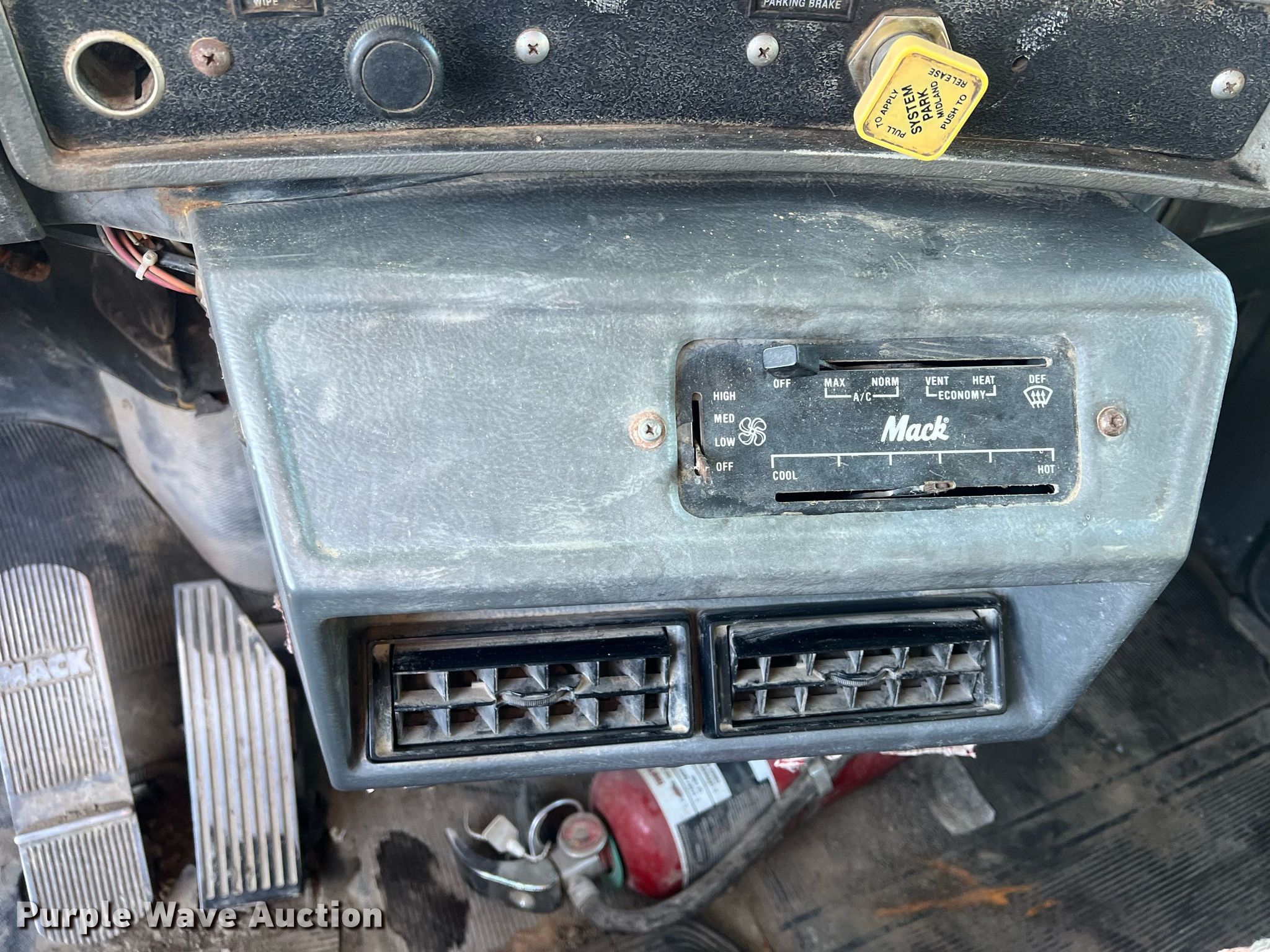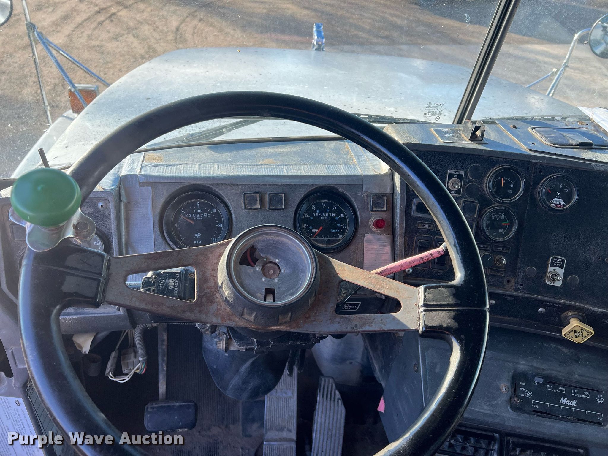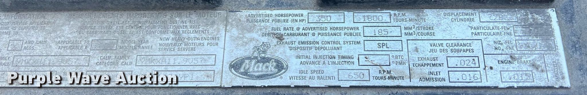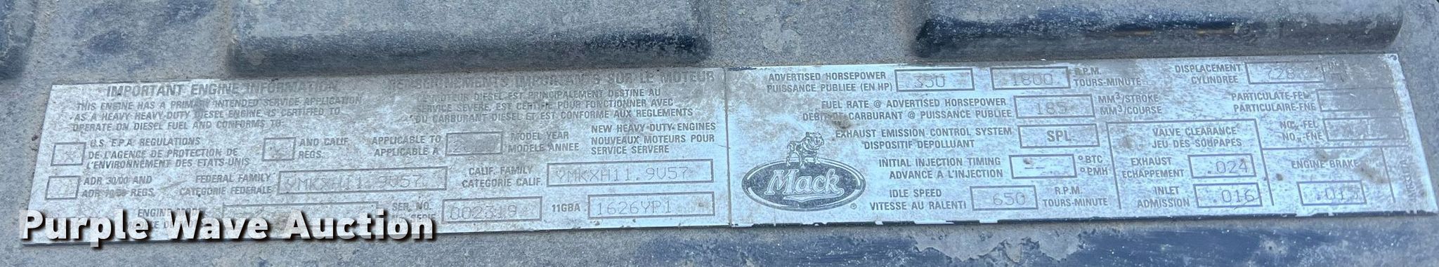 2001 Mack RD688S dump truck. Miles: 65,867 on odometer, Hours: 23,067 on meter, VIN: 1M2P267C21M058709, Unit #: 303. Engine Mack, Displacement: 12.0L, Cylinders: 6, Fuel type: Diesel, Engine brake. Transmission Eaton Fuller, Speed: 10. Chassis Double frame, Axles: Triple, Pusher axle, Suspension: Camelback, Brakes: Air, PTO. Interior AC, Heat, Heated mirrors, Cruise control. Features Dump bed 15' L x 96" W, Side height: 50", Bed type: Steel, Barrel, Roll tarp, Ram: Single , End gate: Air operated. Tires Front: 385/65R22.5, Rear: 11R22.5, Lift axle: 11R22.5. Kansas title. Conley Sitework and Utilities. 12321 222nd Street. Linwood, KS 66052