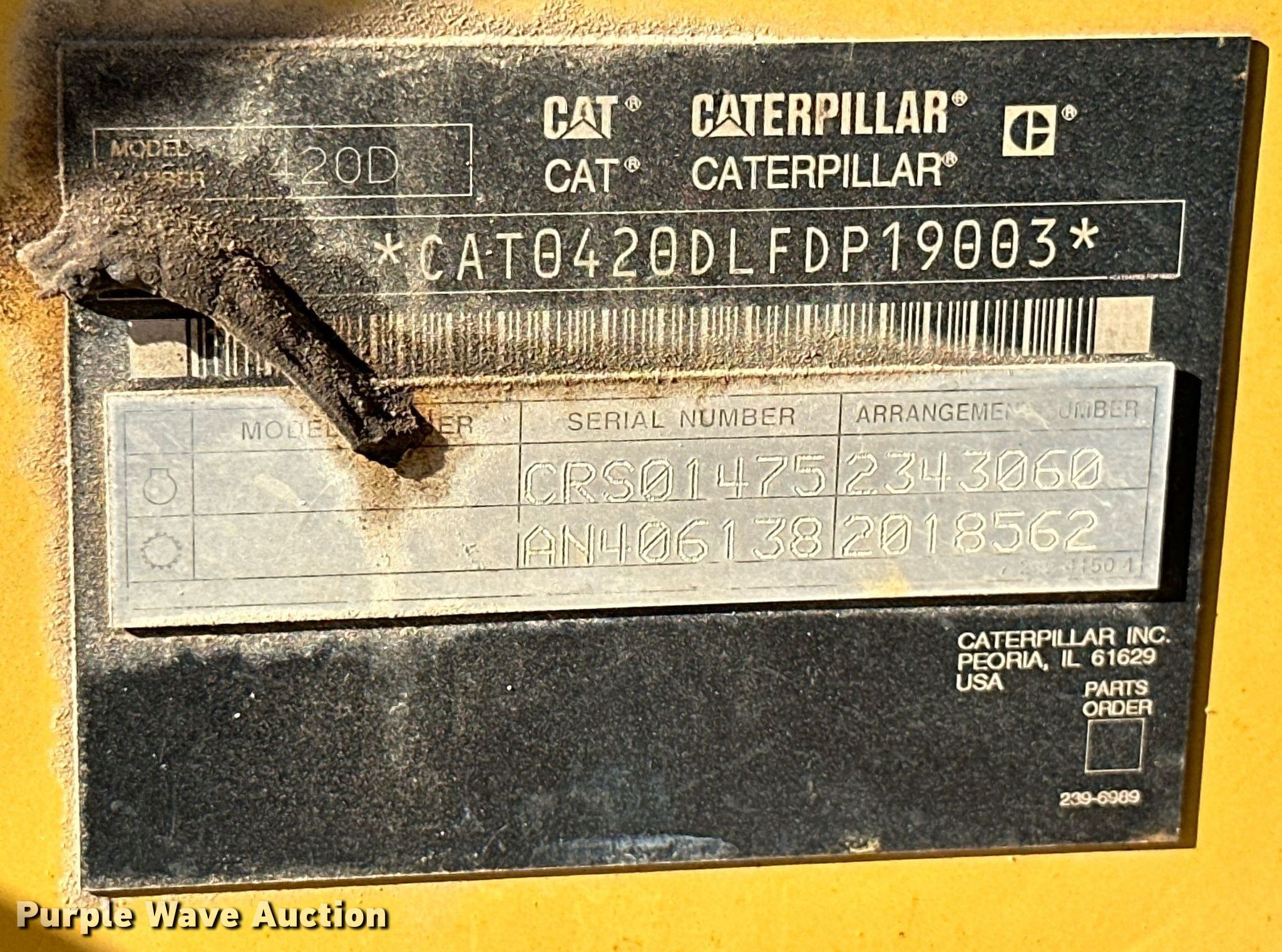 2004 Caterpillar 420D backhoe. Hours: 5,988 on meter, Serial: CAT0420DLFDP19003. Engine Caterpillar, Serial: CRS01475, Cylinders: 4, Fuel type: Diesel. Transmission Shuttle shift, 4F - 4R. Chassis Four wheel drive, Differential lock. Operators station Enclosed cab, AC, Heat, Backhoe controls: Pilot control Foot control. Features Loader Width: 86", Cutting edge: Bolt-on, Backhoe Extendable stick, Auxiliary hydraulics, Bucket Width: 12", Teeth: 3.. Tires Front: 12.5/80-18, Rear: 19.5L-24. Goins Enterprises/Constellation Service. 3255 North County Lane 252. Joplin, MO 64801