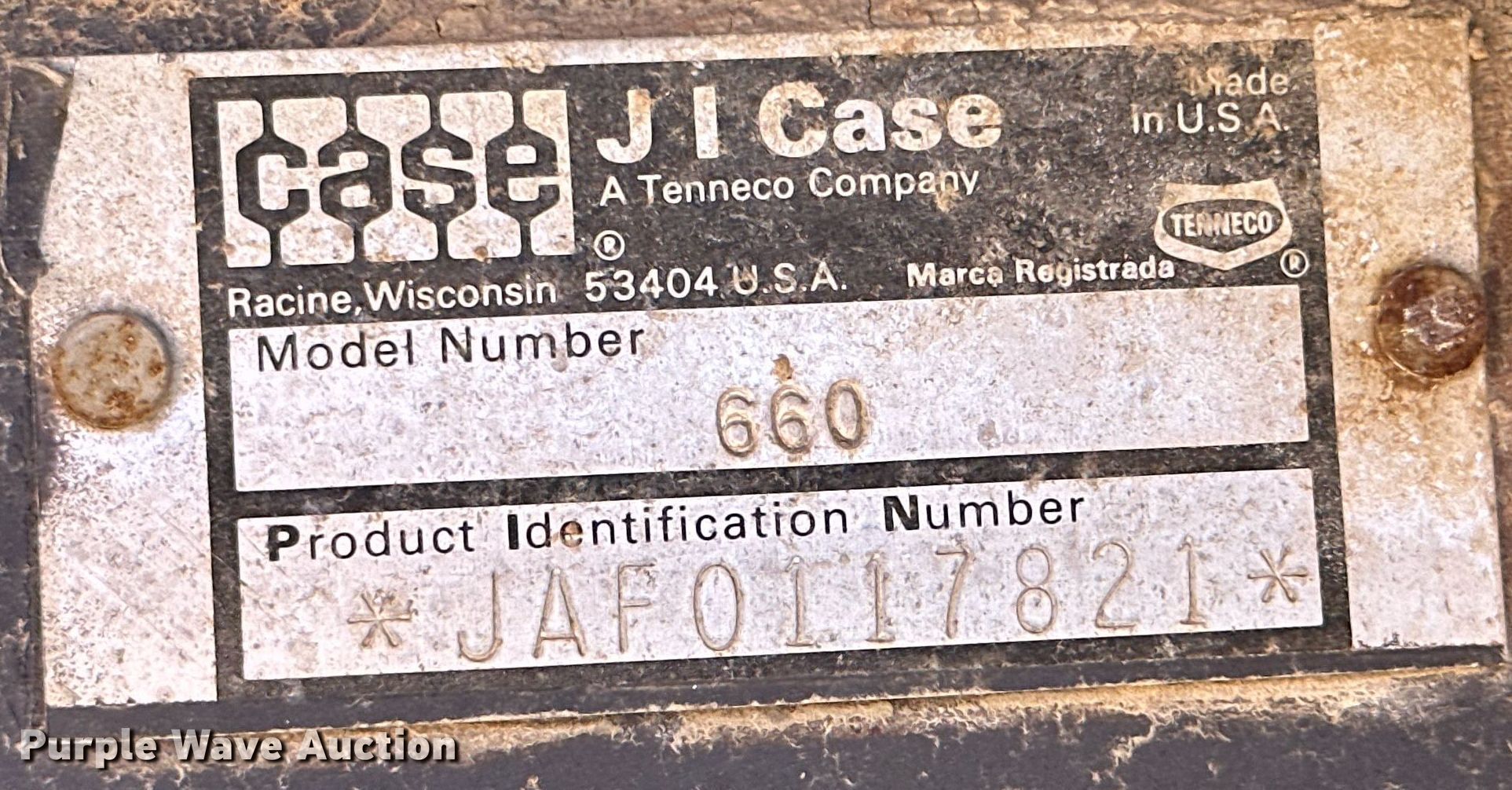1992 Case 660 trencher. Serial: JAF0117821. Engine Case 4-390, Serial: 44764921, Displacement: 239 C.I.D, Cylinders: 4, Fuel type: Diesel, HP: 55. Transmission Hydrostatic. Features Trencher Estimated dig depth: 6", Cutting width: 4", Teeth: Dirt, Backfill blade Width: 72". Tires Size: 31x15.50-15. Notes Hour meter unreadable, Throttle cable broken, Non-operational trencher controls. Goins Enterprises/Constellation Service. 3255 North County Lane 252. Joplin, MO 64801