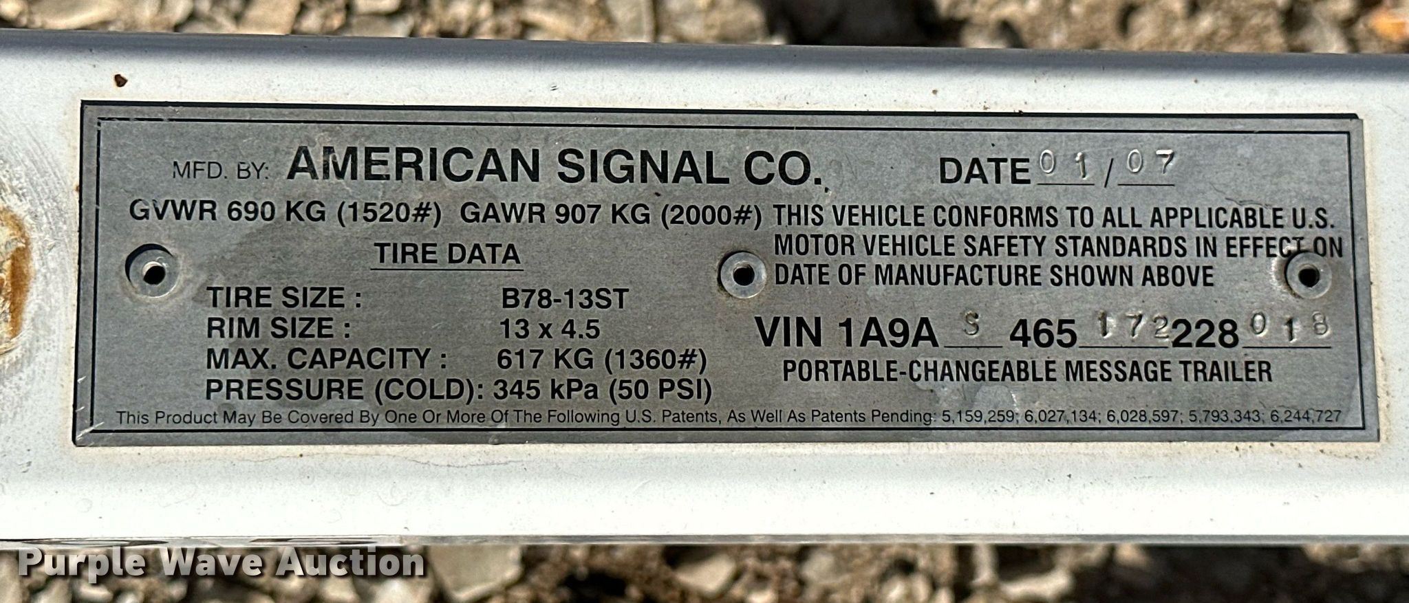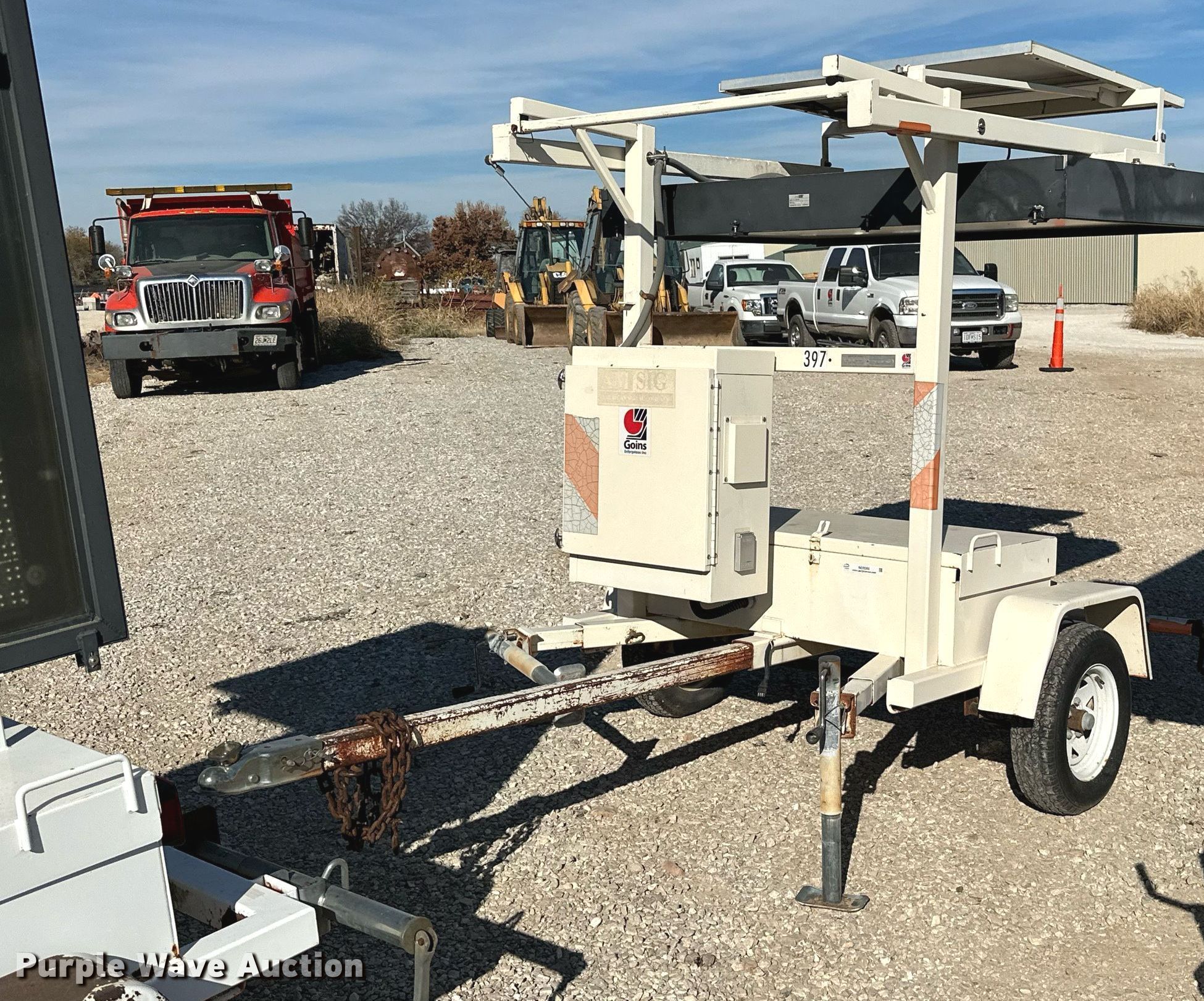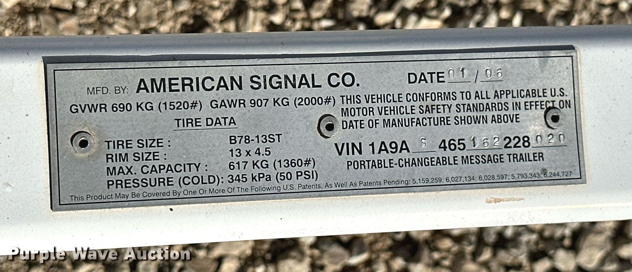 (3) message board trailers. American Signal Co board trailer. VIN: 1A9AS465172228018, 11' L x 72" W. Electric Motor Volts: 48, Solar powered, Hydraulic hoist, Radar capable, Wi-Fi capable, 2" ball hitch, Spring suspension, Single axle, Tire size: ST175/80D13. 2006 American Signal Co board trailer VIN:1A9AS465162228020, 11' L x 72" W, Volts: 48, Solar powered, Hydraulic hoist, Radar capable, Wi-Fi capable, 2" ball hitch, Spring suspension, Single axle, Tire size: ST175/80D13. 2001 American Signal Co board trailer Vin: 1A9AS465012228602, 11' L x 72" W, Volts: 48, Solar powered, Hydraulic hoist, Radar capable, Wi-Fi capable, 2" ball hitch, Spring suspension, Single axle, Tire size: ST175/80D13. Notes Electronic issues , Needs circuit boards replaced, Non-operational units. Trailer 1: Transfer of ownership documentation will be a bill of sale. Trailer 2: Transfer of ownership documentation will be a bill of sale. Trailer 3: Transfer of ownership documentation will be a bill of sale. Goins Enterprises/Constellation Service. 3255 North County Lane 252. Joplin, MO 64801