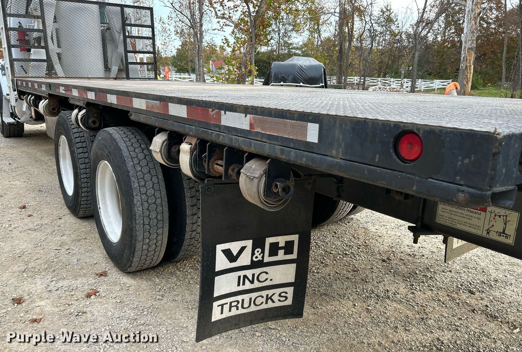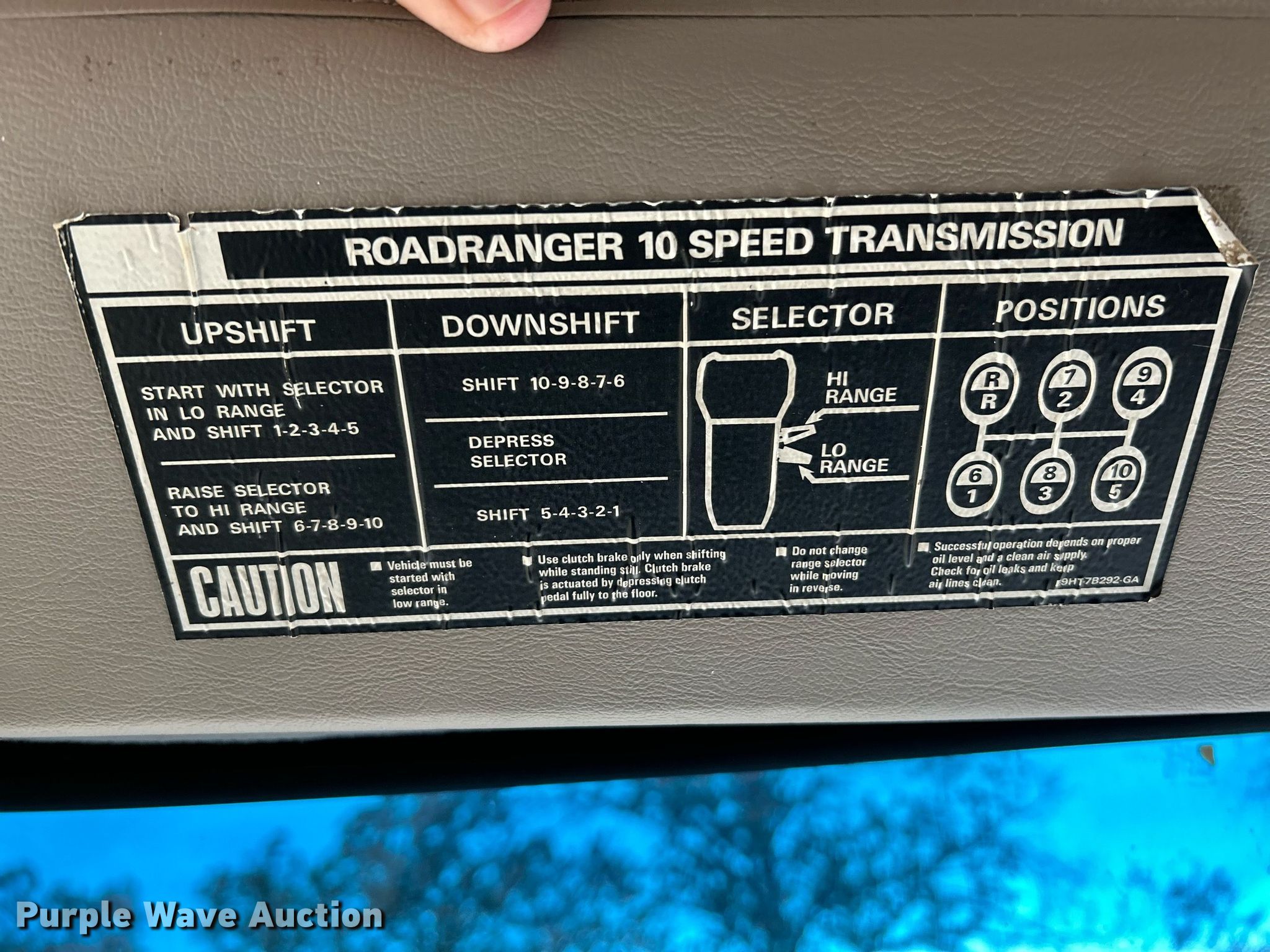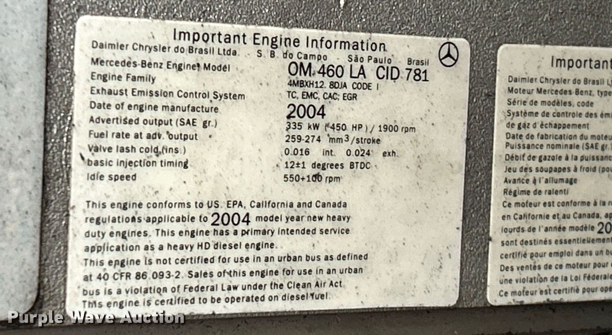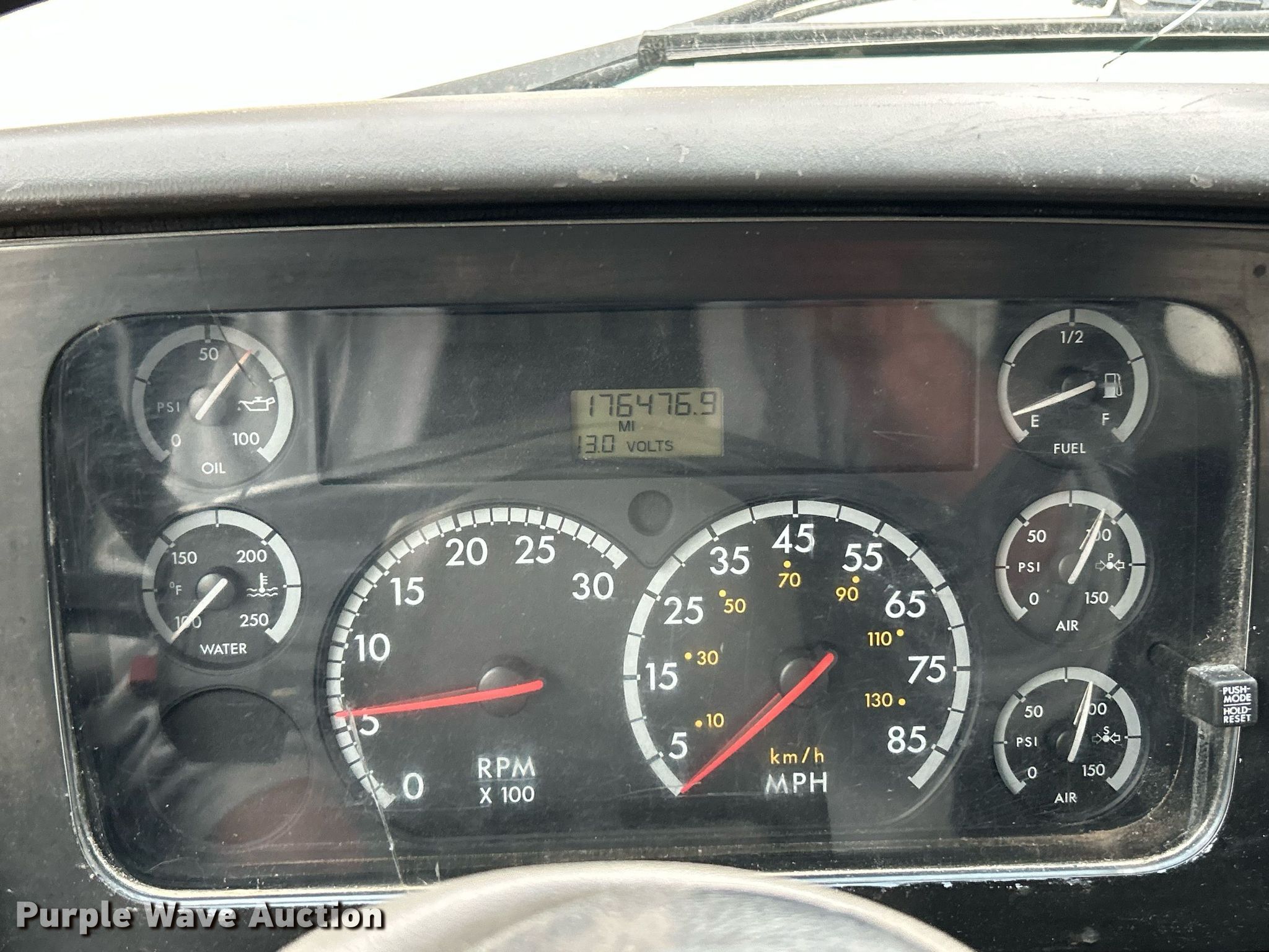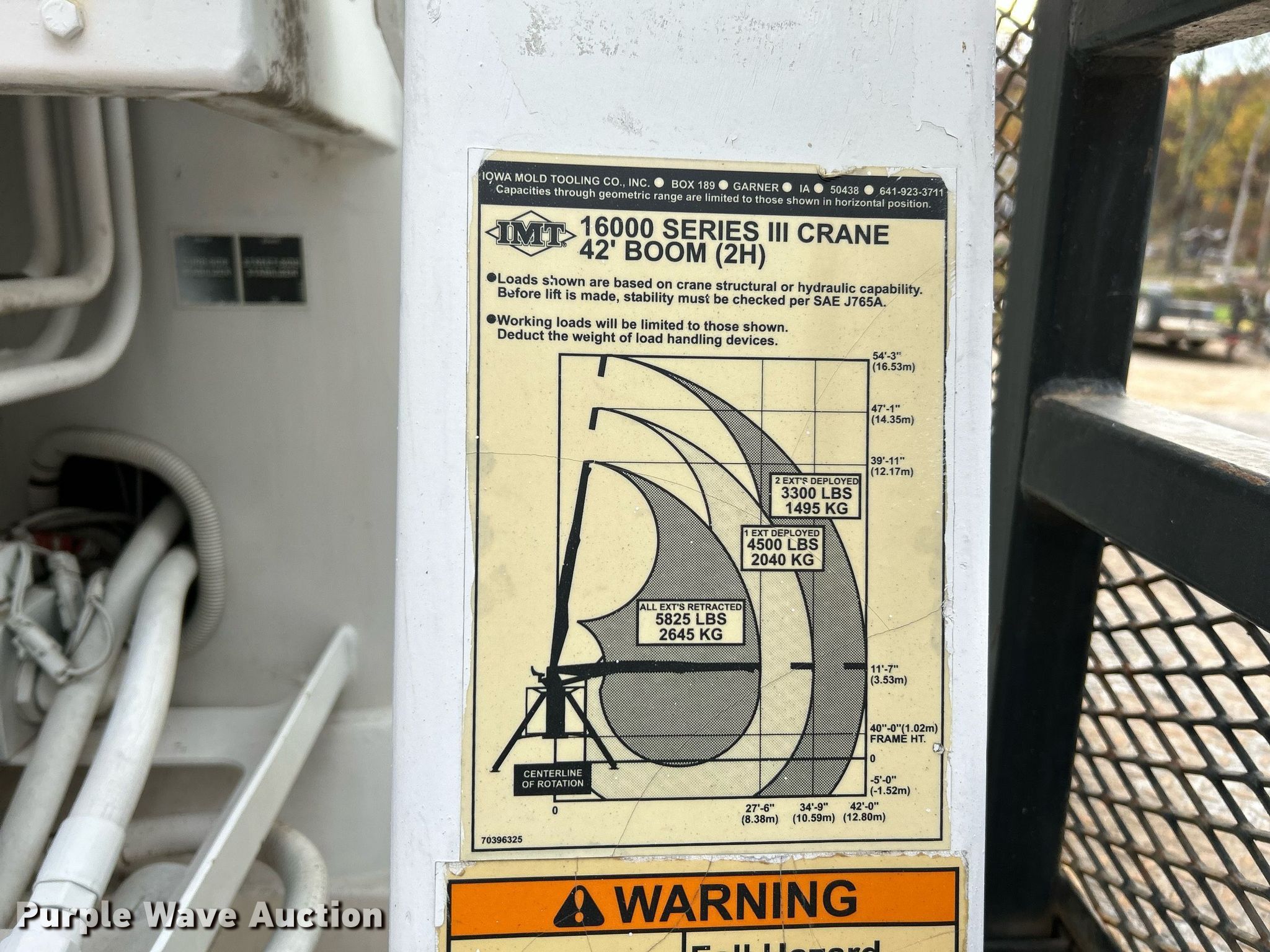 2005 Sterling LT9500 crane truck. Miles: 176,477 on odometer, Hours: 10,884 on meter, VIN: 2FZHAZCV25AN81494. Engine Mercedes Benz OM 460 LA CID 781, Displacement: 12.8L, Cylinders: 6, Fuel type: Diesel, HP: 450, Engine brake. Transmission Eaton Fuller, Manual, Speed: 10. Chassis Axles: Tandem, Suspension: Spring over walking beam, Brakes: Air, PTO, GVWR: 66,000 lbs FAWR: 20,000 lbs, IAWR: 23,000 lbs, RAWR: 23,000 lbs. Interior AC, Heat, Cruise control, Backup camera. Features Flatbed 24' 7" L x 96" W, Crane IMT 1600 series III, Boom Telescopic, Maximum boom length: 54' Sections: 3, Maximum lift capacity: 5,825 lbs, Boom controls Ground, Lift chart. Tires Front: 425/65R22.5, Rear: 11R22.5. Notes Windshield chipped or cracked. Missouri title. Title distribution may be delayed up to 14 days from verification of funds. Concrete Construction LLC. Wentzville, MO 63385