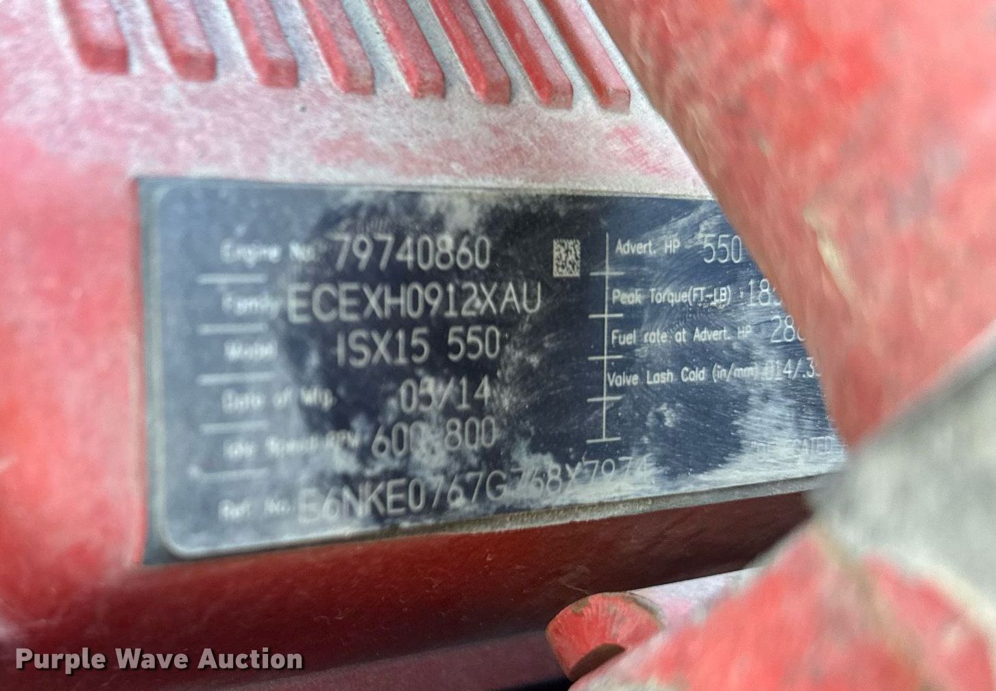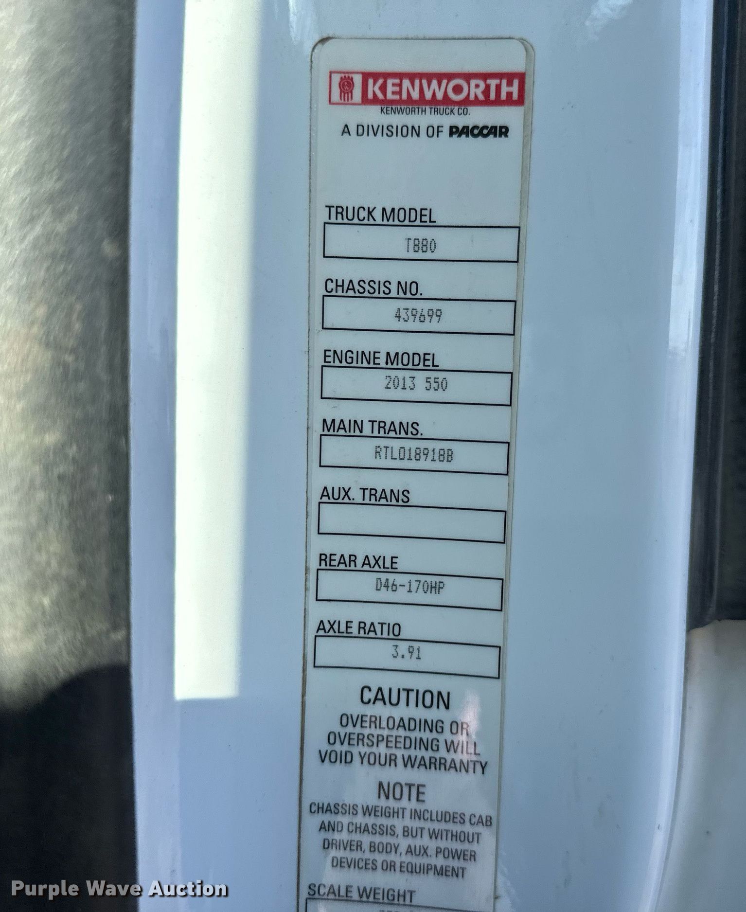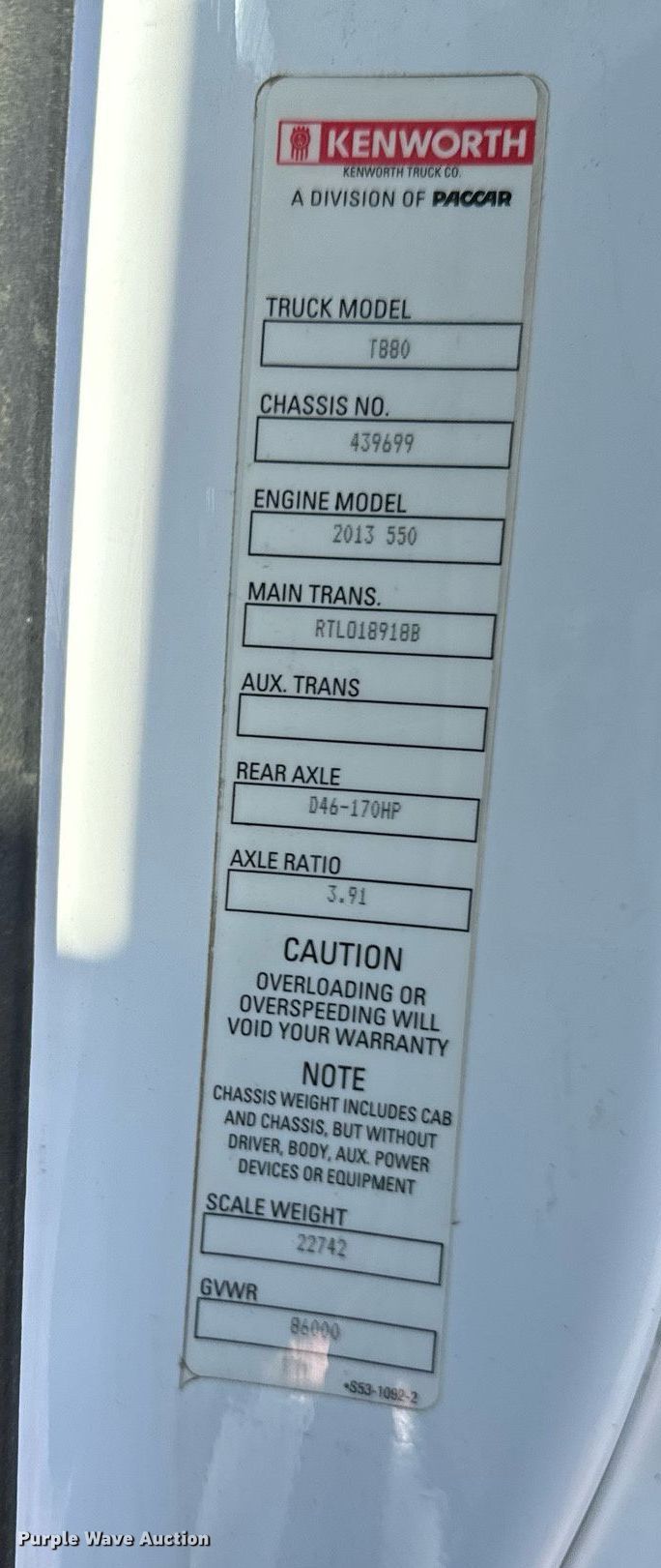 2015 Kenworth T880 semi truck. Miles: 431,793 on odometer, VIN: 1XKZP4TX1FJ439699. Engine Cummins ISX15, Displacement: 14.9L, Cylinders: 6, Fuel type: Diesel, Engine brake. Transmission Eaton, Manual, Speed: 18. Chassis Axles: Triple, Pusher axle Steerable, Differential lock: Full, Suspension: Air Dump valves, Brakes: Air, PTO, Wet kit, Double frame , GVWR: 86,000 lbs FAWR: 20,000 lbs, IAWR: 23,000 lbs, RAWR: 23,000 lbs, Lift axle GAWR: 20,000 lbs. Interior AC, Heat, Power windows, Power locks, Cruise control, Air ride cab. Features Deck plate: Aluminum, Fifth wheel type: Air operated, Sliding, Fuel tank: Dual. Tires Front: 425/65R22.5, Rear: 11R22.5, Lift axle: 425/65R22.5. Notes Dash warning indicator: Check engine, SCR system fault. Kansas title. Title distribution may be delayed up to 30 days from verification of funds. Sunflower Paving Inc./RD Johnson Excavating. 4123 Northeast Seward Avenue. Topeka, KS 66616