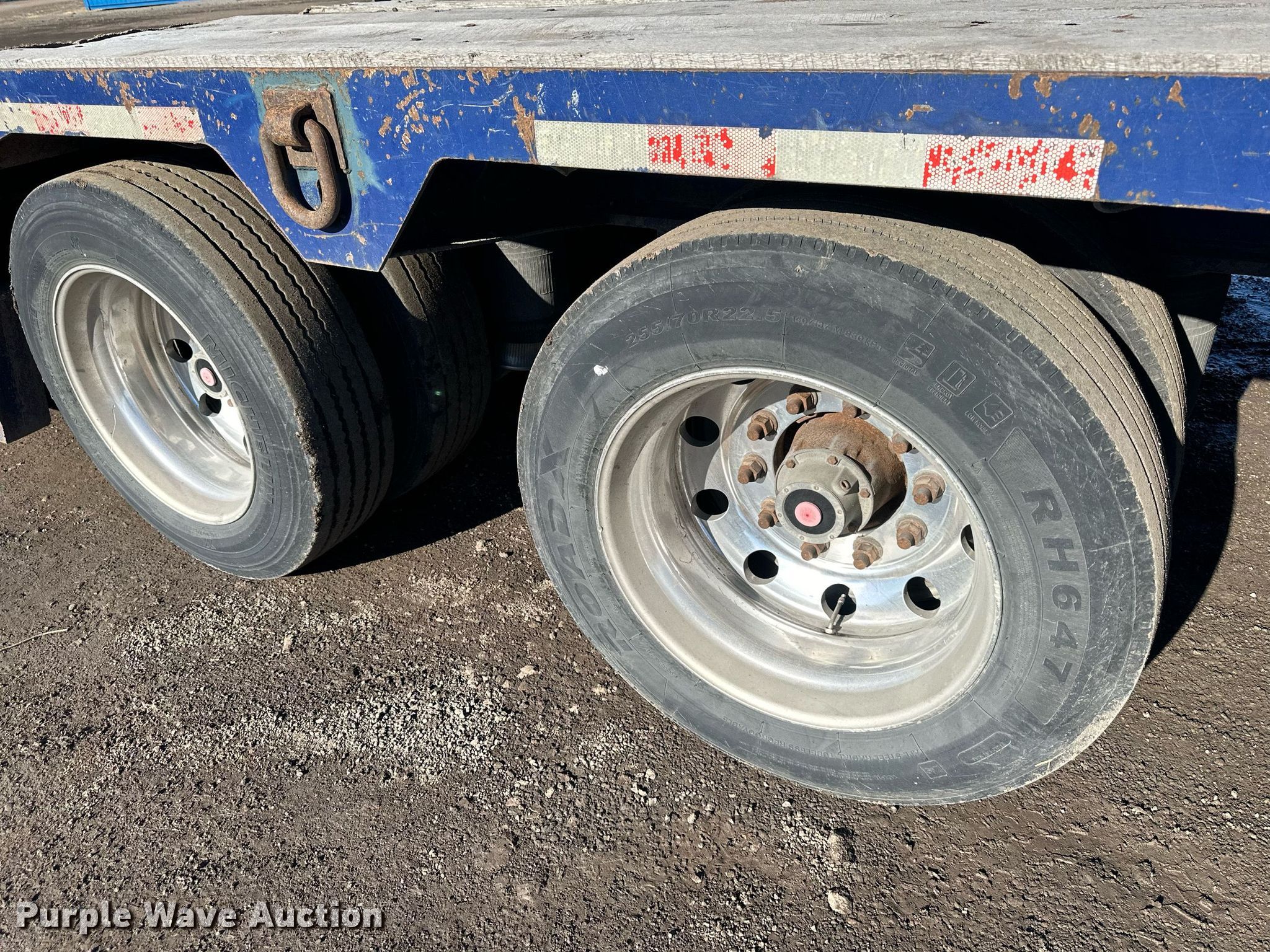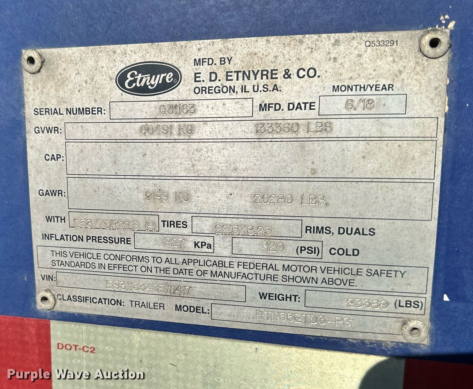 2012 Etnyre Blackhawk lowboy equipment trailer. VIN: 1E9311634CE111417, Unit #: 3031. Dimensions Overall: 54' L x 102" W, Deck: 25' L x 102" W, Tail length: 16', Ramps: Manual Length: 42". Features Deck type: Wood, Outriggers: Swing-out, Neck type: Detachable. Chassis Suspension: Air, Brakes: Air, Axles: Triple, GVWR: 133,360 lbs, GAWR: 20,280 lbs. Tires Aluminum wheels, Size: 255/70R22.5. Kansas title. Sunflower Paving Inc./RD Johnson Excavating. 4123 Northeast Seward Avenue. Topeka, KS 66616