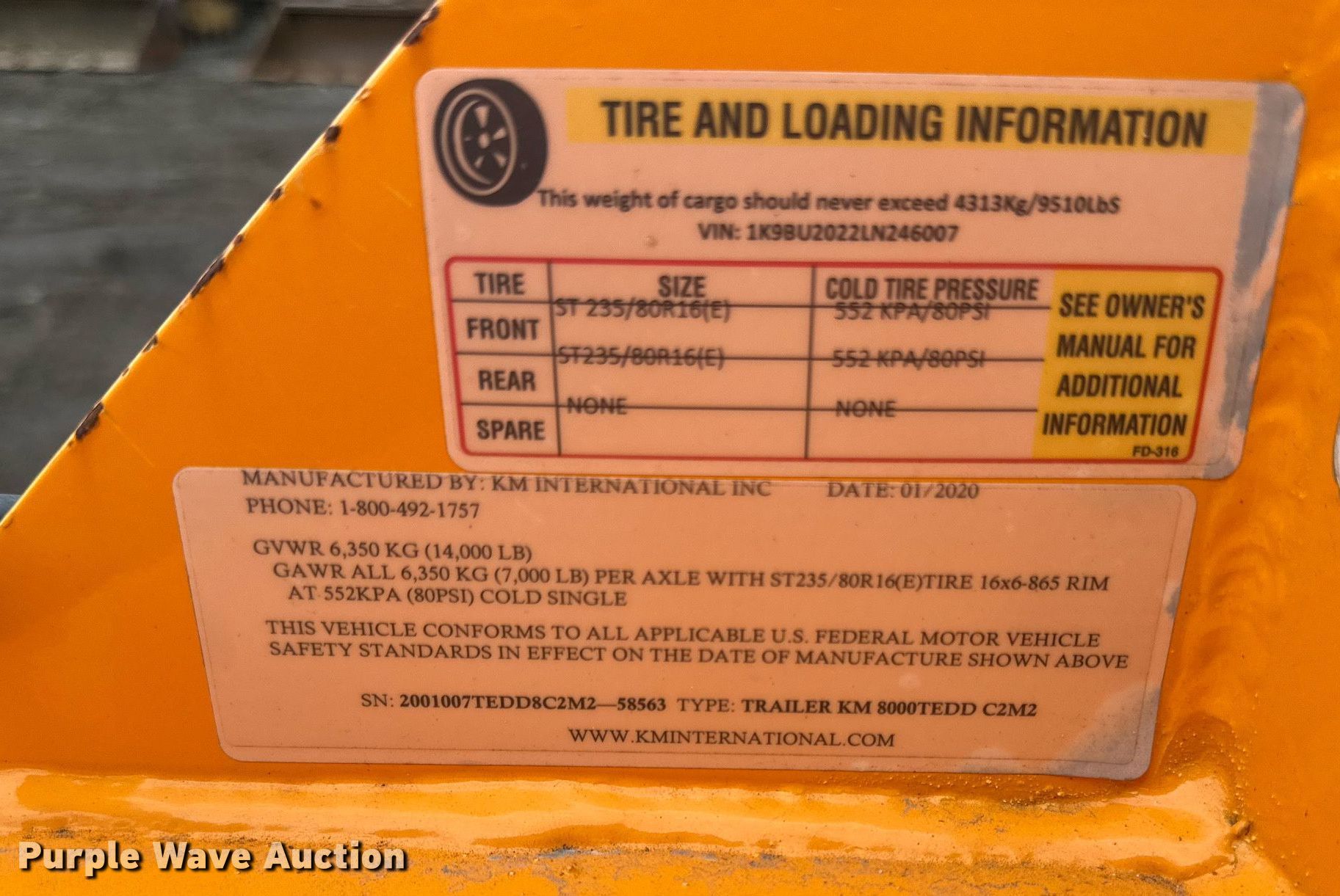 Purple Wave is selling a used Pot Hole Patcher in Kansas. This item is a 2020 KM International KM8000TEDD asphalt hotbox with the following: VIN: 1K9BU2022LN246007, Dimensions: 20' L x 102" W