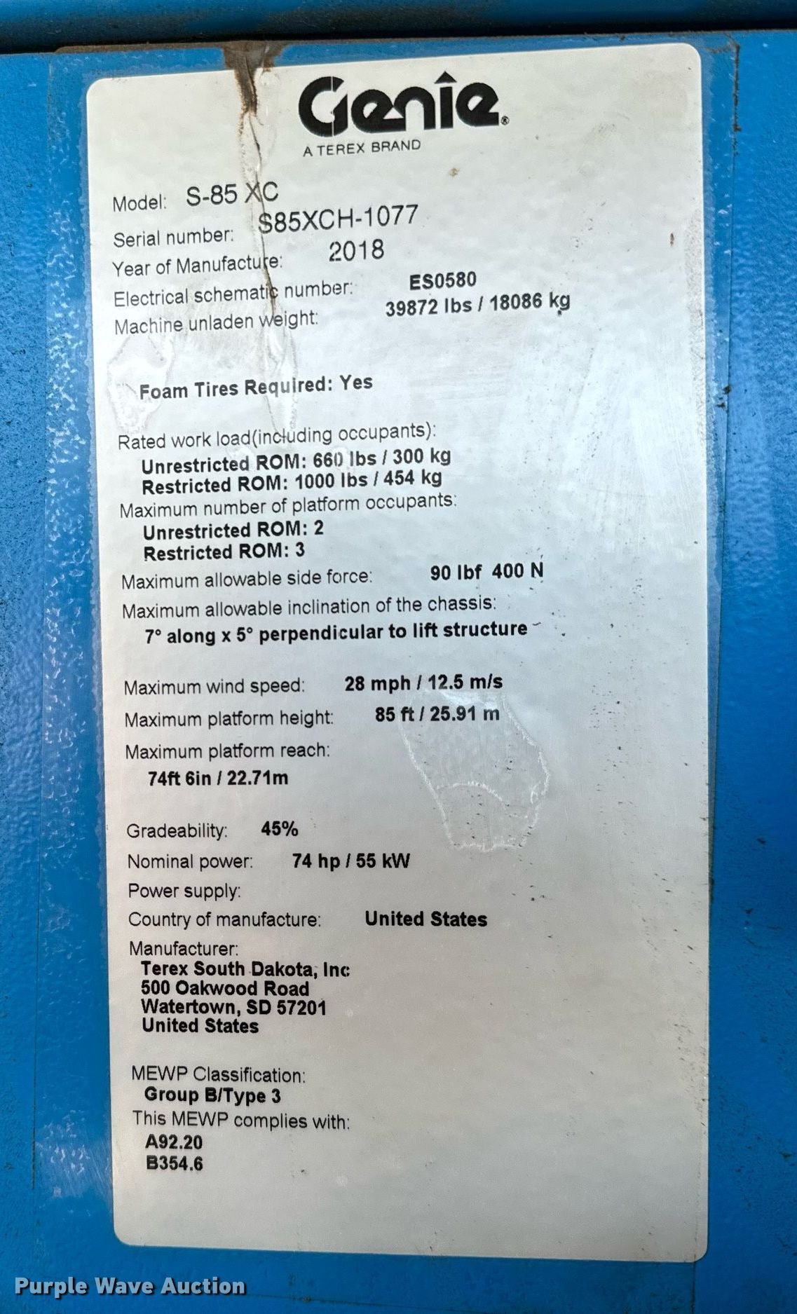 2018 Genie S-85 XC boom lift | SOLD! December 28 Construction Equipment Auction