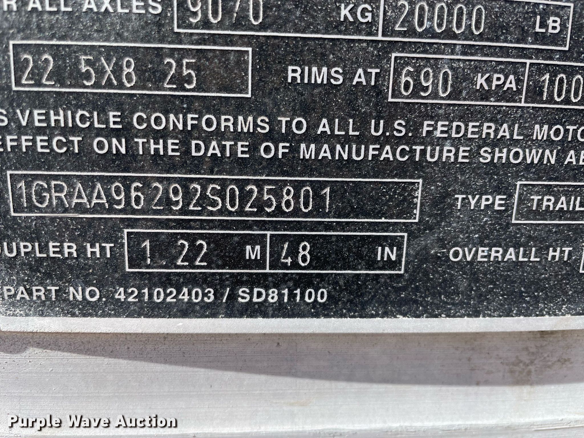 2002 Great Dane refrigerated van trailer. VIN: 1GRAA96292S025801, Unit #: 902801. Dimensions Overall: 48' L x 96" W. Features Deck type: Steel, Refrigeration unit Thermo King, Hours: 50,666. Chassis Landing gear: Dual, Suspension: Spring, Brakes: Air, Axles: Tandem, Sliding, GVWR: 68,000 lbs, GAWR: 20,000 lbs. Tires Steel wheels, Size: 295/75R22.5. Notes Contents not included, Non-operational rear door, Unknown operating condition of refrigeration unit. Florida title. Titles will be distributed after confirmation of payment and removal. Title distribution may be delayed up to 30 days from verification of funds. New Dairy Opco, LLC, d/b/a Borden Dairy. 308 Avenue G Southwest. Winter Haven, FL 33880