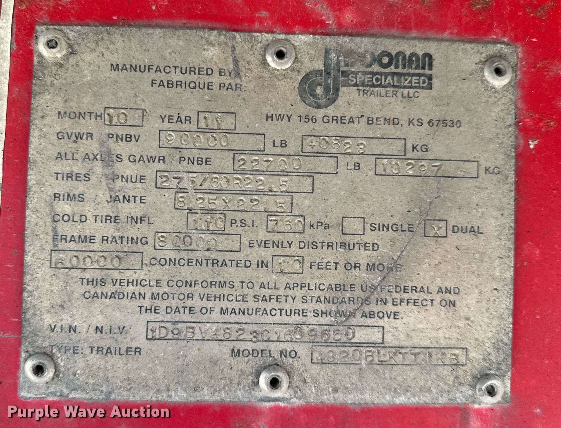 Purple Wave is selling a used Flat or Drop Deck Trailer in Oklahoma. This item is a 2012 Doonan 4820BLKTTIKB flatbed trailer with the following: VIN: 1D9BV4823C1609650, Unit #: 326