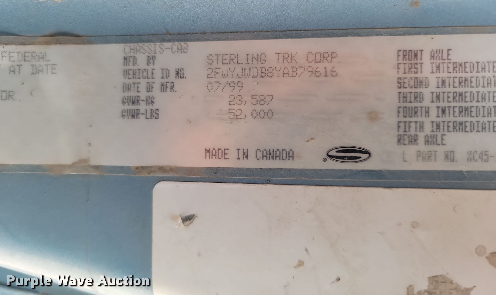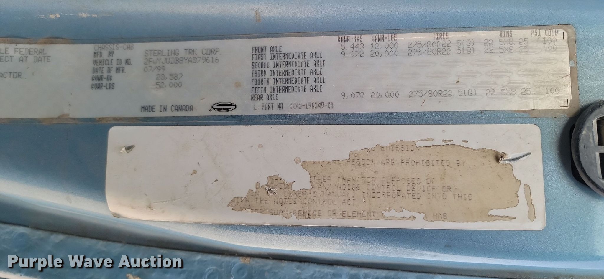 2000 Sterling AT9513 semi truck. Miles: 748,983 on odometer, VIN: 2FWYJWDB8YAB79616. Engine Caterpillar C12, Displacement: 12.0L, Cylinders: 6, Fuel type: Diesel. Transmission Road Ranger , Manual, Speed: 10. Chassis Axles: Tandem, Differential lock: Inter-axle, Suspension: Air Dump valves, Brakes: Air, GVWR: 52,000 lbs FAWR: 12,000 lbs, IAWR: 20,000 lbs, RAWR: 20,000 lbs. Interior AC, Heat, Heated mirrors. Features Fifth wheel type: Air operated, Sliding, Fuel tank: Dual. Tires Size: 11R22.5. Notes Dash warning indicator: Anti-lock. South Dakota title. Title distribution may be delayed up to 14 days from verification of funds. 46287 209th Street. Volga, SD 57071