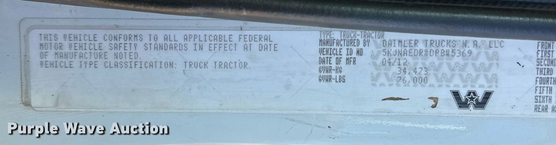Purple Wave is selling a used Truck Tractor in Oklahoma. This item is a 2013 Western Star 4900 semi truck with the following: Miles: 332,574 on odometer, Miles or hours may vary, unit still in use, VIN: 5KJNAEDRXDPBW5369