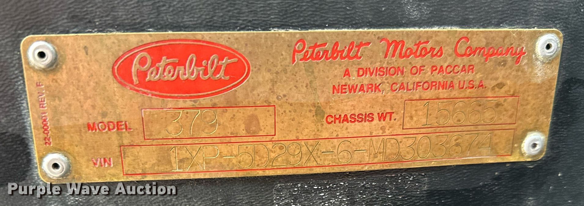 1991 Peterbilt 379 semi truck. Miles: 823,533 on odometer, VIN: 1XP5D29X6MD303674. Engine Displacement: 10.0L , Cylinders: 6, Fuel type: Diesel, Engine brake. Transmission Eaton fuller Roadranger, Manual, Speed: 13. Chassis Axles: Tandem, Differential lock: Inter-axle, Suspension: Air Dump valves, Brakes: Air, PTO, Wet kit, GVWR: 52,000 lbs FAWR: 12,000 lbs, RAWR: 20,000 lbs. Interior AC, Heat, Heated mirrors, Cruise control. Features Fifth wheel type: Air operated, Sliding, Fuel tank: Dual. Tires Size: 11R 24.5. Nevada title. Seller is a Minnesota licensed motor vehicle dealer. The buyer may be required to pay sales tax and/or registration fees to the dealer prior to taking possession. Title will be assigned and distributed by the dealer. Please contact the seller for distribution questions. Warmington Truck and Equipment Sales. 1829 6th Street Northwest. Faribault, MN 55021