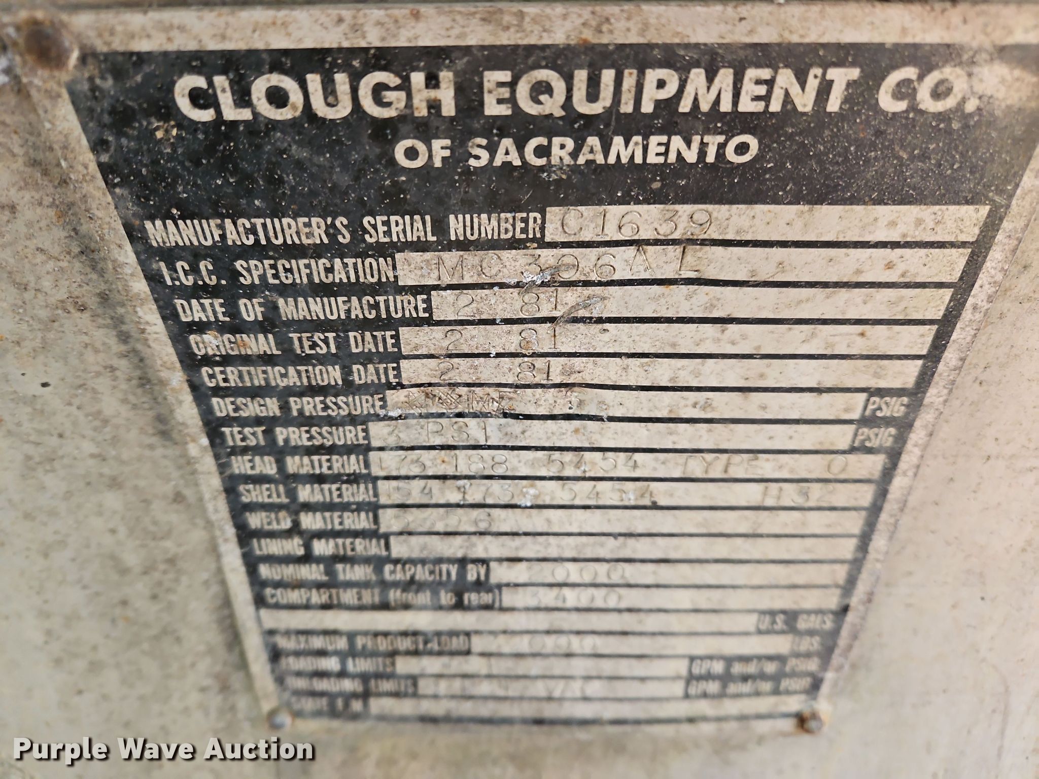 Purple Wave is selling a used Tank Trailer in Kentucky. This item is a 1981 Clough Equipment tank trailer with the following: VIN: C1639