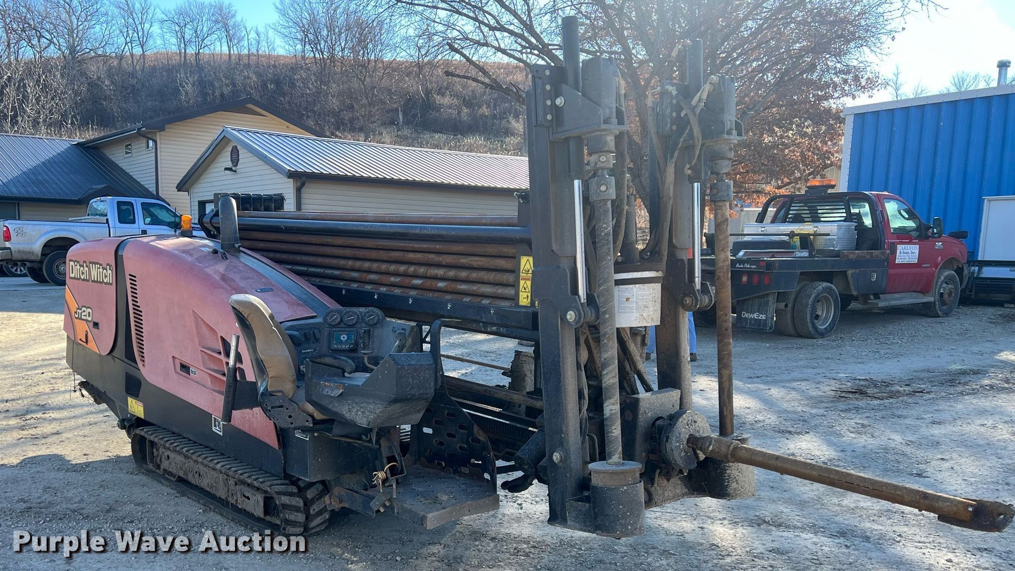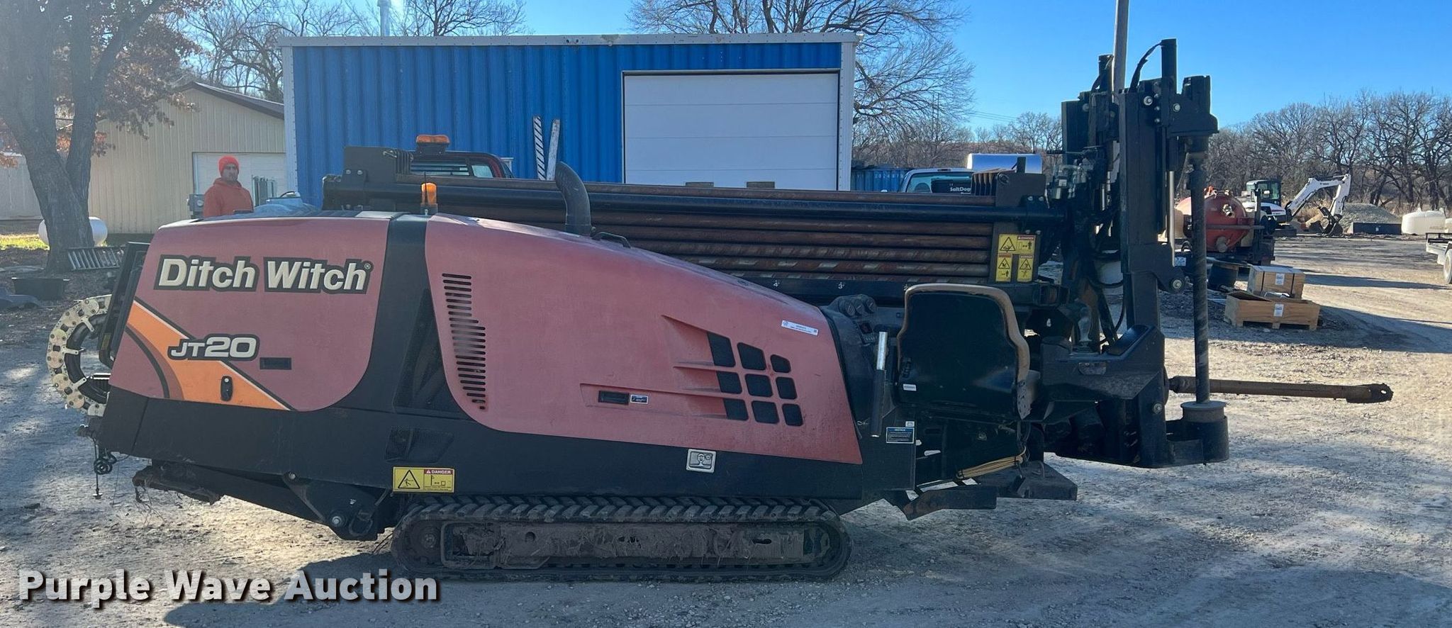 2014 Ditch Witch JT20 directional boring unit. Hours: 2,371 on meter. Engine Deutz, Cylinders: 4, Fuel type: Diesel. Features Ground drive remote: Tethered, Water pump, Drill bit width: 4", Drill stems On drill: 40, Drill stem length: 10' Diameter: 2", Auto rod loader, Rear hydraulic stabilizers, Hydraulic stake down. Tracks Width: 10", Rubber. Carlyon & Sons Inc.. Junction City, KS 66441