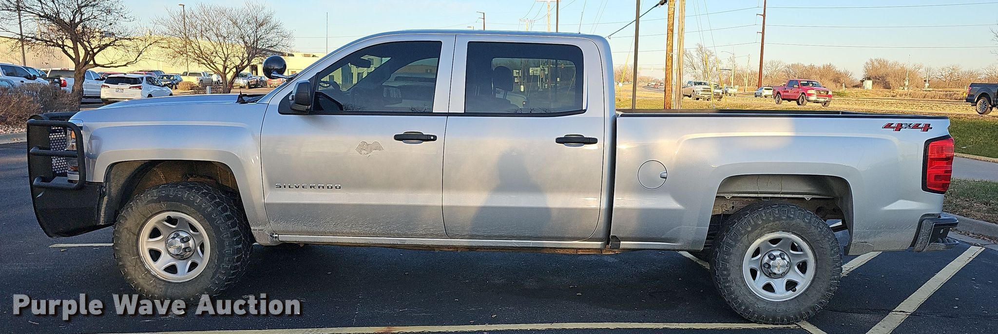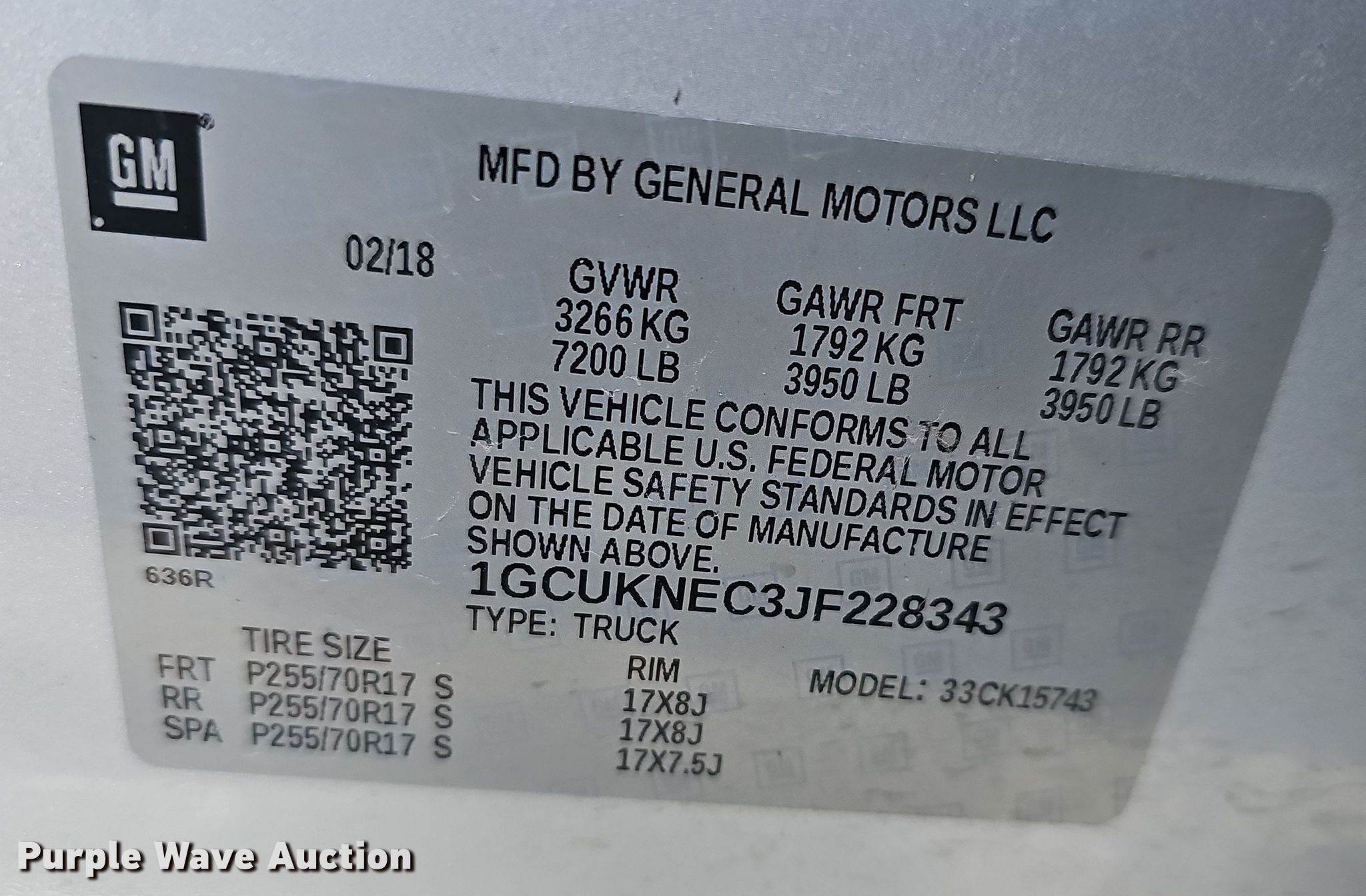 2018 Chevrolet Silverado 1500 Crew Cab pickup truck. Miles: 95,678 on odometer, VIN: 1GCUKNEC3JF228343. Engine Displacement: 5.3L V8 OHV, Cylinders: 8, Fuel type: Gas. Transmission Automatic, Four wheel drive. Interior AC, Heat, Heated mirrors, Power windows, Power locks, Cruise control, Backup camera. Tires Size: 285/70R17. Notes Dash warning indicator: Traction control, Airbag, Service safety restraint system, Service stabiliTrak, Rear seat missing, Center console missing. Kansas title. Title distribution may be delayed up to 14 days from verification of funds. Purple Wave. 825 Levee Drive. Manhattan, KS 66502