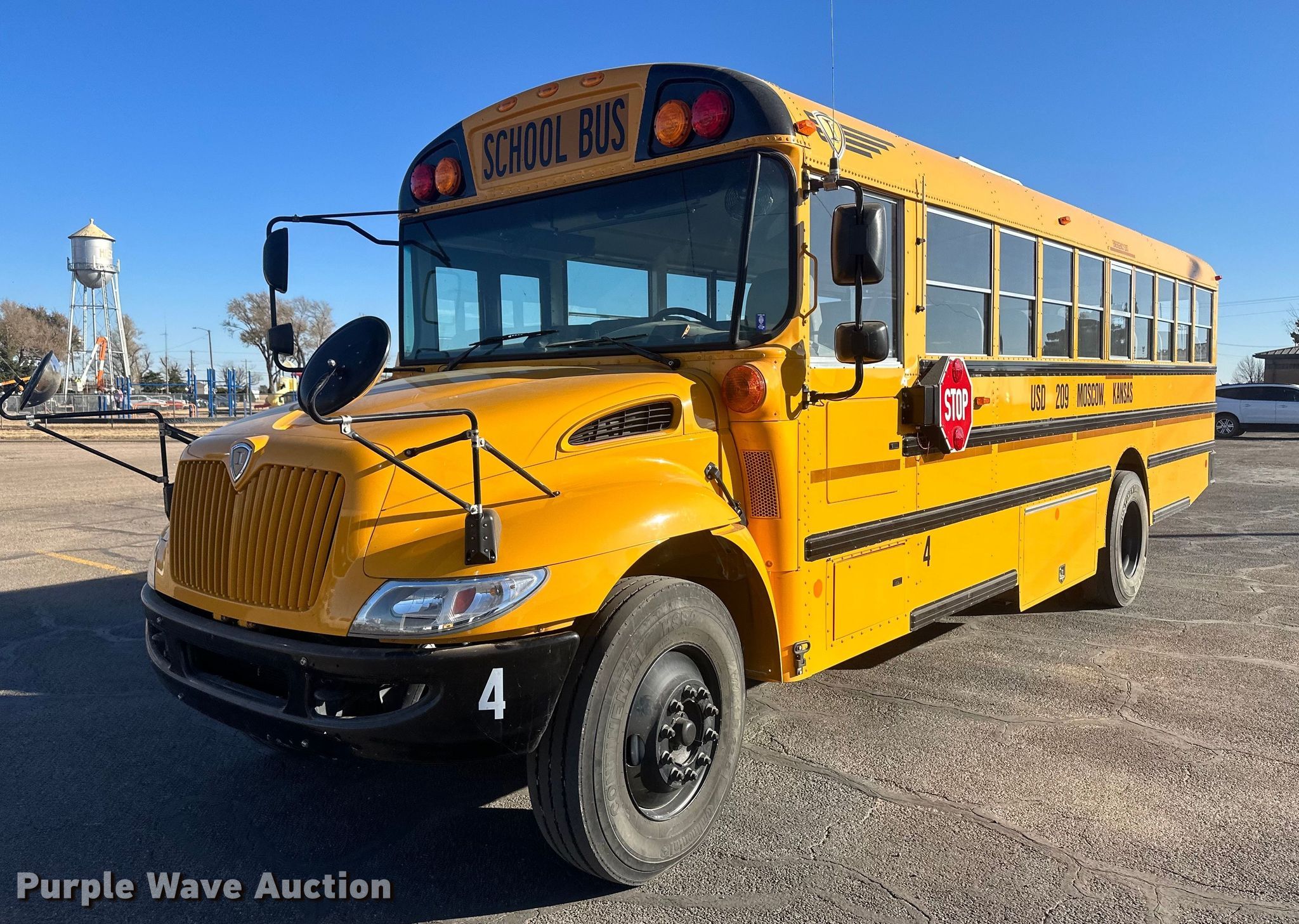 2012 International CE school bus. Miles: 63,661 on odometer, Hours: 2,209 on meter, VIN: 4DRBUSKN9CB044911. Engine International MaxxForce, Displacement: 6.4 L, Cylinders: 8, Fuel type: Diesel. Transmission Automatic. Chassis Axles: Single, Suspension: Spring, Brakes: Air, GVWR: 29,800 lbs. Interior AC, Heat, Cruise control, Passengers: 33. Tires Size: 11R22.5. Notes Engine issues, coolant leak. Kansas title. USD 209. 301 High School Street. Moscow, KS 67952