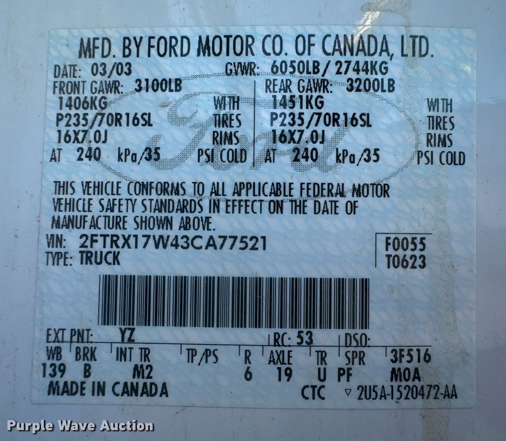 - VIN: 2FTRX17W43CA77521