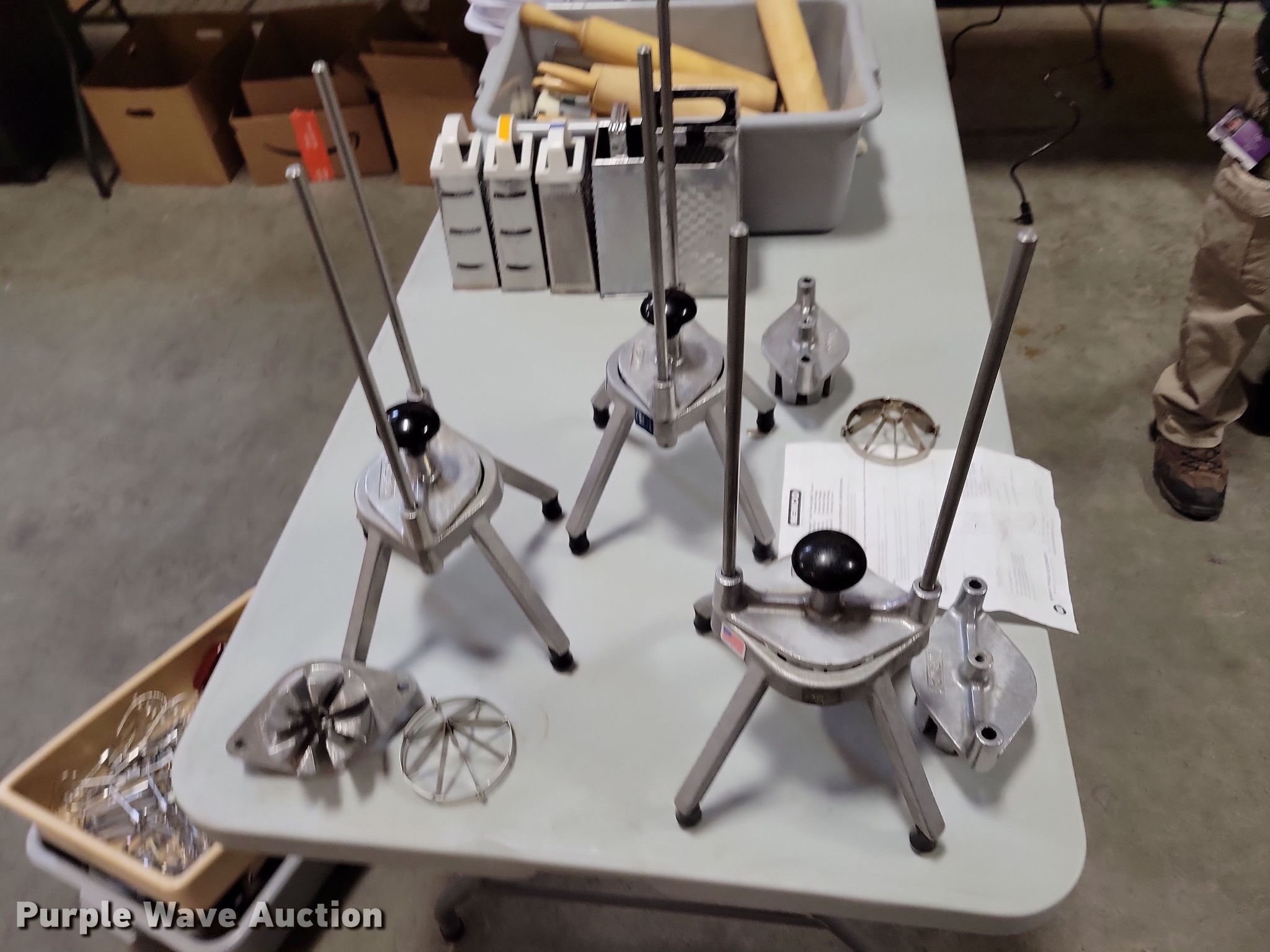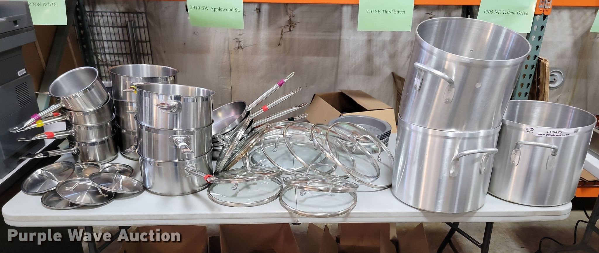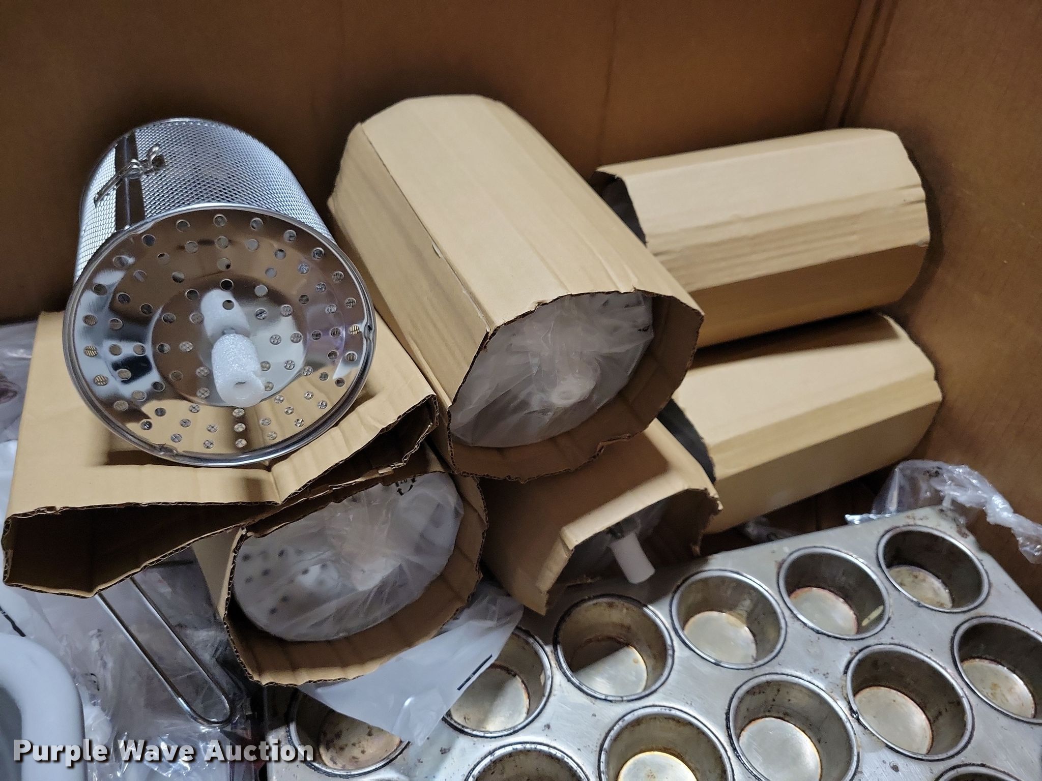 Purple Wave is selling a used All Other Household Items in Iowa. This item is a Kitchen equipment with the following: Skillets, Pots, Pans, Stock pots, Pizza sheets, Strainer, Bunt pans, Bowls, Rolling pins, Graters, Various kitchen utensils, Mixers, Apple/potato slicers, Muffins trays, Blenders, Fry strainers