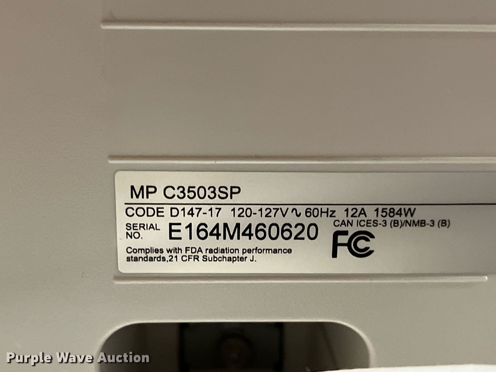 Purple Wave is selling a used Electronics in Missouri. This item is a Lanier MP C3503 printer with the following: Serial: E164M460620
