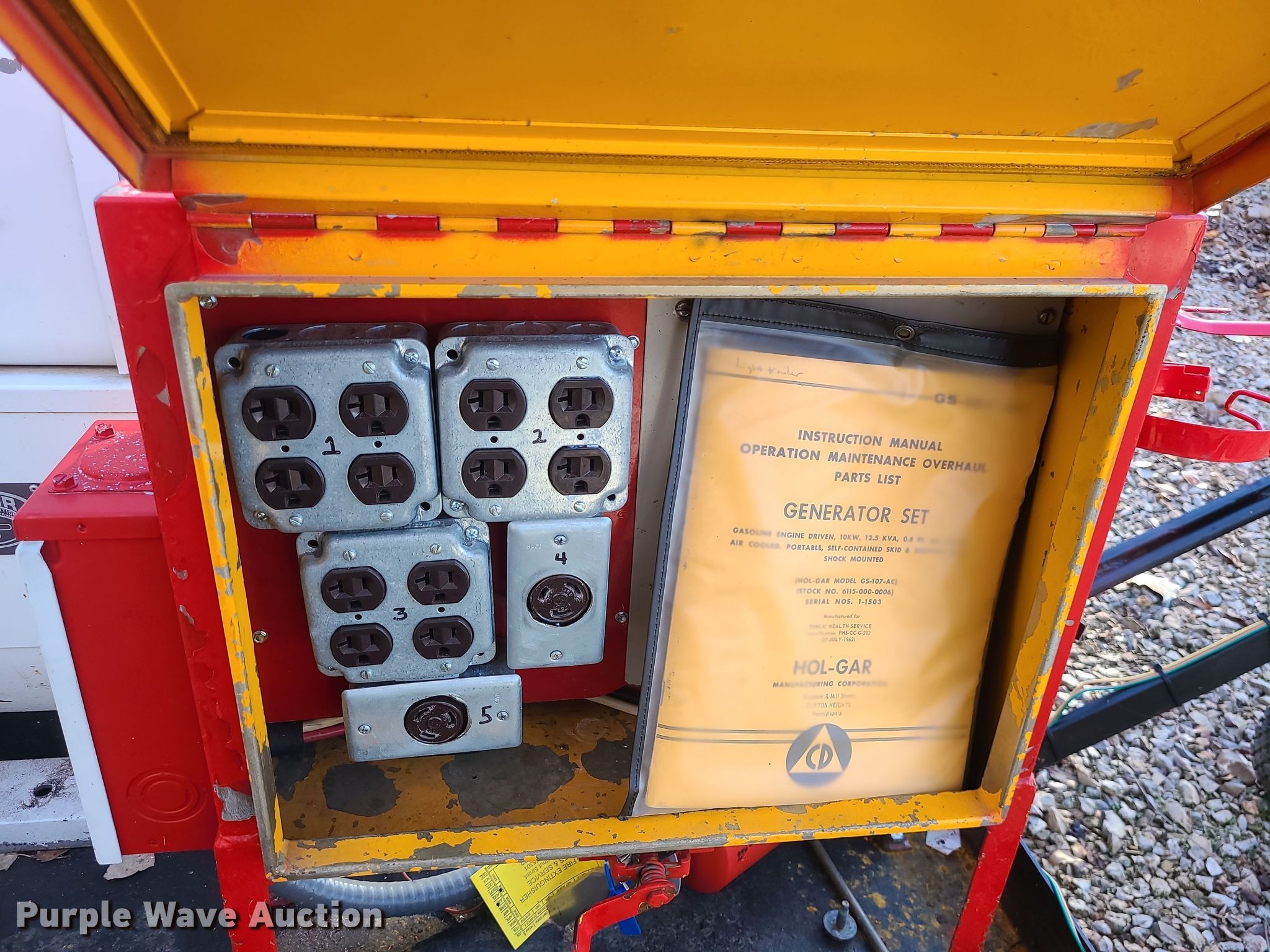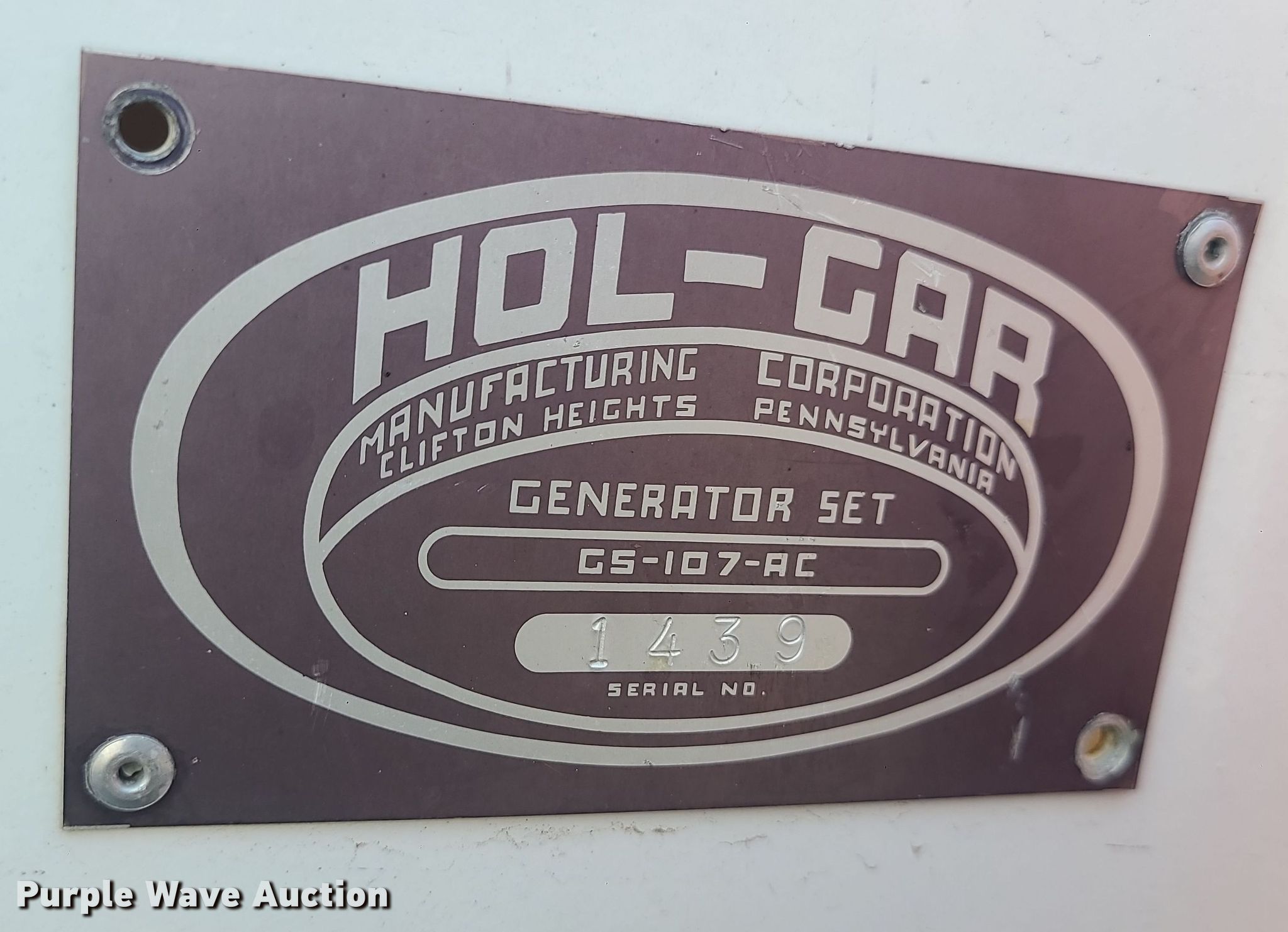 Onan J120-S/967F generator. Serial: 74C770409. Engine Cylinders: 4, Fuel type: Gas, Hand crank start. Features Generator Hol-Gar GS-107-AC, kVA: 12.5, Phase: Single, Three. Trailer 10' L x 60" W, Suspension: Spring, Axles: Single, Tire size: 6-9. This is worksite support equipment and will not come with a title. Transfer of ownership documentation will be a bill of sale. City of Warrensburg. 102 S Holden St. Warrensburg, MO 64019