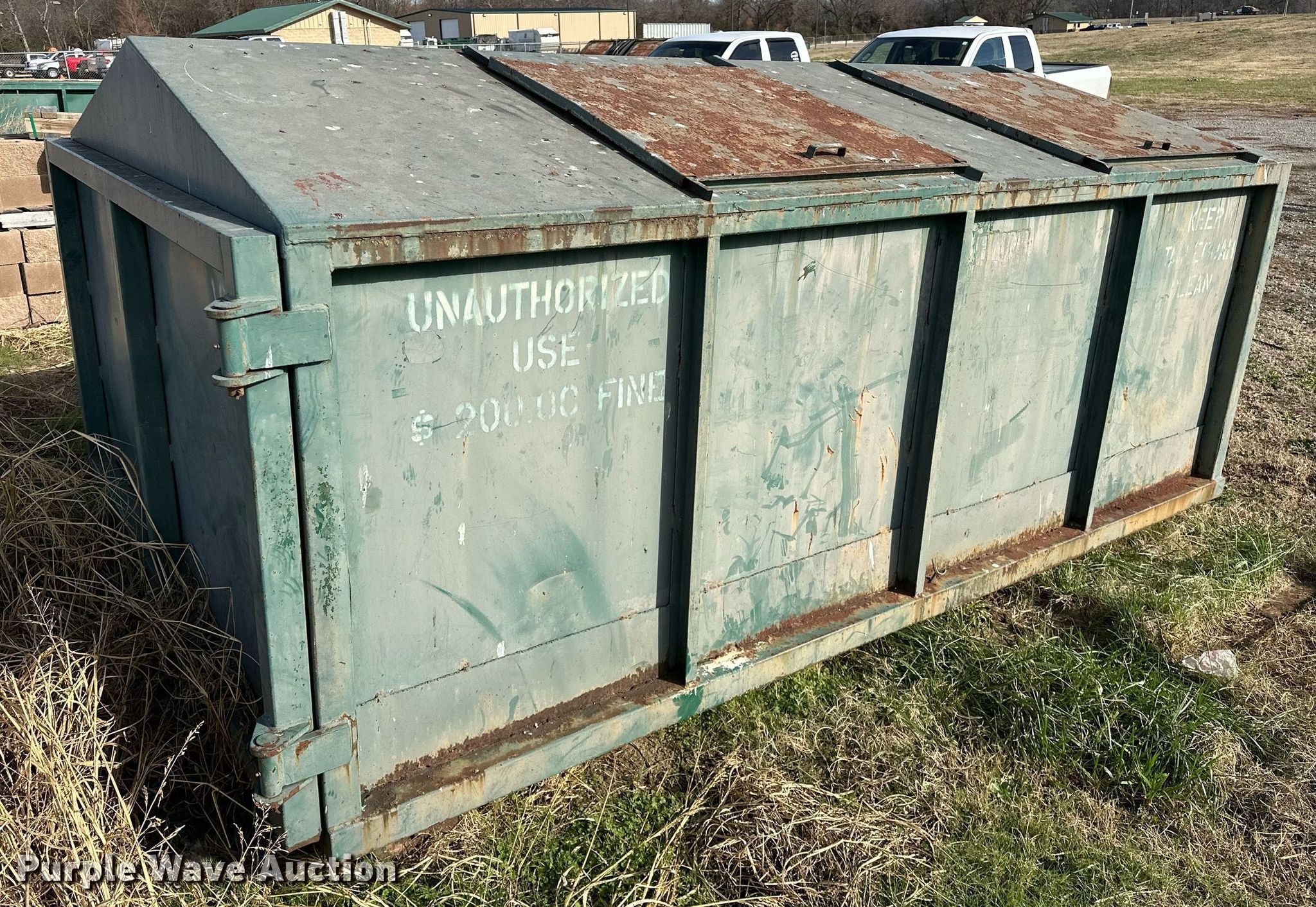 Purple Wave is selling a used Refuse or Compaction Equip. in Oklahoma. This item is a Roll-off dumpster with the following: Capacity: 12 cu. yds., 17'L x 94"W x 64"H