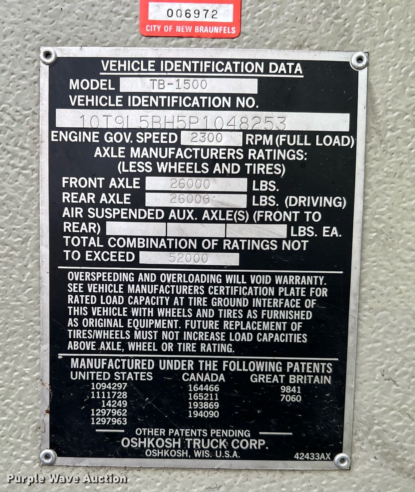 1993 Oshkosh TB 1500 fire truck. Miles: 20,745 on odometer, Hours: 4,035 on meter, VIN: 10T9L5BH5P1048253. Engine Detroit Diesel , Cylinders: 8, Fuel type: Diesel. Transmission Automatic. Chassis Axles: Single, Suspension: Spring, Brakes: Air, GVWR: 52,000 lbs. Interior AC, Heat, Auxiliary controls. Features Fire truck body Hose. Tires Size: 24R21. Notes No batteries, AC compressor belt missing, Unknown operating condition. Texas title. City of New Braunfels. 155 South Water Lane. New Braunfels, TX 78130