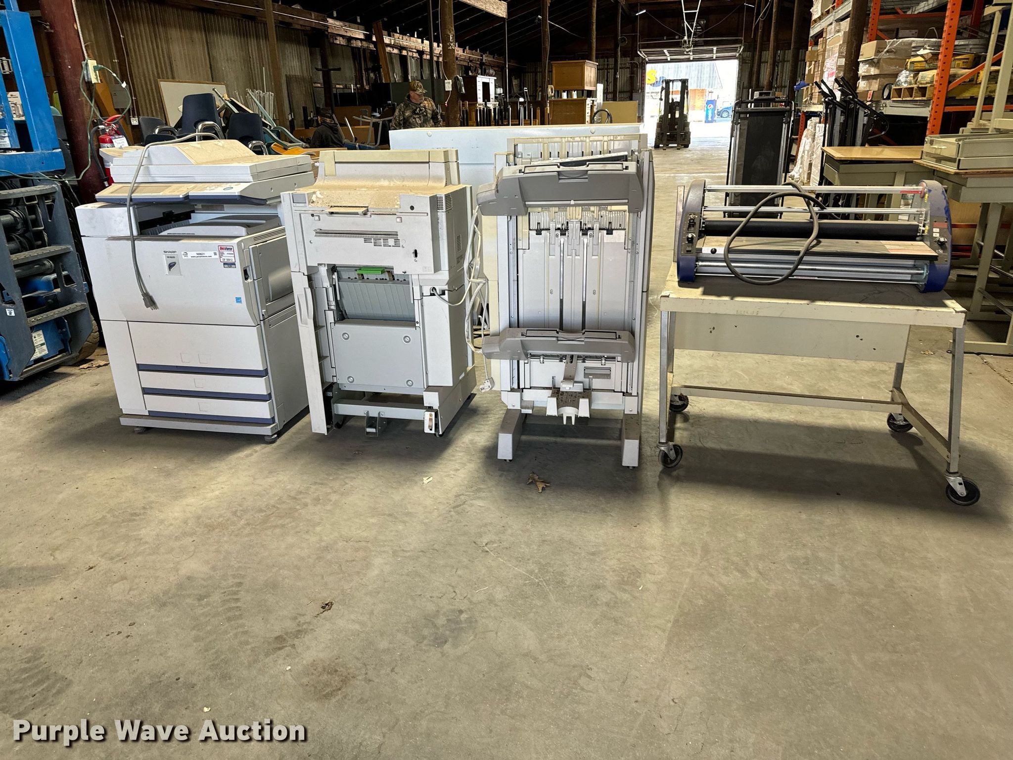 Purple Wave is selling a used Electronics in Kansas. This item is a Office equipment with the following: Sharp MX-M620N digital multi functional system printer, (2) Saddle Stitch Finishers AR-F16, USI Digital Delux 2700 laminator, Rolling cart