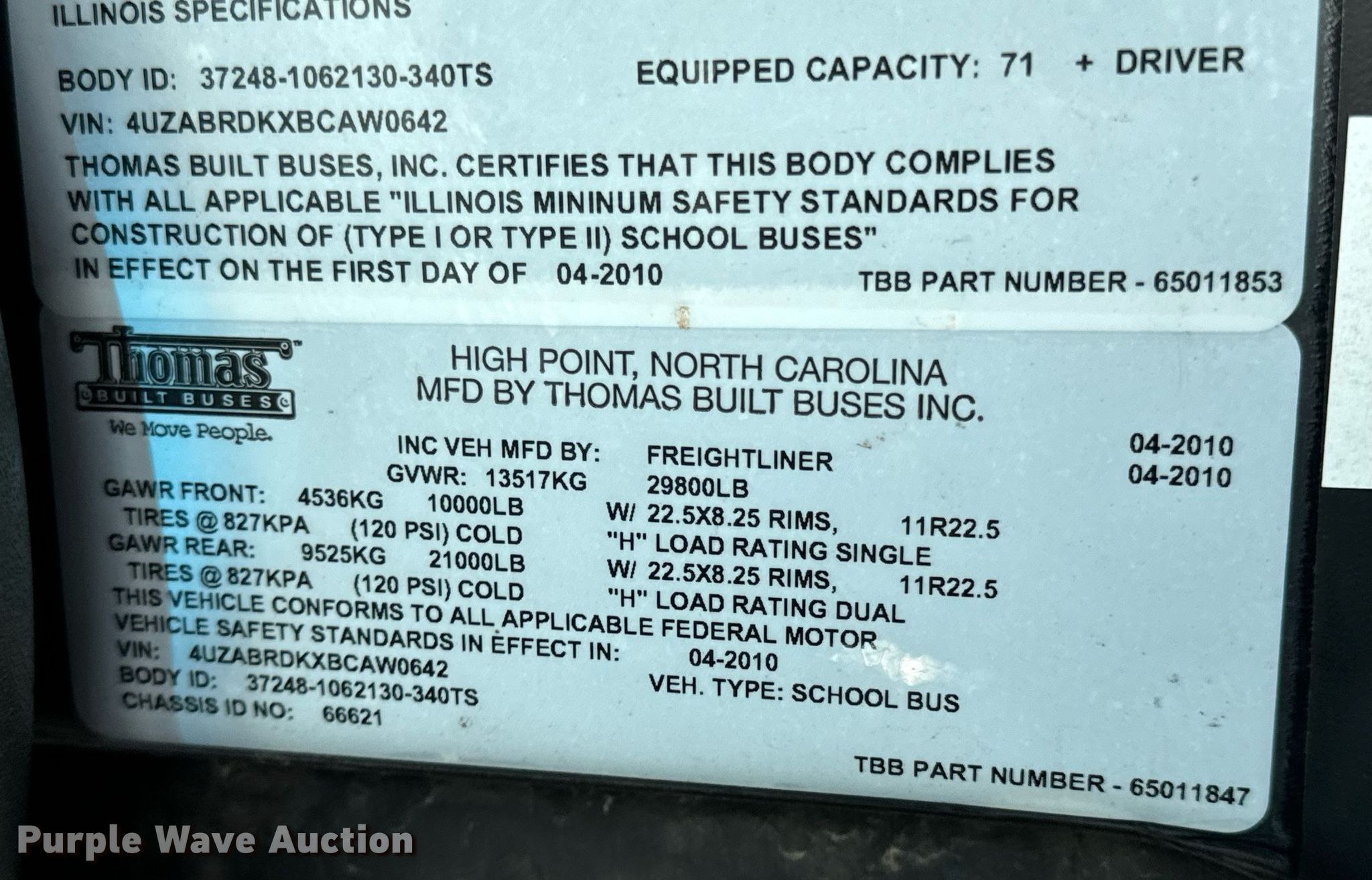 Purple Wave is selling a used Bus in Oklahoma. This item is a 2011 Thomas B2 school bus with the following: Miles: 49,344 on odometer, VIN: 4UZABRDKXBCAW0642, Unit #: 7