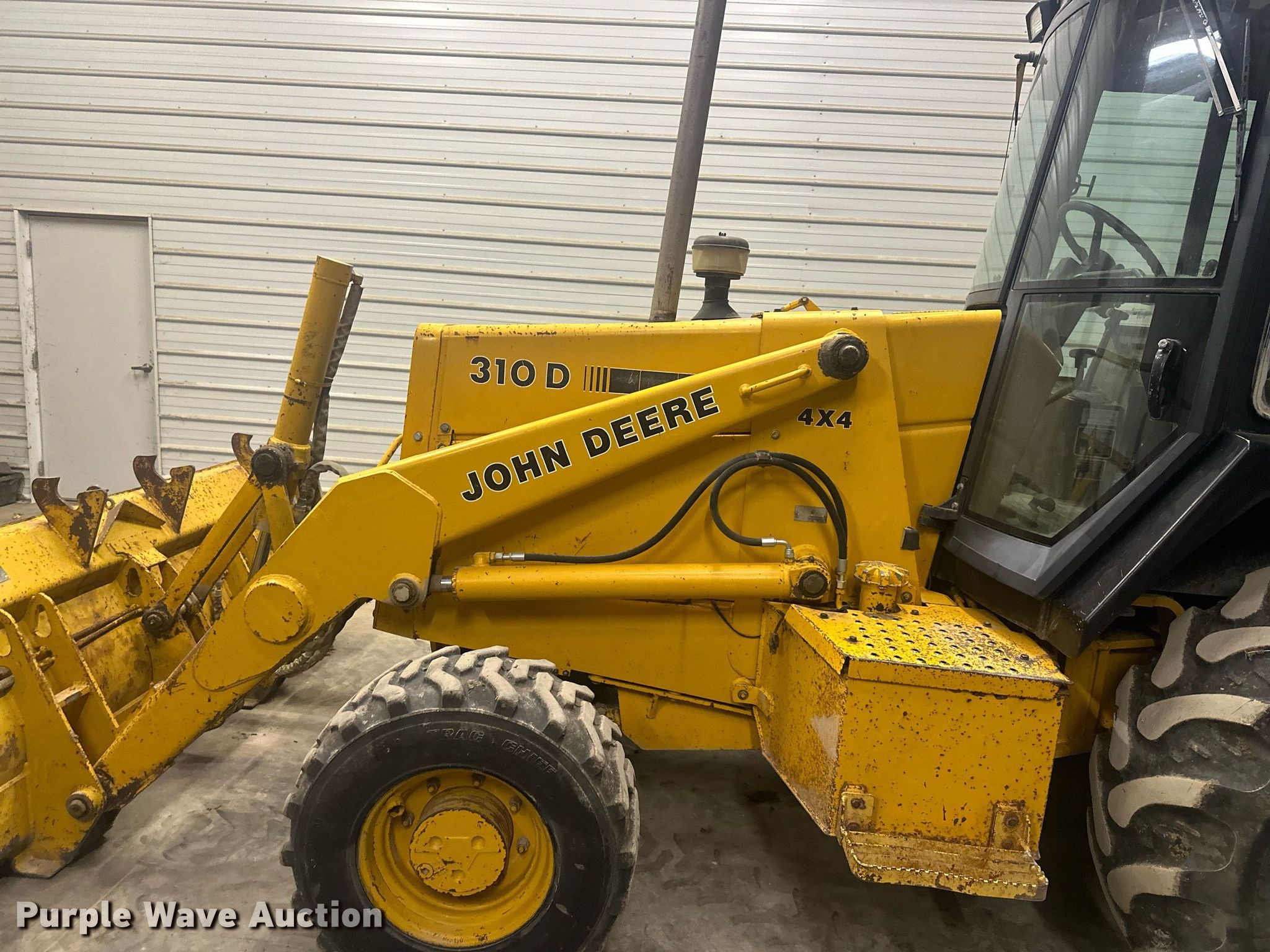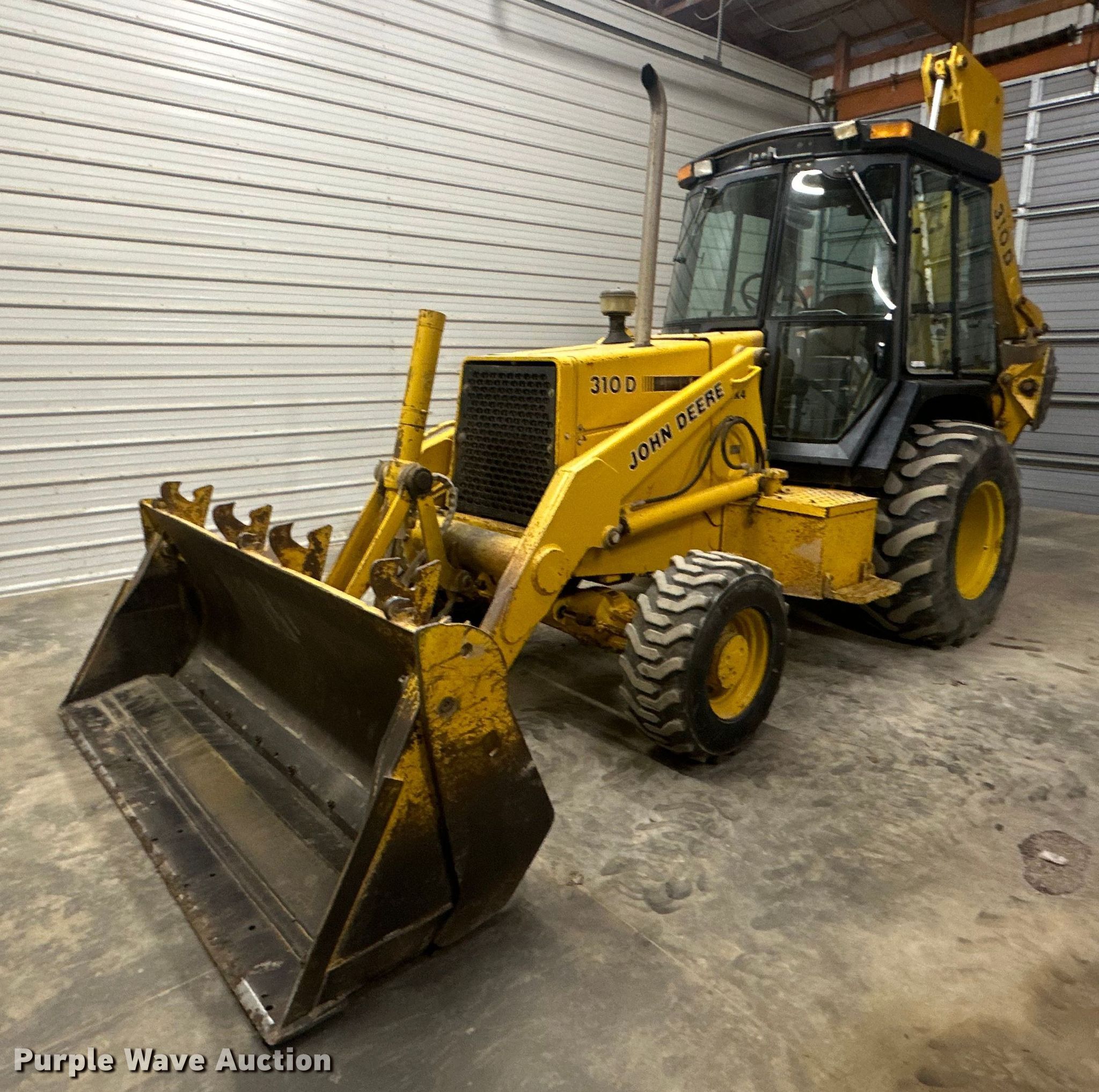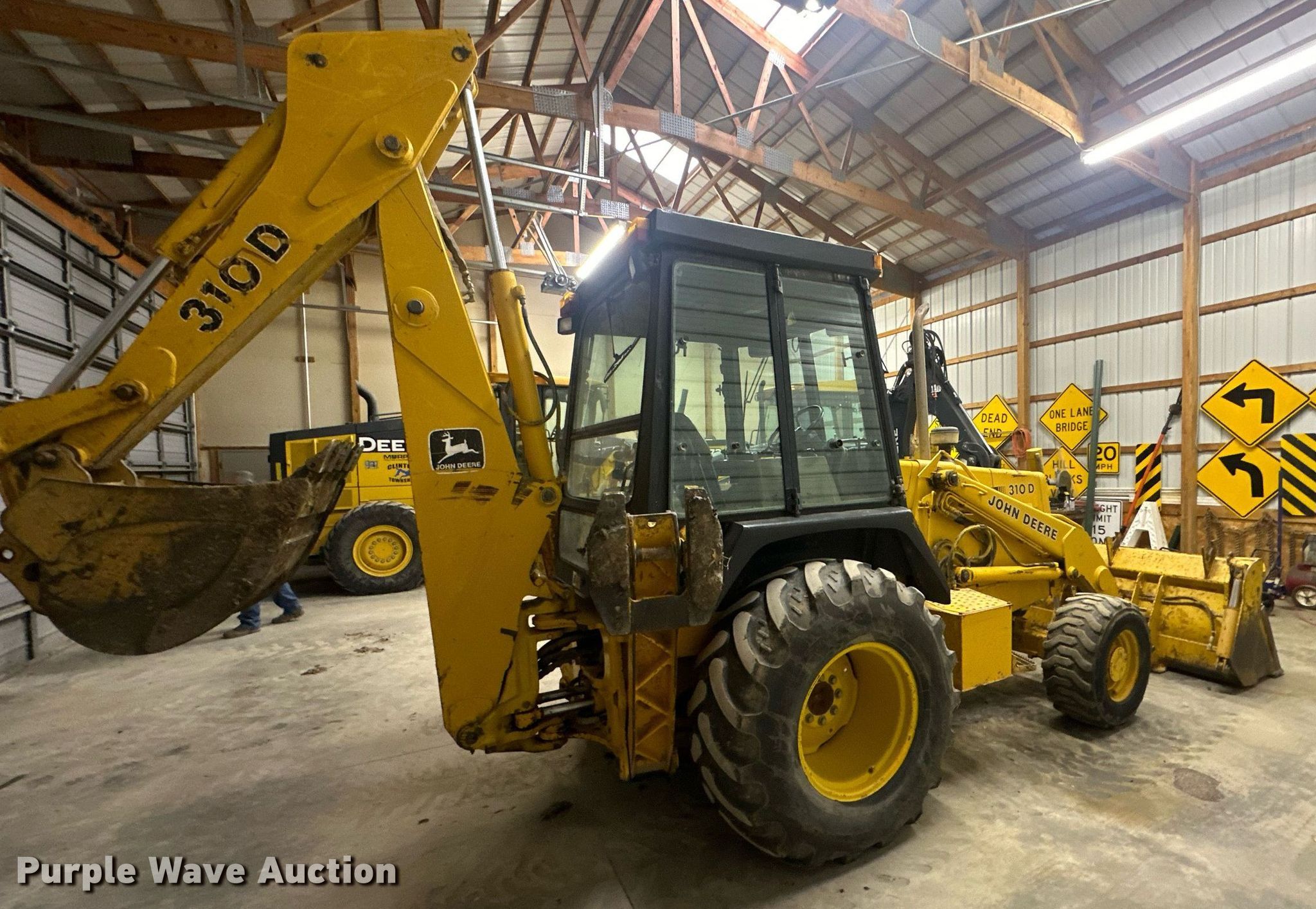 1992 John Deere 310D backhoe. Hours: 6,745 on meter, Serial: T0310DF780345. Engine John Deere 4039D, Displacement: 3.9L, Cylinders: 4, Fuel type: Diesel. Transmission Shuttle shift, 4F - 4R. Chassis Four wheel drive. Operators station Enclosed cab, Heat, Backhoe controls: Wobble stick / two stick. Features Loader Auxiliary hydraulics, Bucket Four-in-one, Width: 92", Backhoe Width: 24", Teeth: 5. Tires Front: 12x16.5, Rear: 19.5L-24. Clinton Township. 1177 E 604th Rd. Lawrence, KS 66047