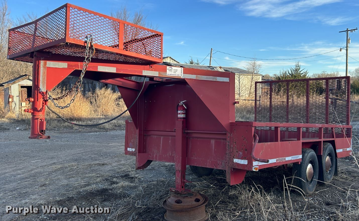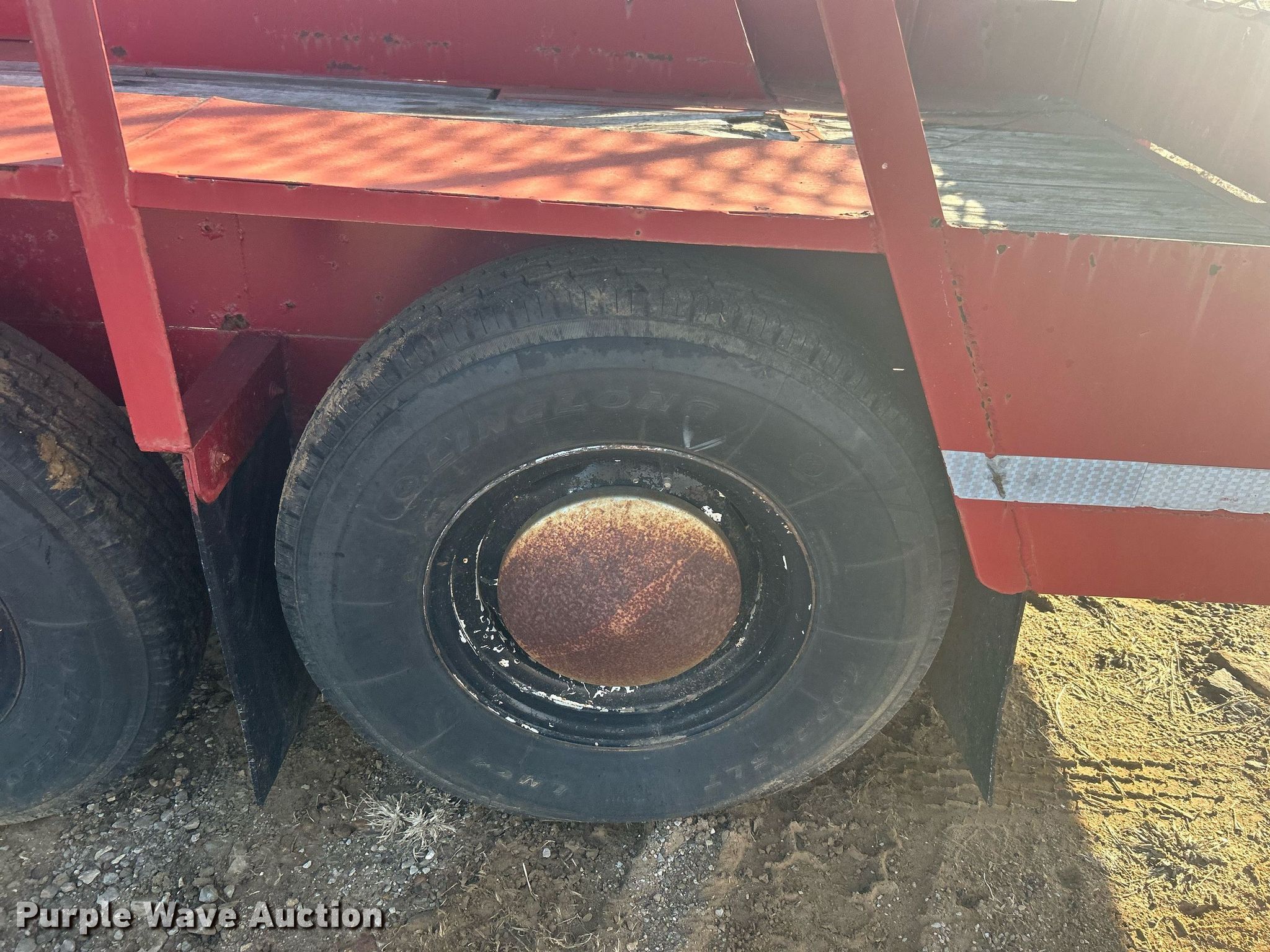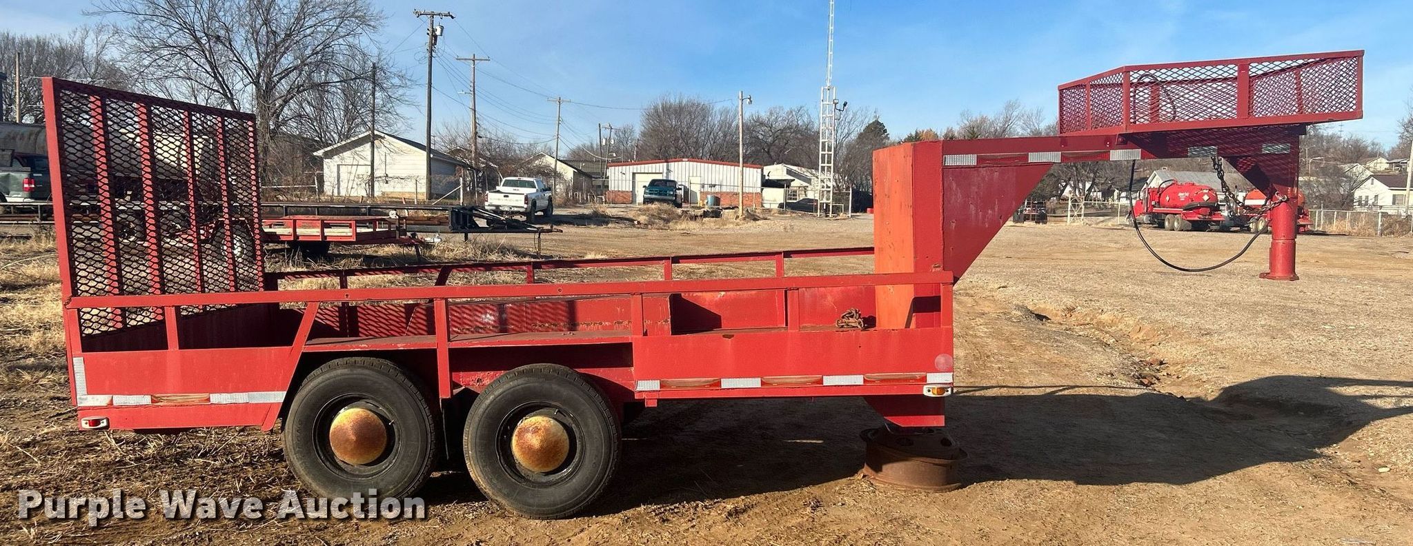 Shop built equipment trailer. Dimensions. Overall: 20' L x 90" W, Deck: 13' 4" L x 66" W, Side height: 19", Ramps: Manual Length: 5'. Features Deck type: Wood. Chassis Hitch: Gooseneck, Landing gear: Single, Suspension: Spring, Brakes: Electric, Axles: Tandem. Tires Size: 7.00-R15LT. Transfer of ownership documentation will be a bill of sale. 902 Smathers Avenue. Drumright, OK 74030