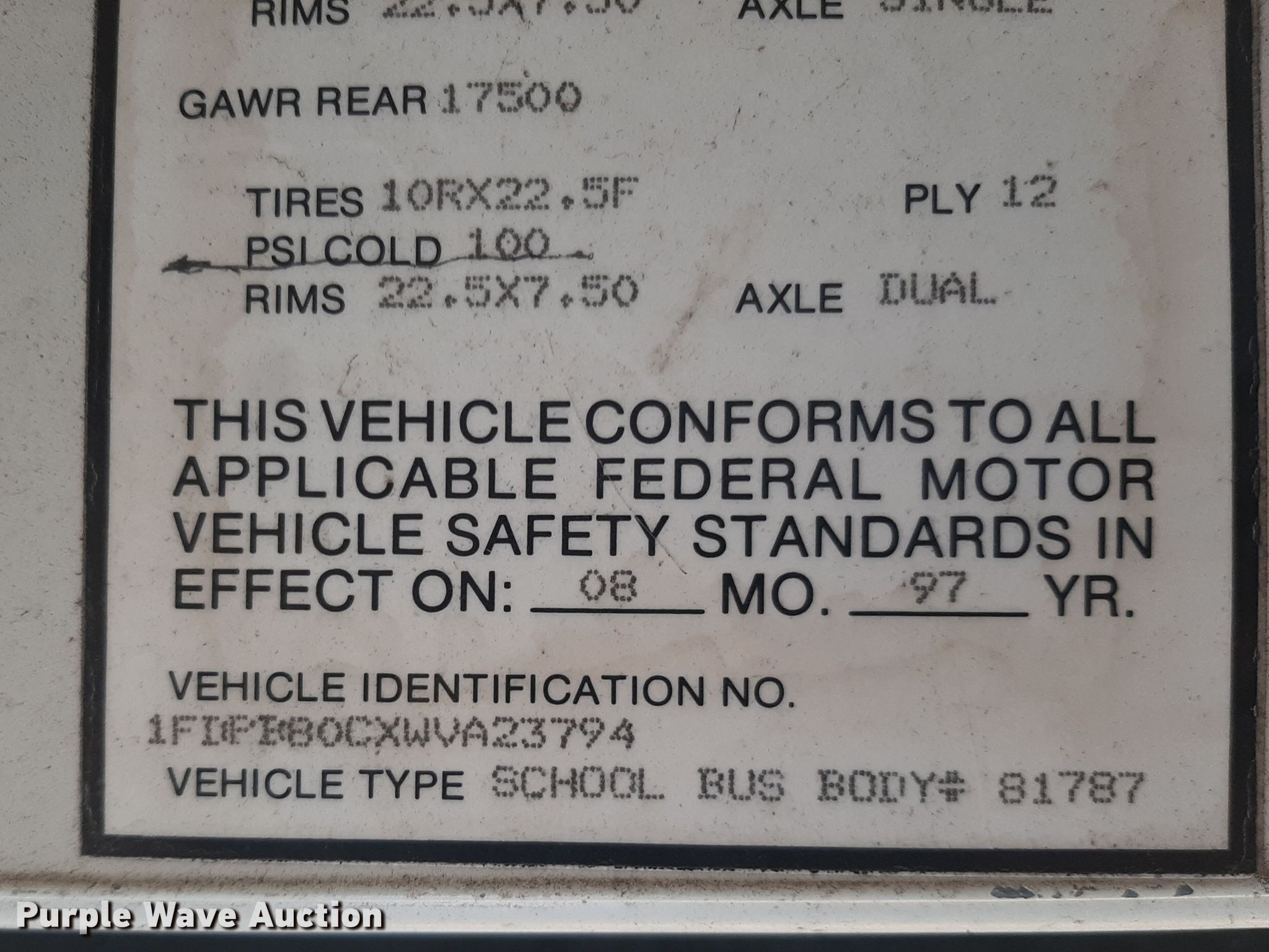 Purple Wave is selling a used Bus in Kansas. This item is a 1998 Ford school bus with the following: Miles: 171,301 on odometer, VIN: 1FDPB80CXWVA23794