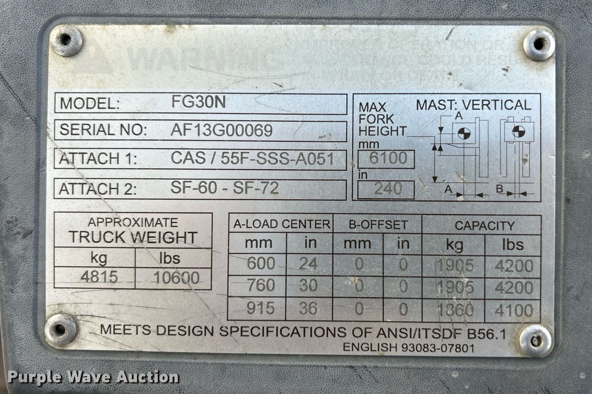 Purple Wave is selling a used Warehouse Forklift in Iowa. This item is a 2014 Mitsubishi FG30N forklift with the following: Hours: 3,050 on meter, Miles or hours may vary, unit still in use, Serial: AF13G00069