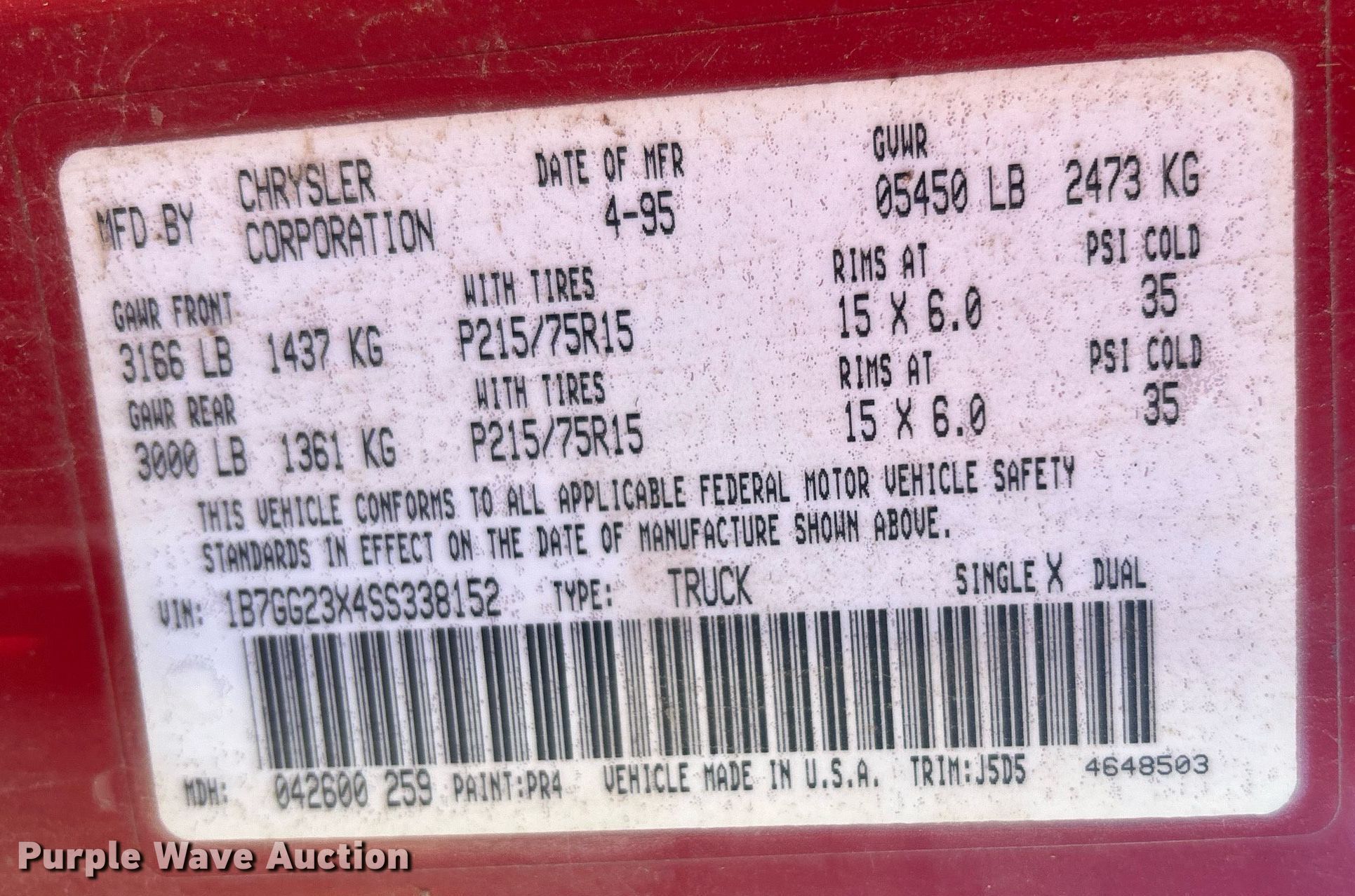 - VIN: 1B7GG23X4SS338152