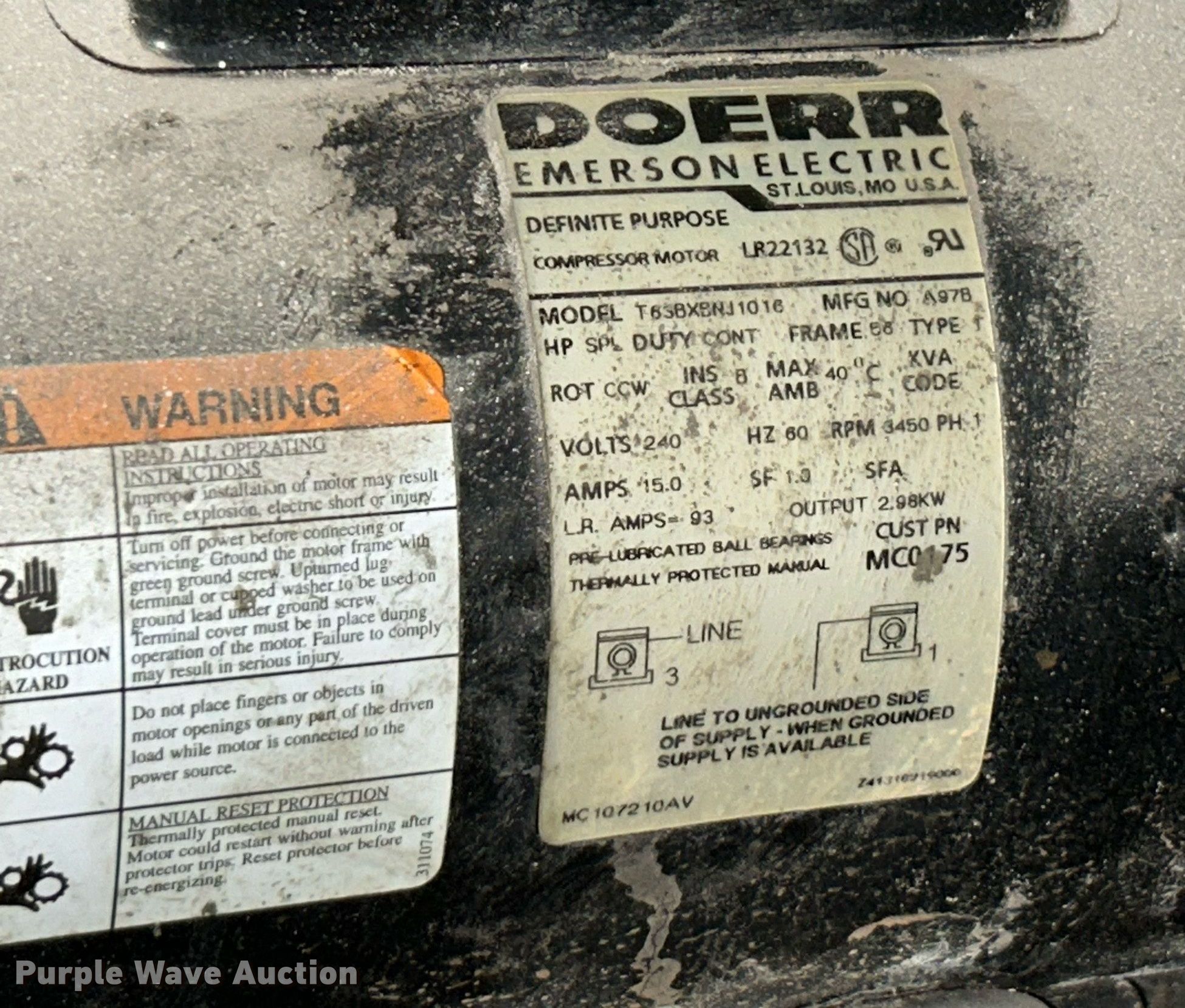 Campbell Hausfeld VT627501AJ air compressor. Serial: 02643. Electric Motor Doerr T63BXBNJ1016, kW: 2.98, Volts: 240, Phase: Single. Features Air compressor Tank capacity: 60 gallons. Brandonview LLC. St. Louis, MO 63104