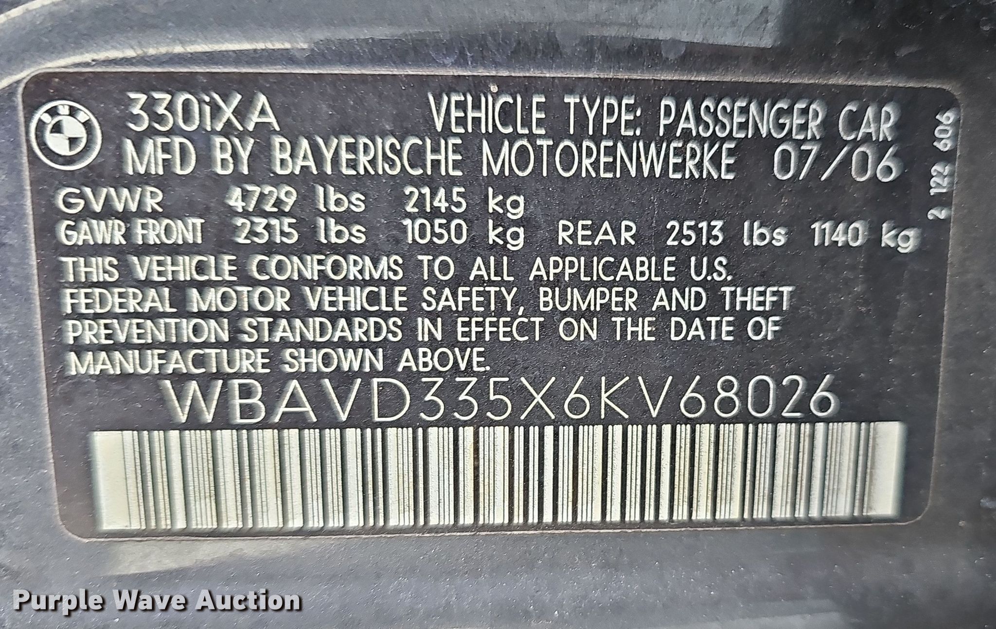 Purple Wave is selling a used Passenger Vehicle in Arkansas. This item is a 2006 BMW 330xi with the following: Miles: 99,152 on odometer, VIN: WBAVD335X6KV68026