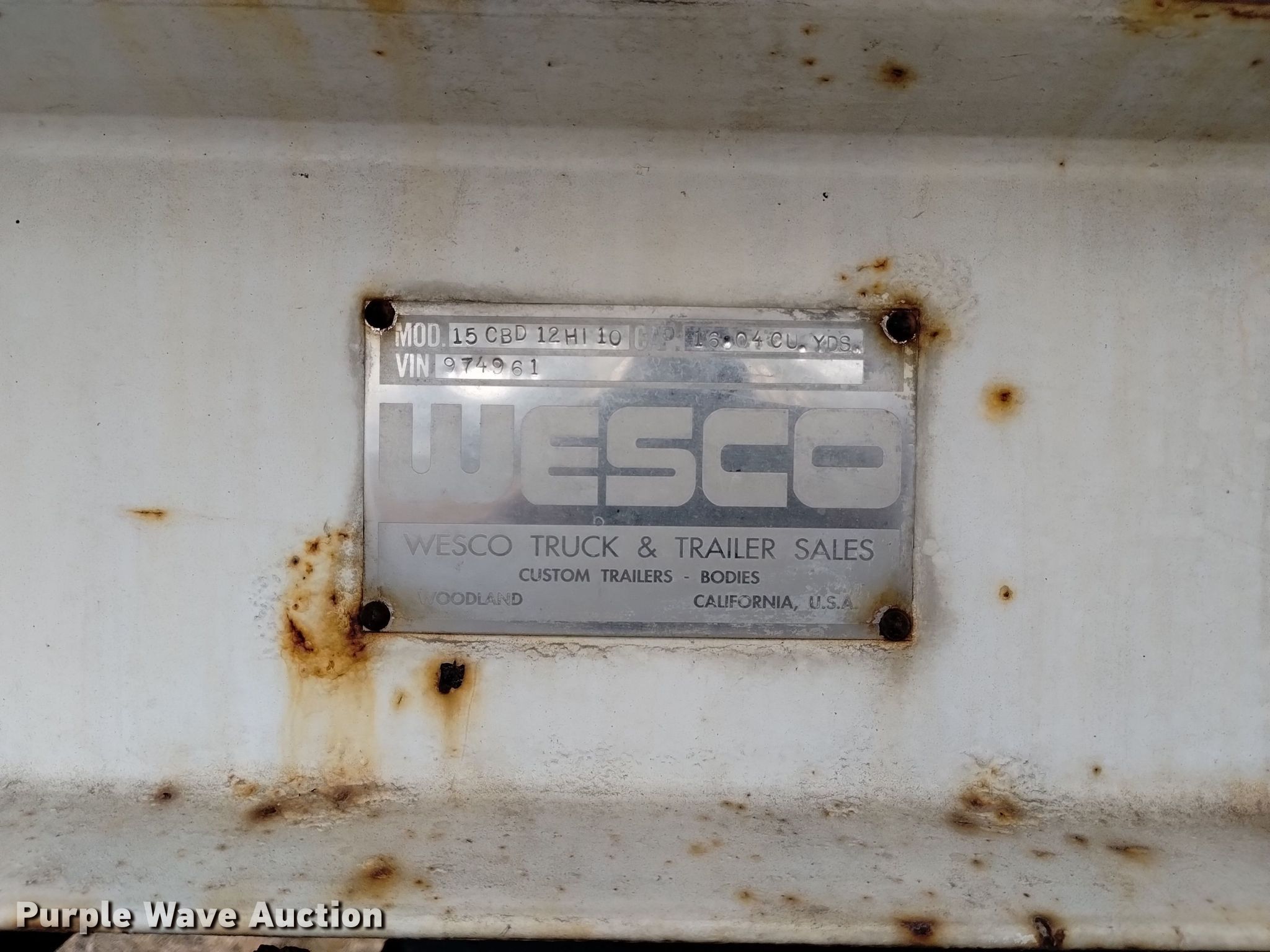 1986 Wesco 863026 transfer trailer. VIN: 1WRFH3280GW863026. Dimensions Overall: 36' 6" L x 96" W, Body: 15' L x 83" W, Side height: 55". Features Cu. yd. capacity: 16.04, Body type: Steel, End gate: Air operated, Trailer controls. Chassis Hitch: Pintle, Suspension: Spring, Brakes: Air, Axles: Tandem. Tires Aluminum wheels, Size: 11R22.5. Nebraska title. Title distribution may be delayed up to 14 days from verification of funds. 4-D Trenching. 704 West P Street. Ogallala, NE 69153