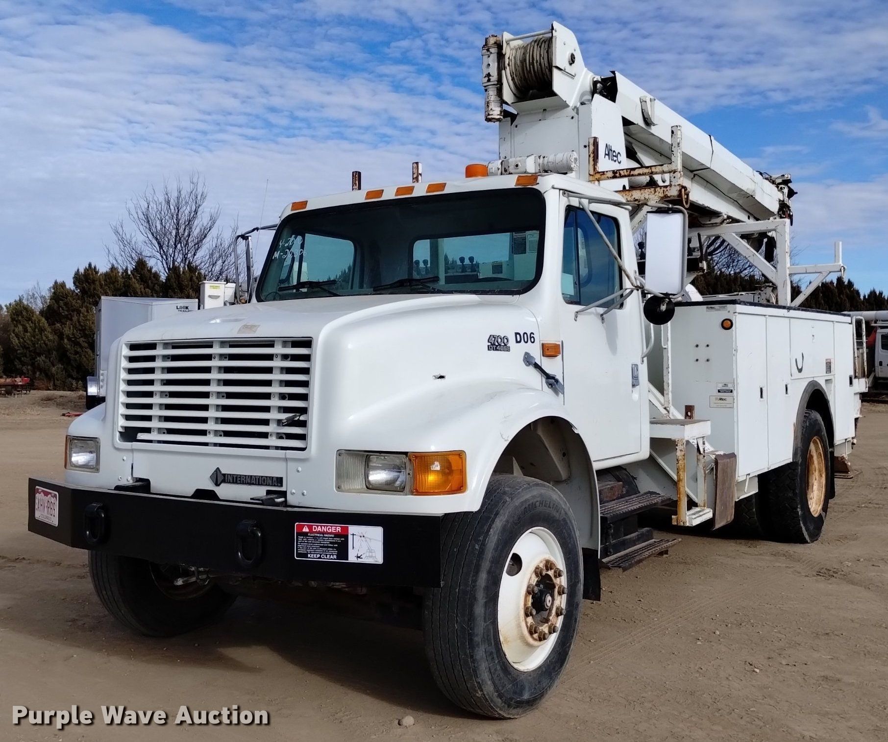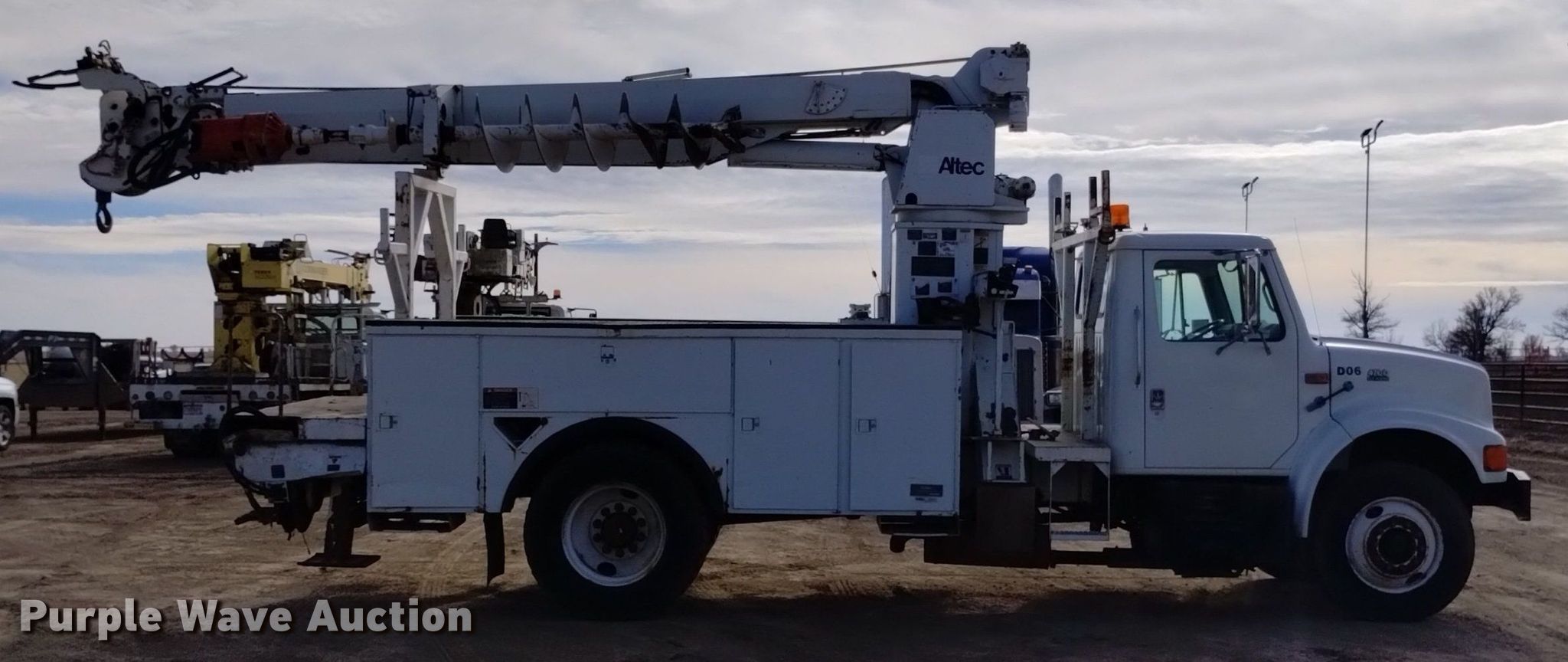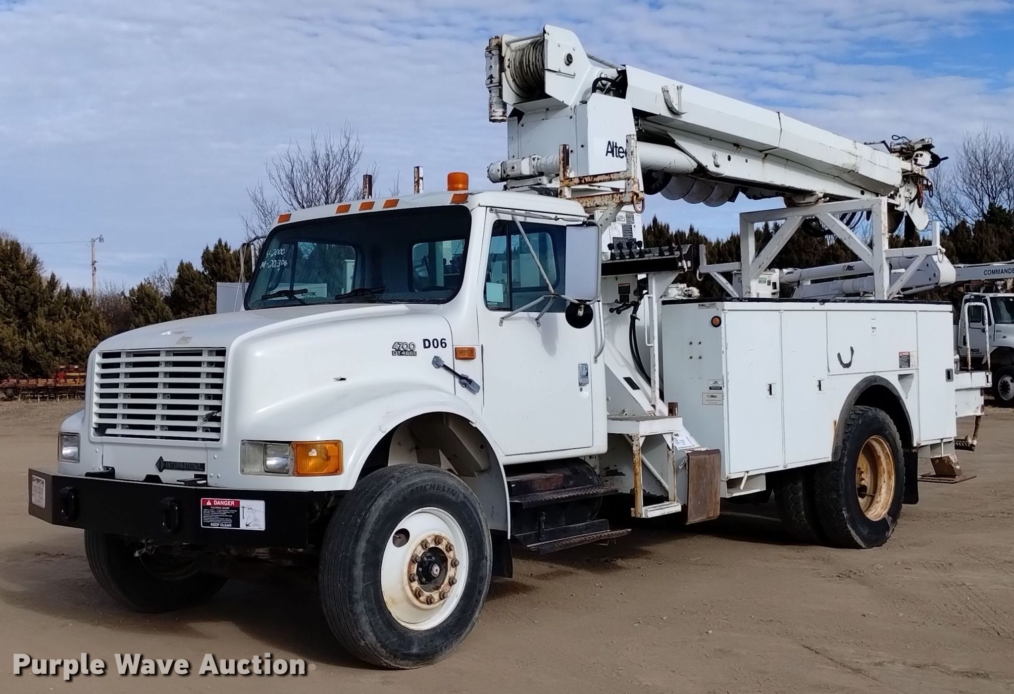 2000 International 4700 digger derrick truck. Miles: 20,532 on odometer, Hours: 3,121 on meter, VIN: 1HTSCAAR3YH277616, Unit #: D06. Engine International DT466, Displacement: 7.6L, Cylinders: 6, Fuel type: Diesel. Transmission Spicer Double Duty D, Manual, Speed: 5, plus 2. Chassis Axles: Single, Suspension: Spring, Brakes: Air, PTO, GVWR: 35,000 lbs, Wheelbase: 188". Interior AC, Heat, Cruise control, Brake controller. Features Bed Altec, Serial: 17-58904, 15' L x 93" W, Boom Altec D945 TB, Serial: 1299BA2073, Boom length: 30', Maximum lift capacity: 19,400 lbs, Boom type: Insulated, Telescopic, Boom controls Platform/ basket, Material handler, Pole guide, Auger Diameter: 22".. Tires Front: 275/80R22.5, Rear: 11R24.5. Notes Clutch issues, Auger issue, flighting bent. Colorado title. Title distribution may be delayed up to 14 days from verification of funds. Stampede Power Line Services. 35074 Cr SS. Wiley, CO 81092