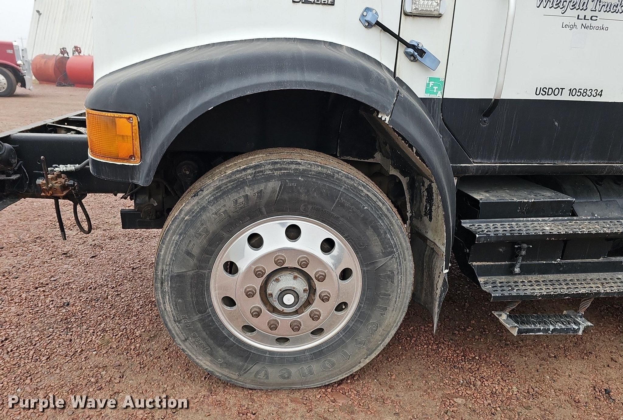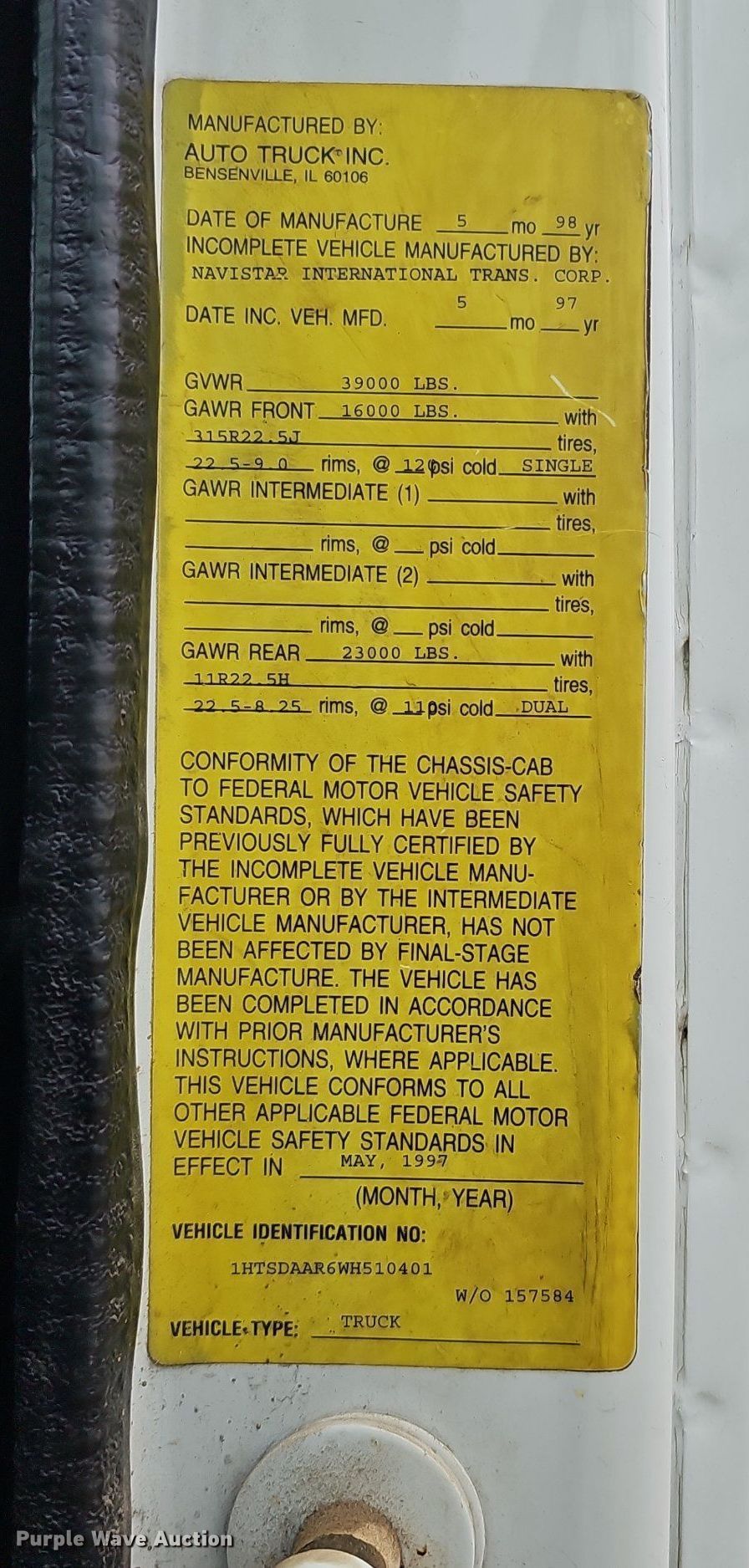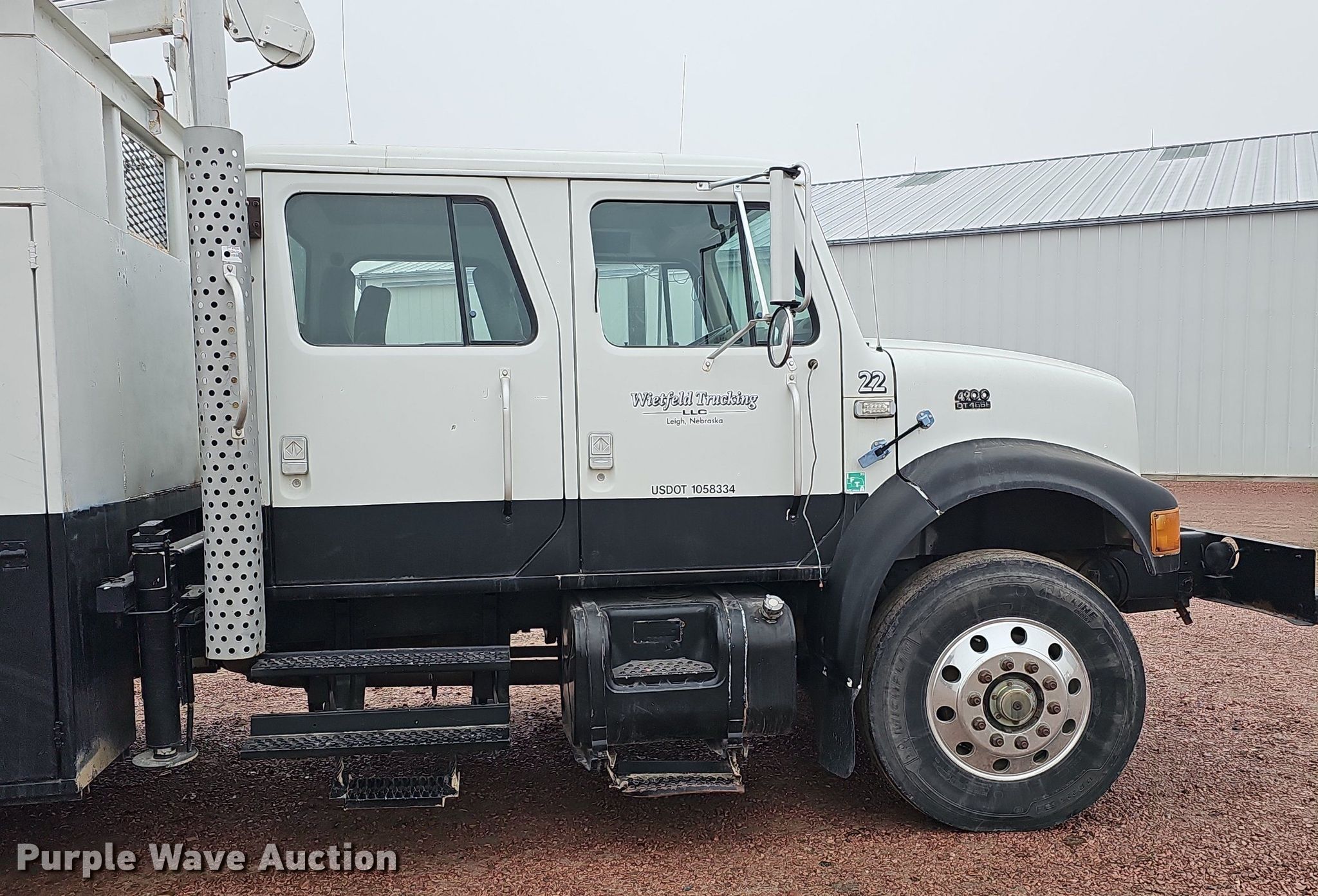 1998 International 4900 utility / service truck. Miles: 171,636 on odometer, Hours: 12,758 on meter, VIN: 1HTSDAAR6WH510401. Engine International DT466E, Displacement: 7.6L, Cylinders: 6, Fuel type: Diesel. Transmission Eaton Fuller, Manual, Speed: 10. Chassis Axles: Single, Suspension: Spring, Brakes: Air, PTO, GVWR: 39,000 lbs, Wheelbase: 240". Interior AC, Heat, Cruise control, Auxiliary controls, Brake controller. Features Bed 15' L x 97" W, Torch bottle rack, Crane Iowa Mold Tooling5016, Maximum boom length: 20' Maximum lift capacity: 8,600 lbs, Front mounted PTO. Tires Size: 11R22.5, Brand: Firestone. Notes AC belt missing. Nebraska title. Title distribution may be delayed up to 14 days from verification of funds. Wietfeld Trucking. 2172 Road 1A. Leigh, NE 68643