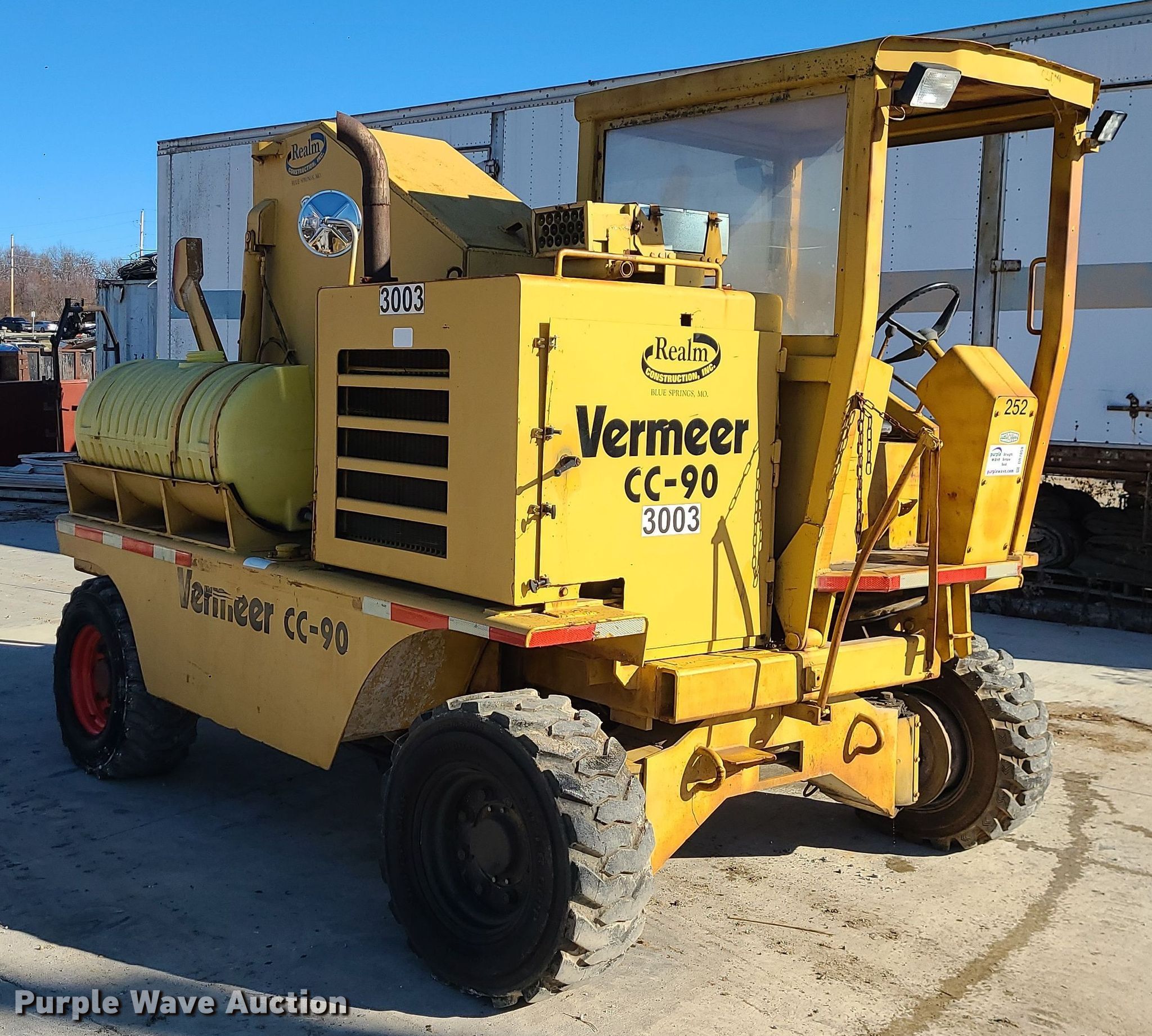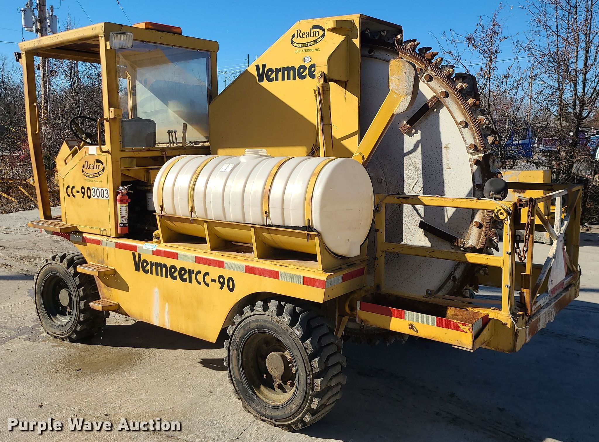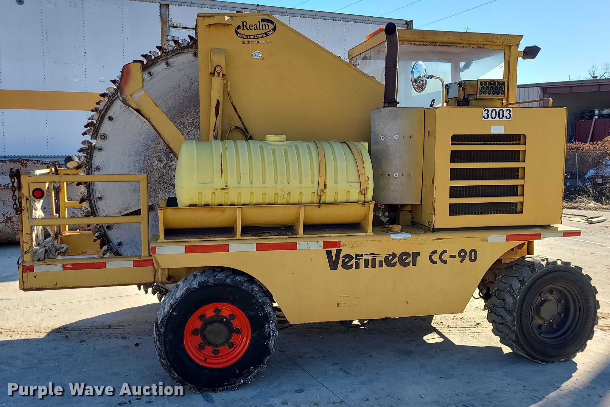 1985 Vermeer CC-90 rock saw. Hours: 3,089 on meter, Serial: 1VRF122N4F1000131. Engine Detroit Diesel , Cylinders: 3, Fuel type: Diesel. Transmission Hydrostatic. Operators station Canopy. Features Rock wheel Wheel diameter: 84", Cutting width: 4". Tires Size: 12-16.5. Realm Construction, Inc.. 604 SE Industrial Dr. Blue Springs, MO 64014